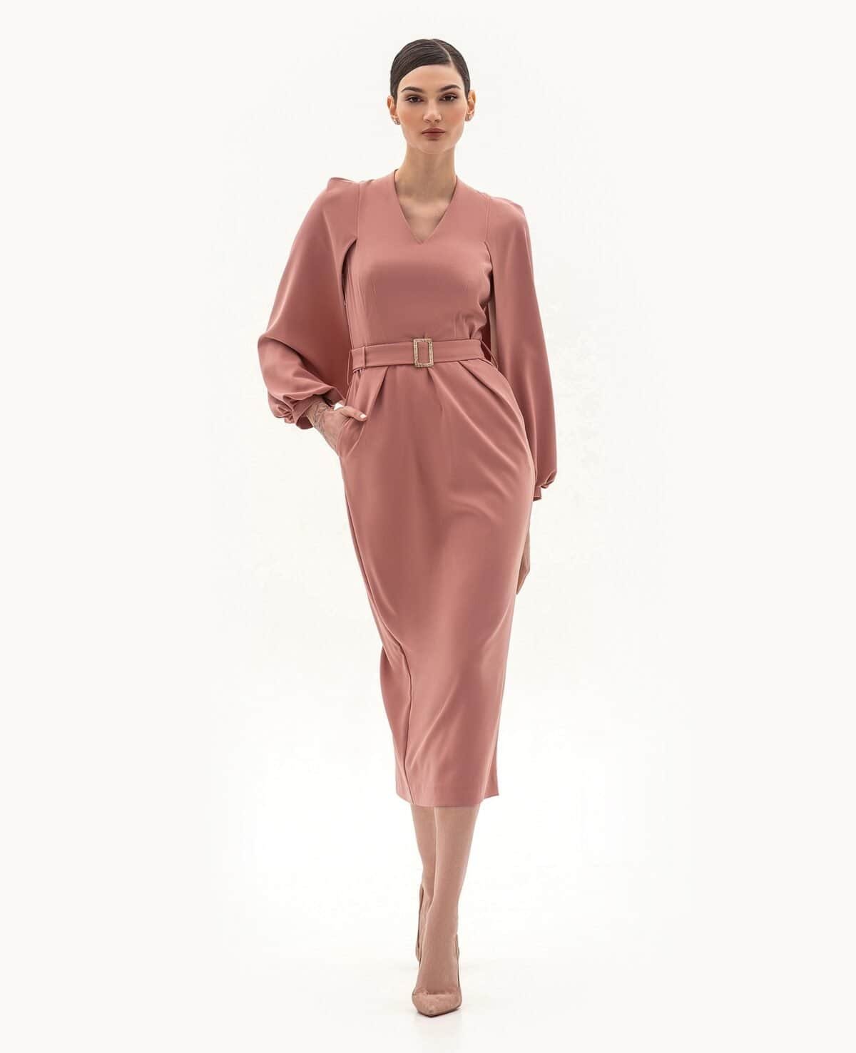 Product type: a straight dress with a waistline and pleats for a distinctive silhouette. The dress features accentuated, cuffed sleeves and a detachable belt with a metal buckle.