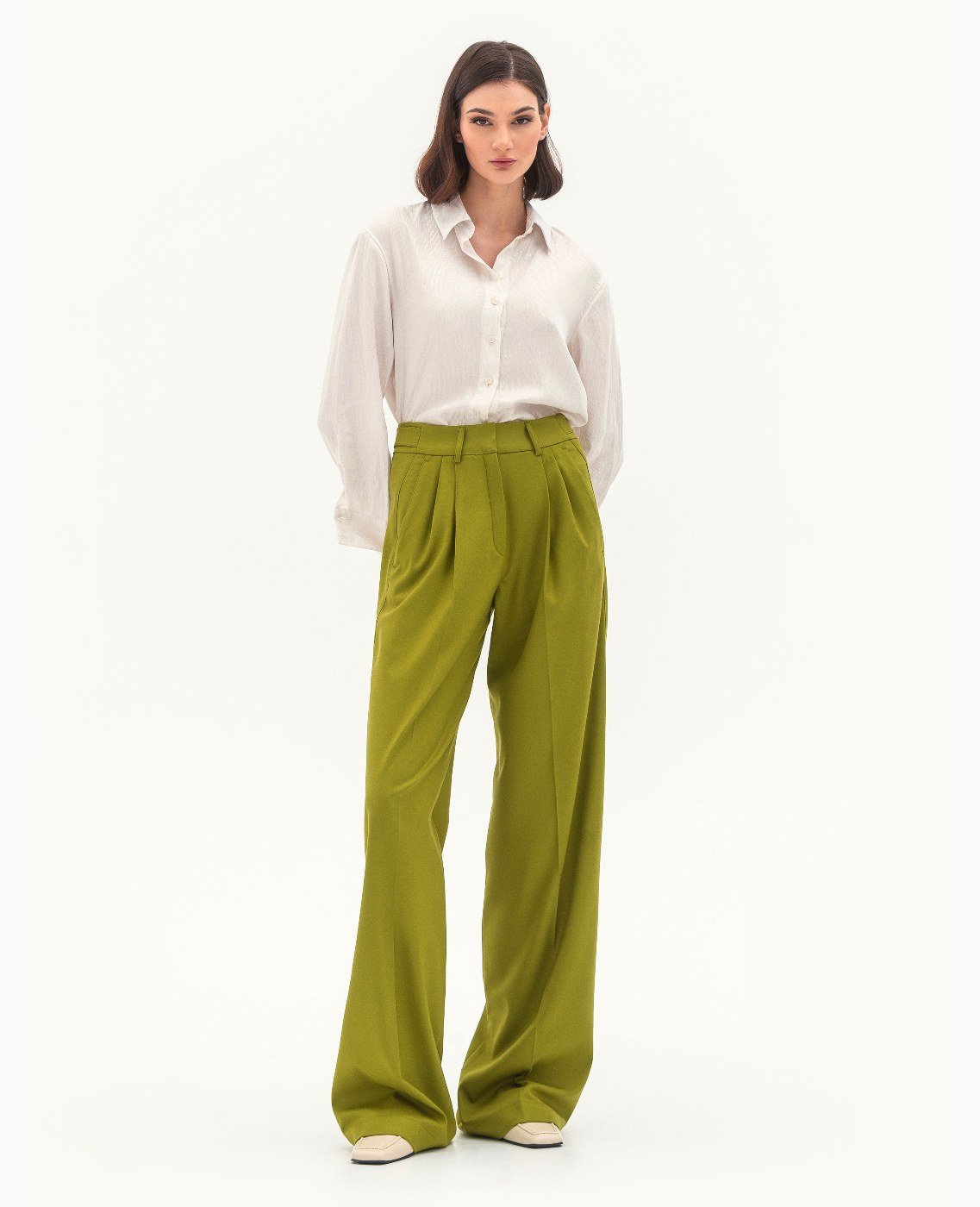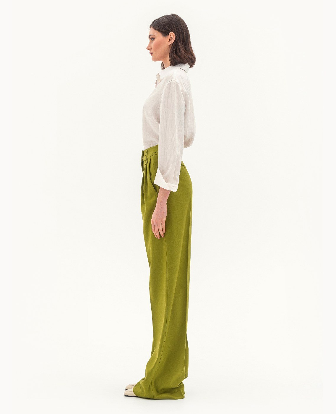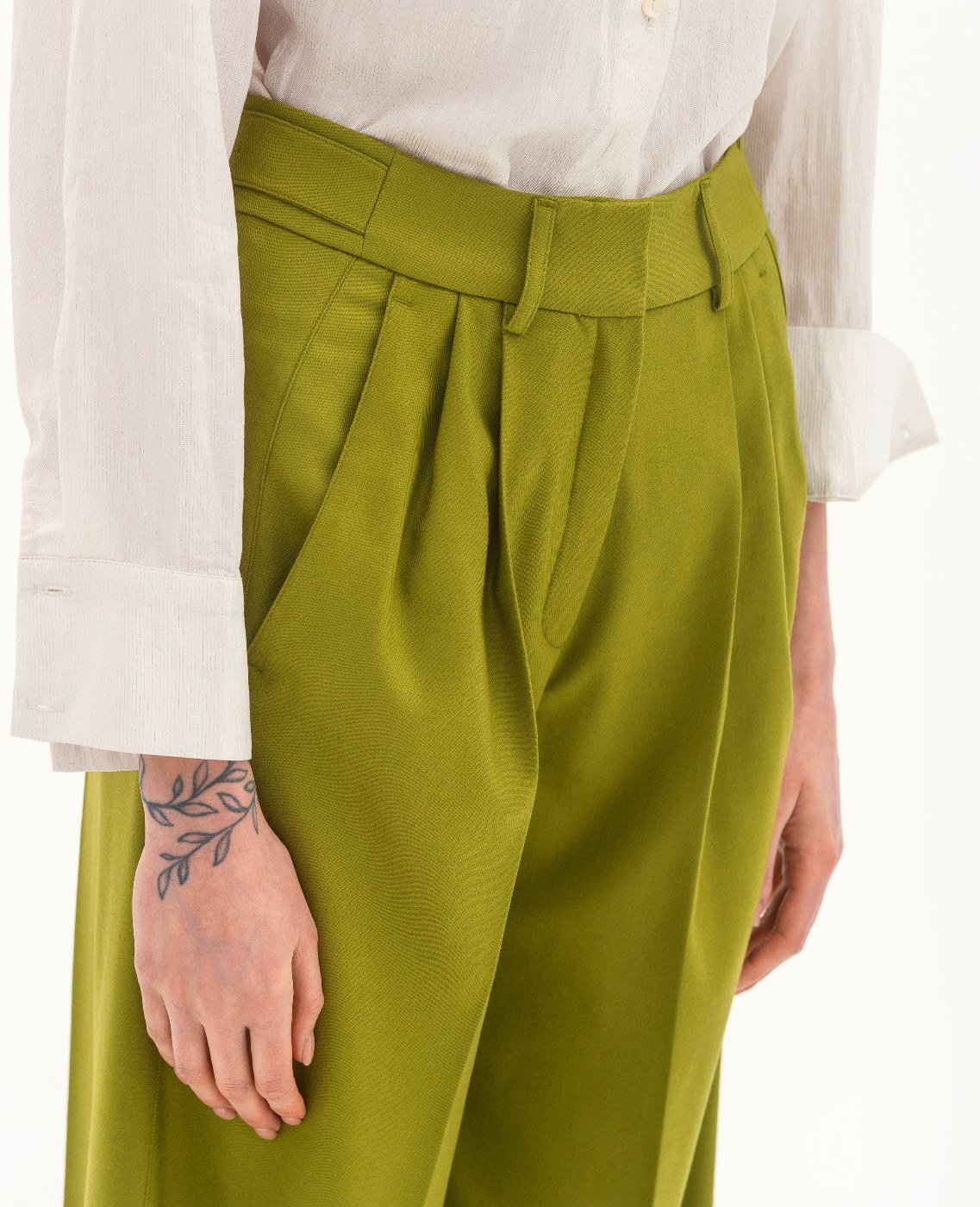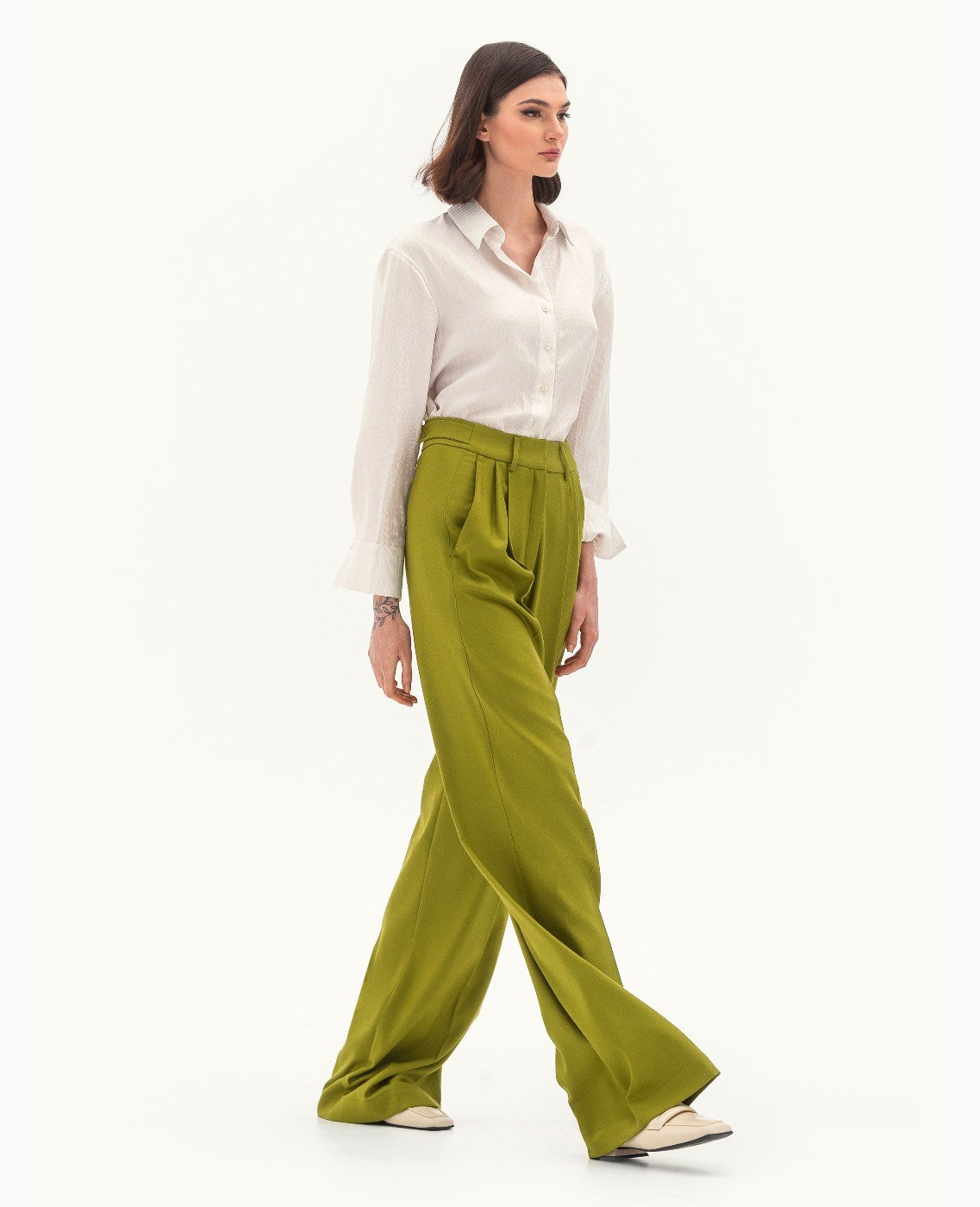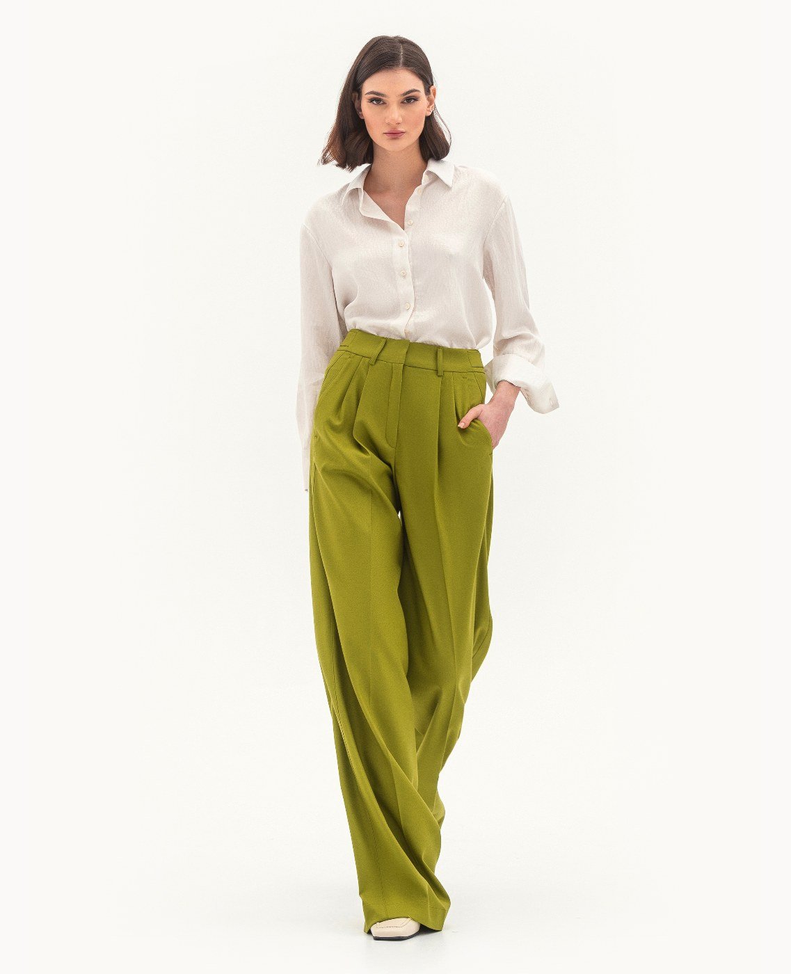 Вид изделия: брюки свободного кроя, со складами, с регулировкой обьема талии. Посадка по линии талии: средняя. Плотность и вид ткани: средней плотности текстильный материал с добавлением эластана. Вид застежки: молния, крючки, пуговица. Н Наличие и вид карманов: подкройные. Уход за изделием: Деликатная, быстрая, ручная стирка при 30 градусах, без использования агрессивных моющих средств. Размер изделия на фото: UA 40; еur 34; USA 2; INT XXS. Параметры модели на фотографии: Рост: 179см, ОГ — 89см, ОТ — 60см, ОБ — 89см.