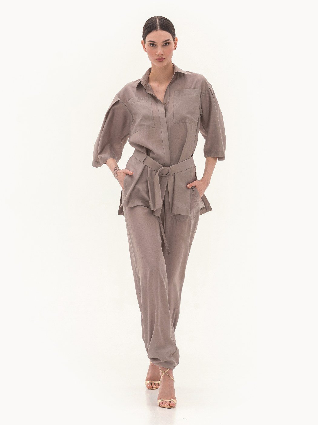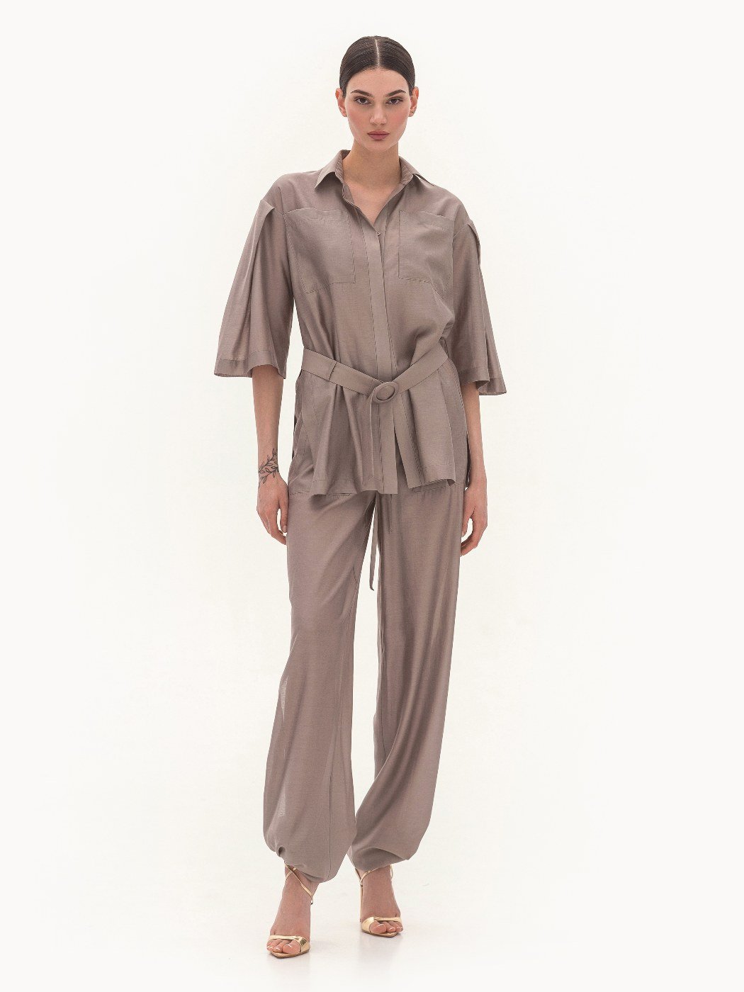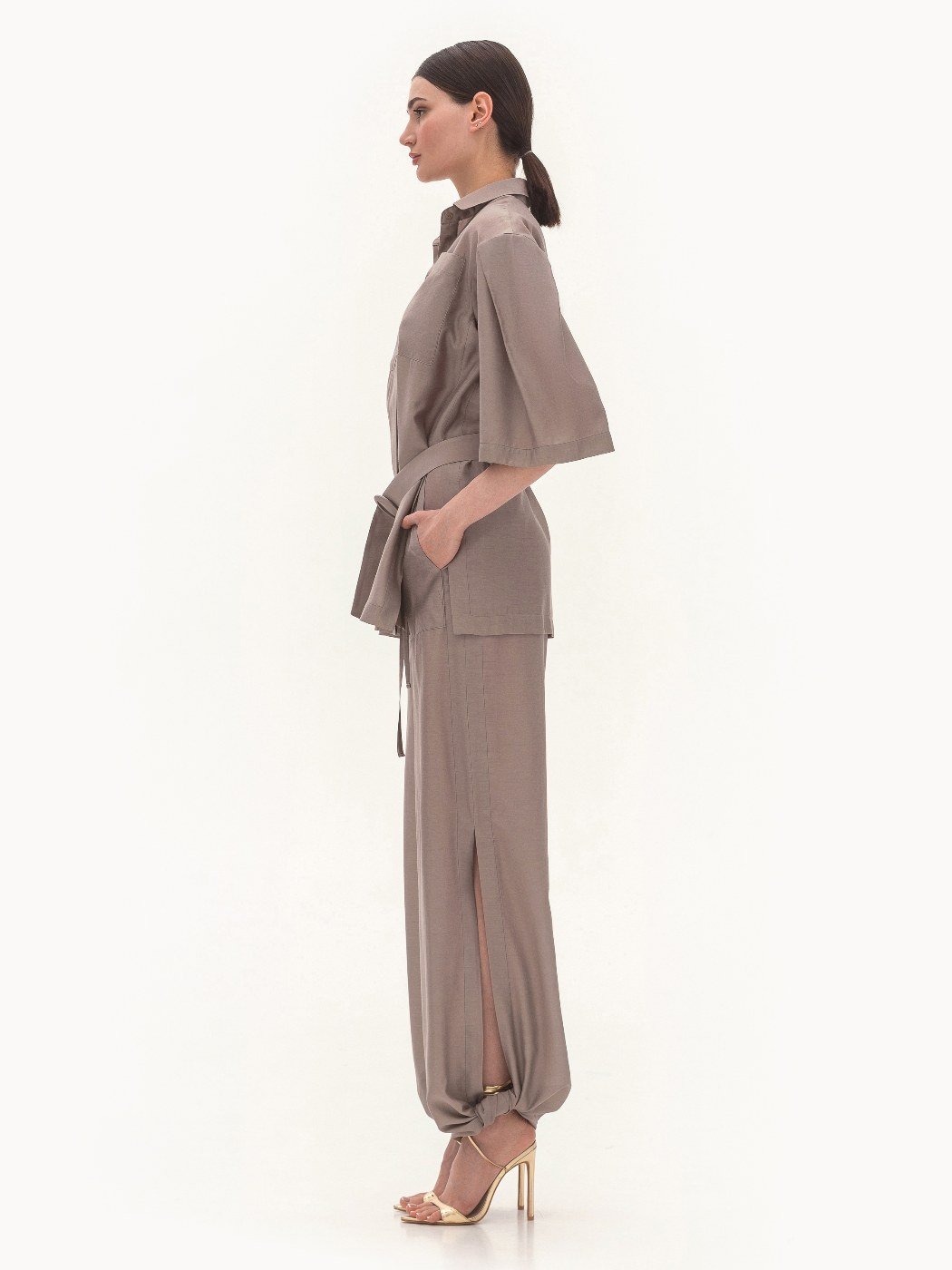 Вид изделия: брючный комплект с блузоном и поясом на пряжке. Силуэт, длина: свободный. Посадка по линии талии: классическая. Плотность и вид ткани: тонкий материал. Вид застежки: суппатная застежка на пуговицах. Наличие и вид карманов: настрочные. Вид рукава: полуреглан. Уход за изделием: Деликатная, быстрая, ручная стирка при 30 градусах, без использования агрессивных моющих средств. Размер изделия на фото: UA 40; еur 34; USA 2; INT XXS. Параметры модели на фотографии: Рост: 179см, ОГ — 89см, ОТ — 60см, ОБ — 89см.