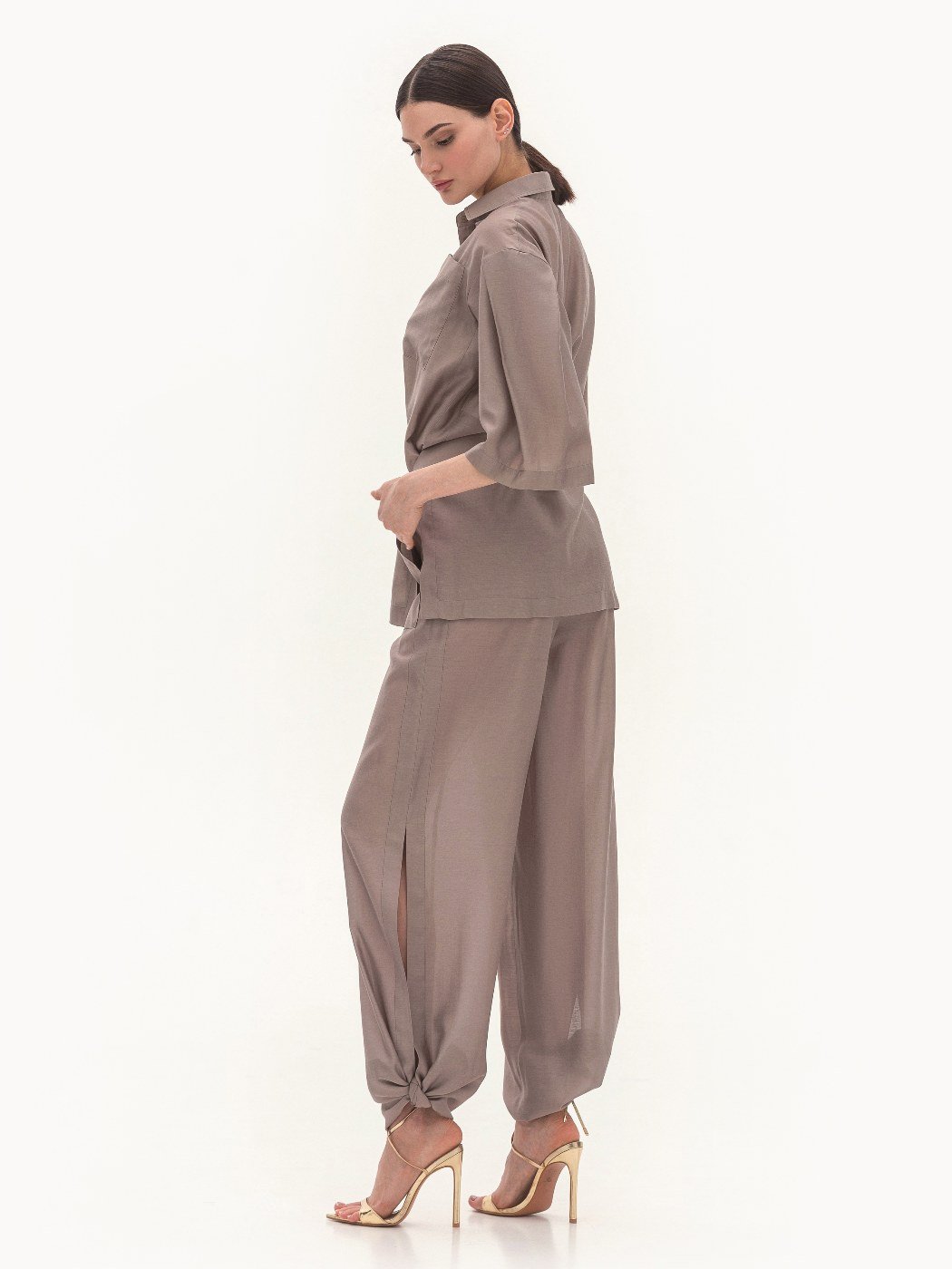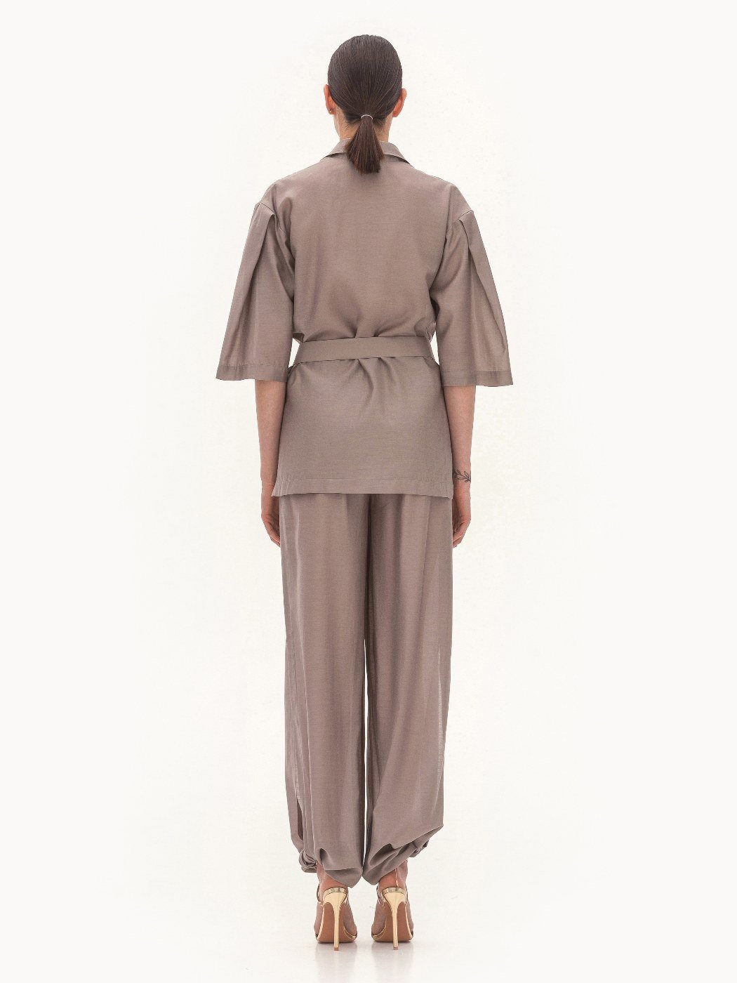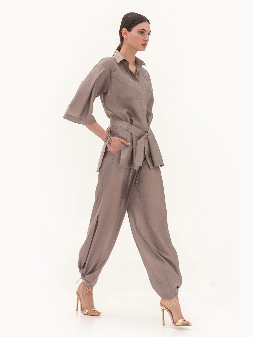 Вид изделия: брючный комплект с блузоном и поясом на пряжке. Силуэт, длина: свободный. Посадка по линии талии: классическая. Плотность и вид ткани: тонкий материал. Вид застежки: суппатная застежка на пуговицах. Наличие и вид карманов: настрочные. Вид рукава: полуреглан. Уход за изделием: Деликатная, быстрая, ручная стирка при 30 градусах, без использования агрессивных моющих средств. Размер изделия на фото: UA 40; еur 34; USA 2; INT XXS. Параметры модели на фотографии: Рост: 179см, ОГ — 89см, ОТ — 60см, ОБ — 89см.