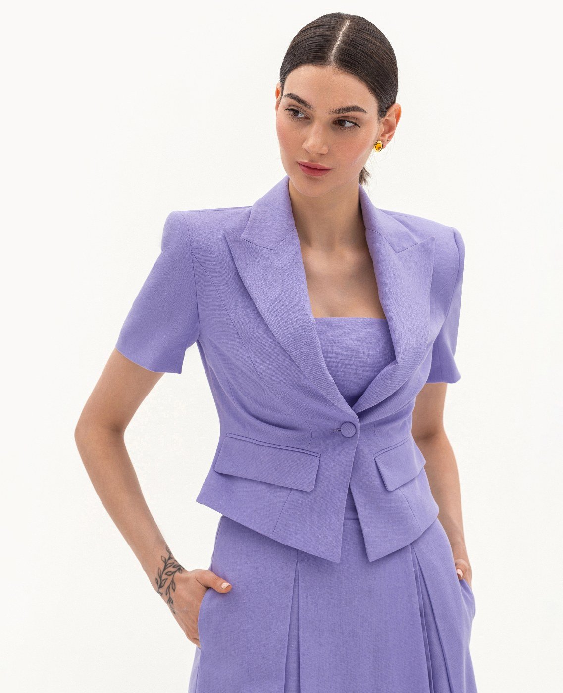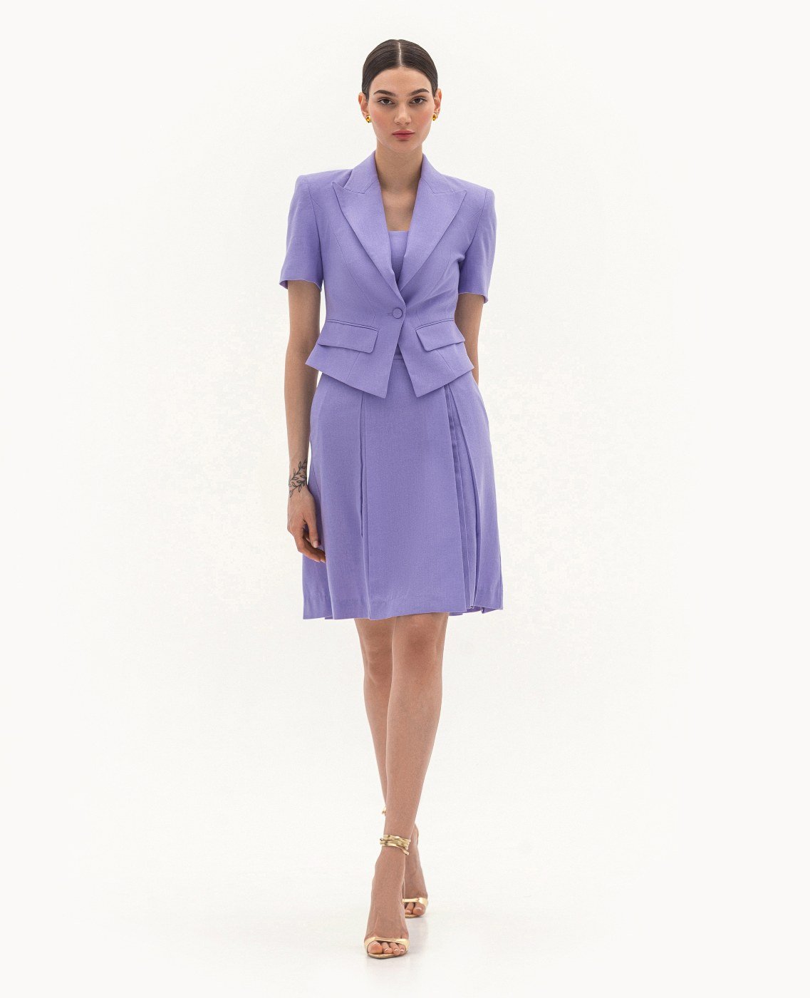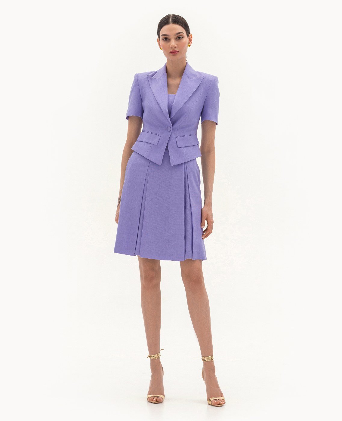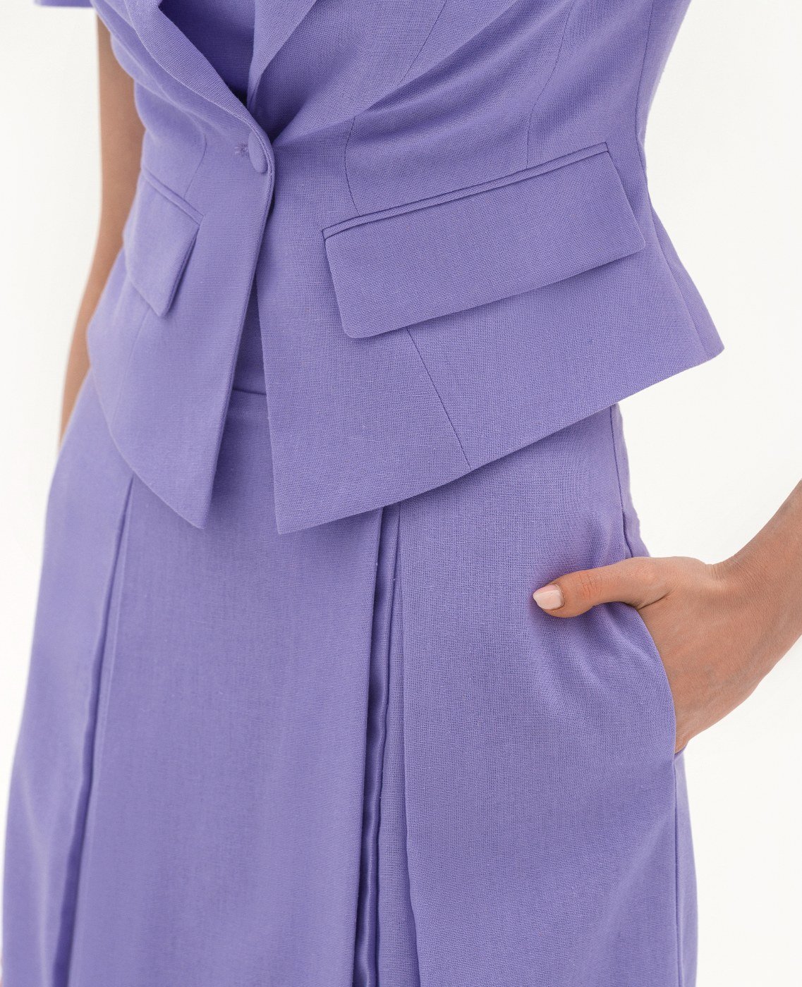 Вид изделия: комплект, состоящий из приталенного жакета и платья — бюстье, с легким расклешением, отрезным по линии талии, на запах, с боковой застежкой-молнией. Силуэт, длина: приталенный, прилегающий в верхней части, трапеция, в длине середины колена. Посадка по линии талии: классическая. Плотность и вид ткани: смесовый льняной материал, средней плотности. Вид застежки: разъемная молния. Наличие подкладочной ткани: тонкий поплин. Наличие и вид карманов: в боковых швах. Вырез горловины: ровный. Вид рукава: отсутствет. Уход за изделием: Деликатная, быстрая, ручная стирка при 30 градусах, без использования агрессивных моющих средств. Размер изделия на фото: UA 40; еur 34; USA 2; INT XXS. Параметры модели на фотографии: Рост: 179см, ОГ — 89см, ОТ — 60см, ОБ — 89см.