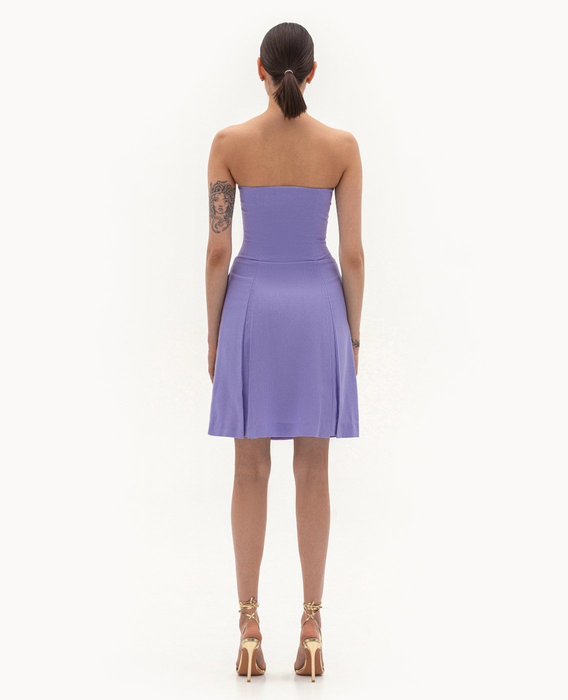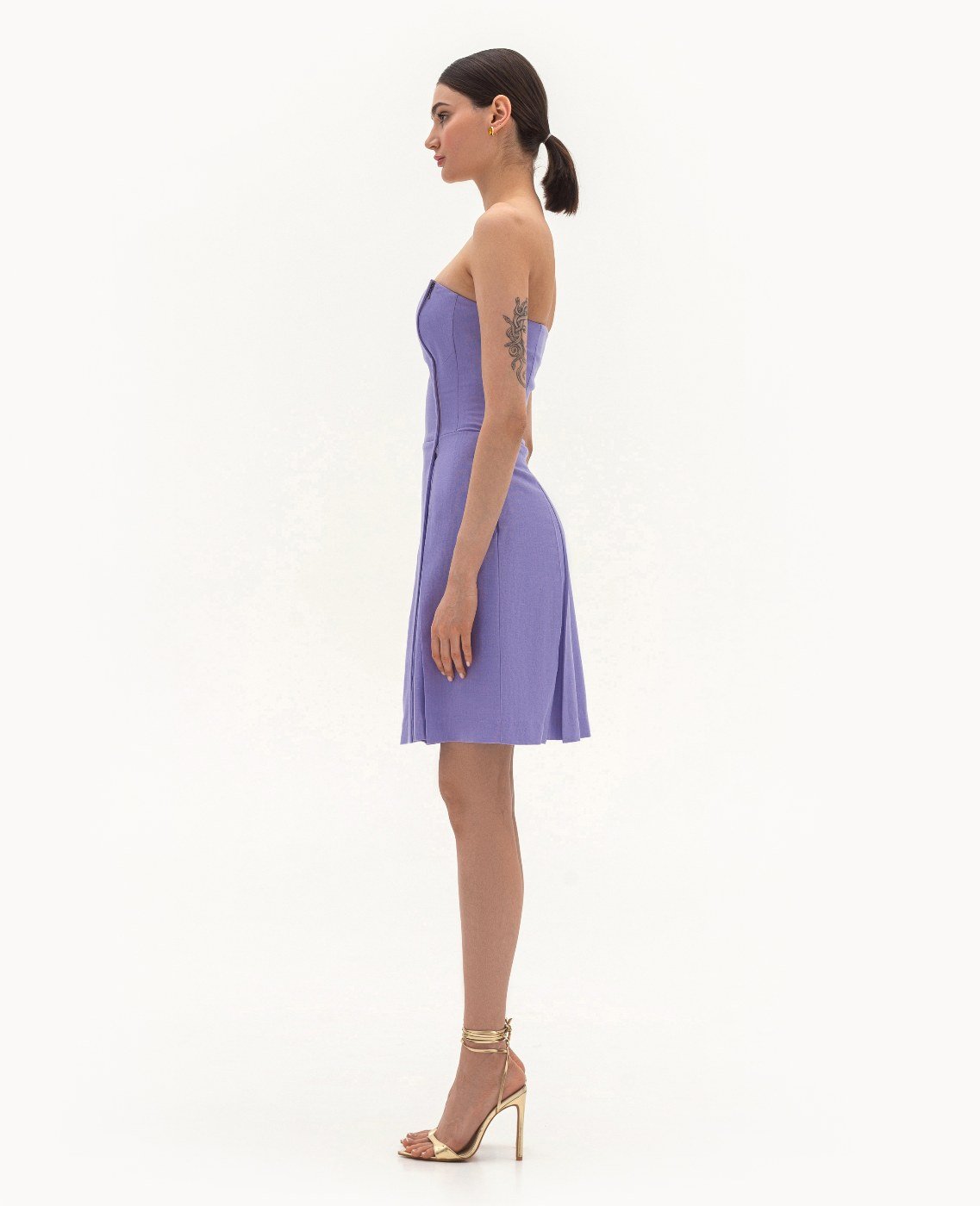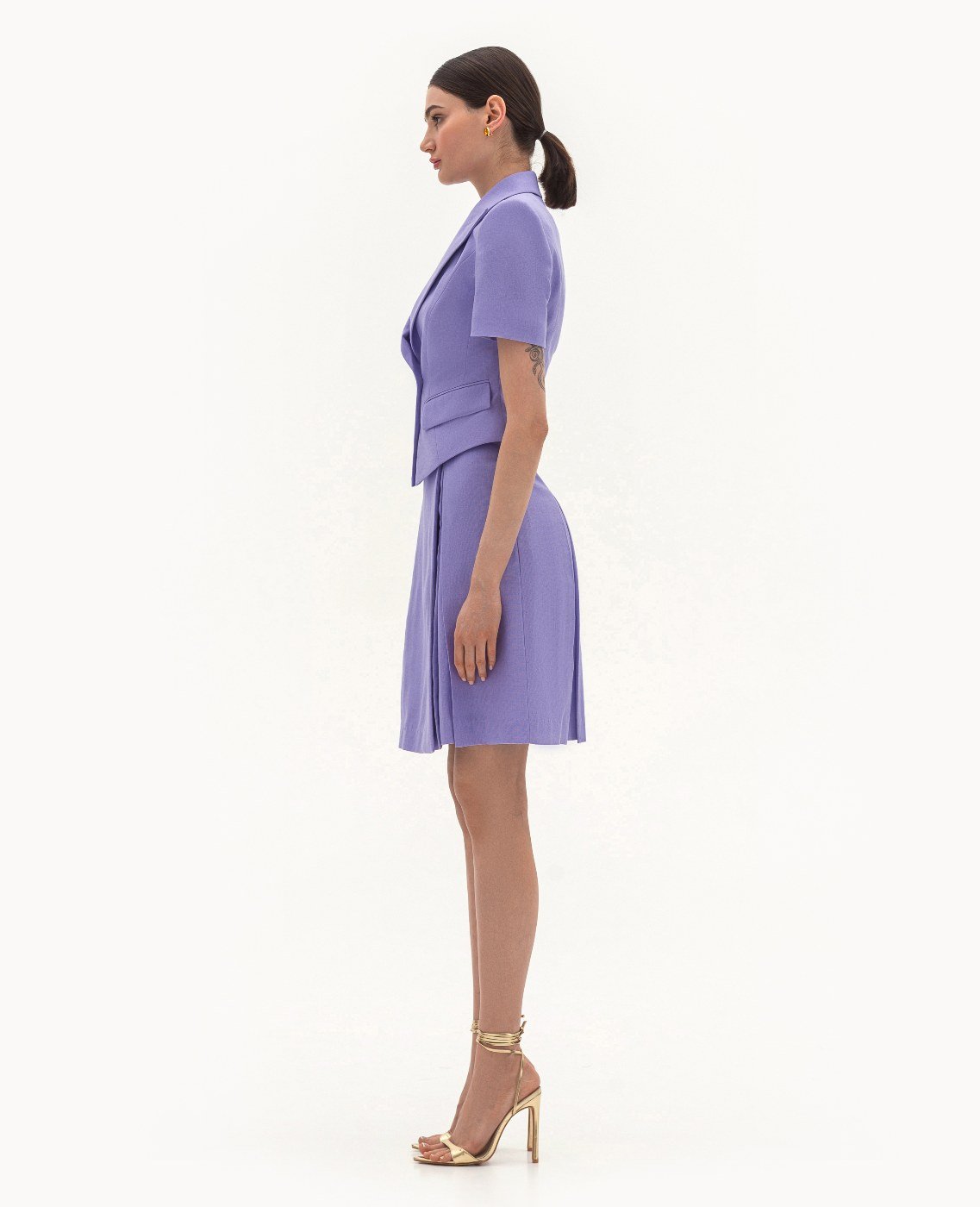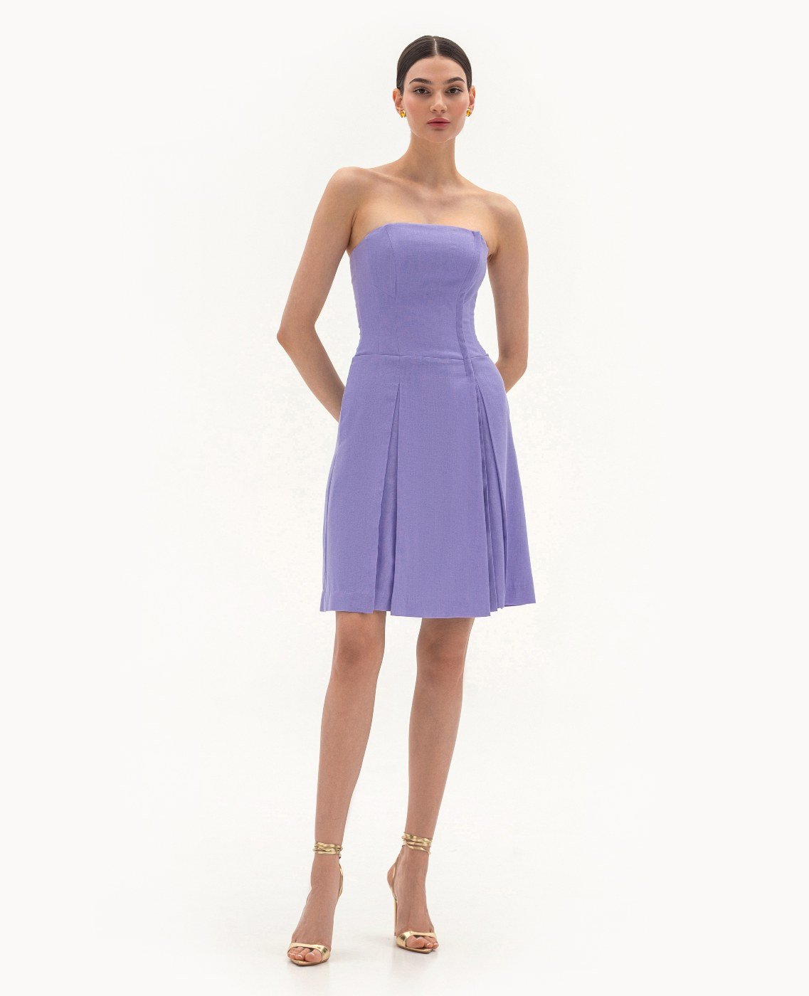 Вид изделия: комплект, состоящий из приталенного жакета и платья — бюстье, с легким расклешением, отрезным по линии талии, на запах, с боковой застежкой-молнией. Силуэт, длина: приталенный, прилегающий в верхней части, трапеция, в длине середины колена. Посадка по линии талии: классическая. Плотность и вид ткани: смесовый льняной материал, средней плотности. Вид застежки: разъемная молния. Наличие подкладочной ткани: тонкий поплин. Наличие и вид карманов: в боковых швах. Вырез горловины: ровный. Вид рукава: отсутствет. Уход за изделием: Деликатная, быстрая, ручная стирка при 30 градусах, без использования агрессивных моющих средств. Размер изделия на фото: UA 40; еur 34; USA 2; INT XXS. Параметры модели на фотографии: Рост: 179см, ОГ — 89см, ОТ — 60см, ОБ — 89см.