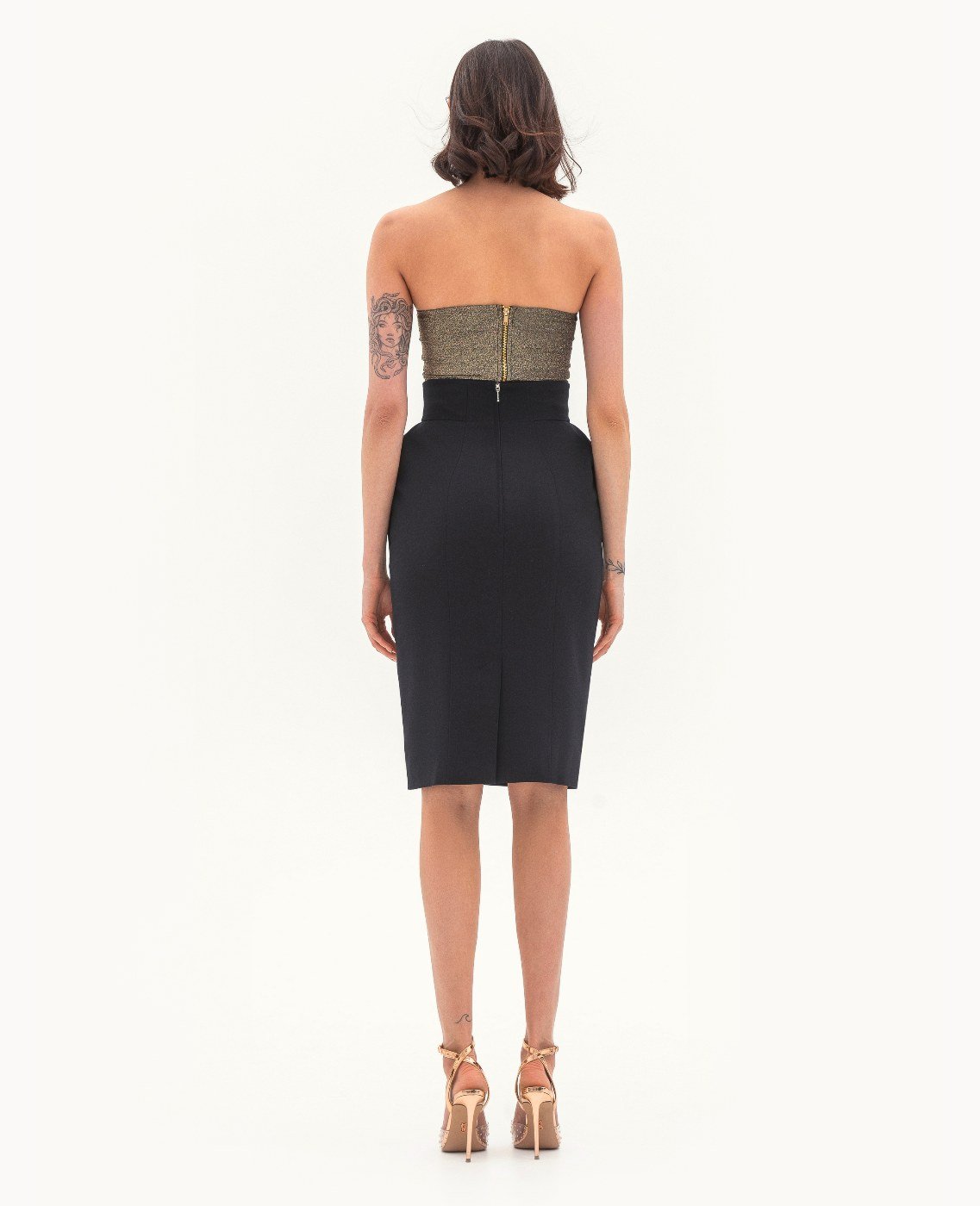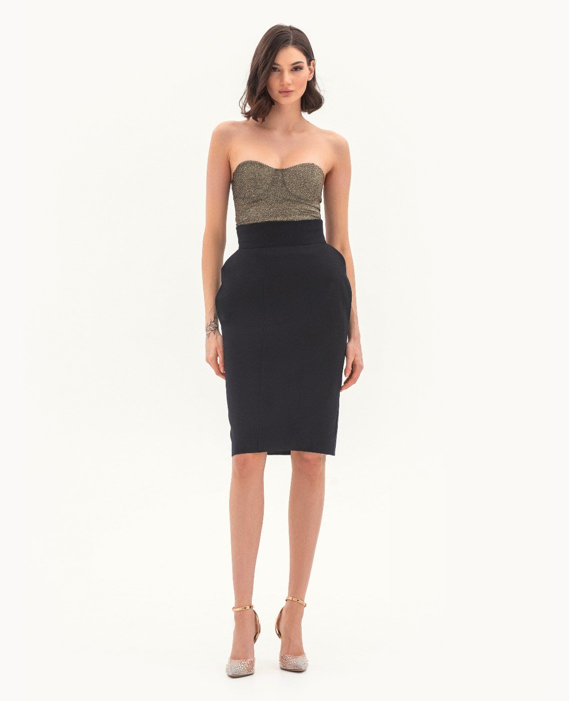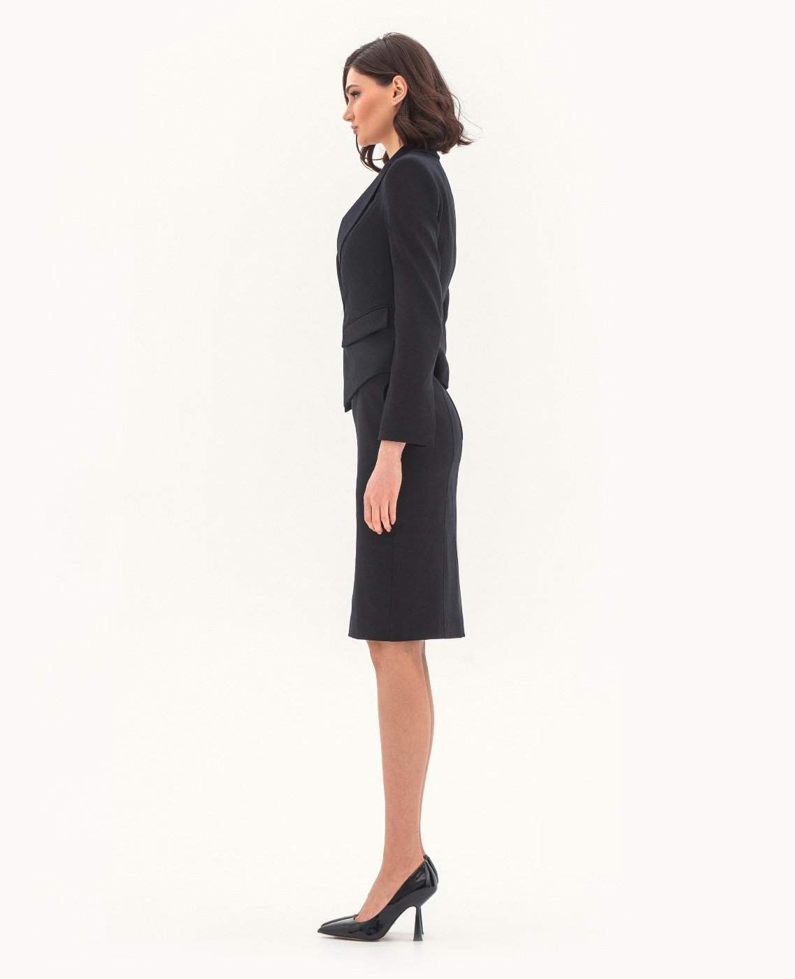 Вид изделия: комплект, состоящий из приталенного жакета и юбки с высоким поясом и акцентными деталями. Силуэт, длина: приталенный, полуприлегающий, в длине ниже колена. Посадка по линии талии: классическая. Плотность и вид ткани: средней плотности, текстильный материал с добавлением эластана. Вид застежки: пуговица в жакете, молния в юбке. Наличие подкладочной ткани: присутствует. Наличие и вид карманов: карманы в рамку с клапаном в жакете, карманы в боковых швах в юбке. Вырез горловины: V-образный. Вид рукава: втачной, с открытой шлицей по низу. Уход за изделием: Деликатная, быстрая, ручная стирка при 30 градусах, без использования агрессивных моющих средств. Размер изделия на фото: UA 40; еur 34; USA 2; INT XXS. Параметры модели на фотографии: Рост: 179см, ОГ — 89см, ОТ — 60см, ОБ — 89см.