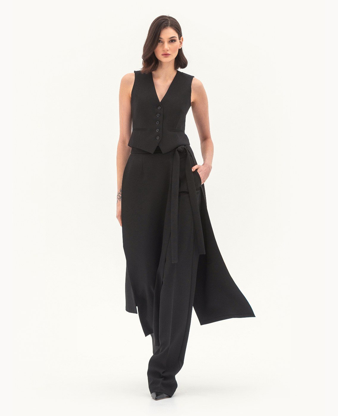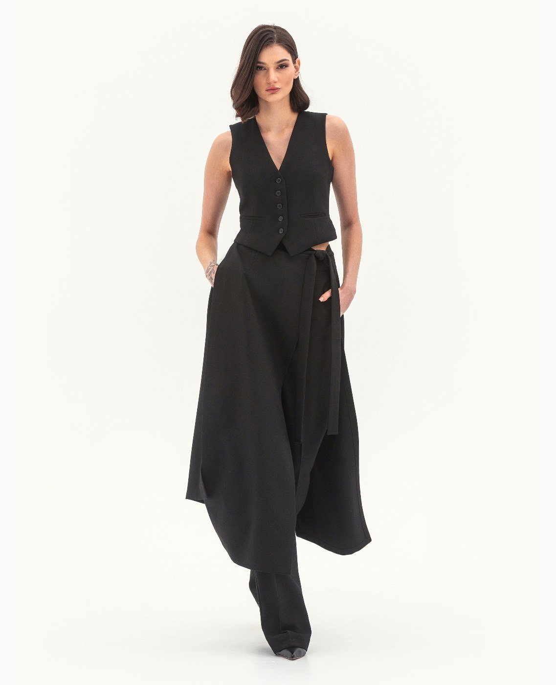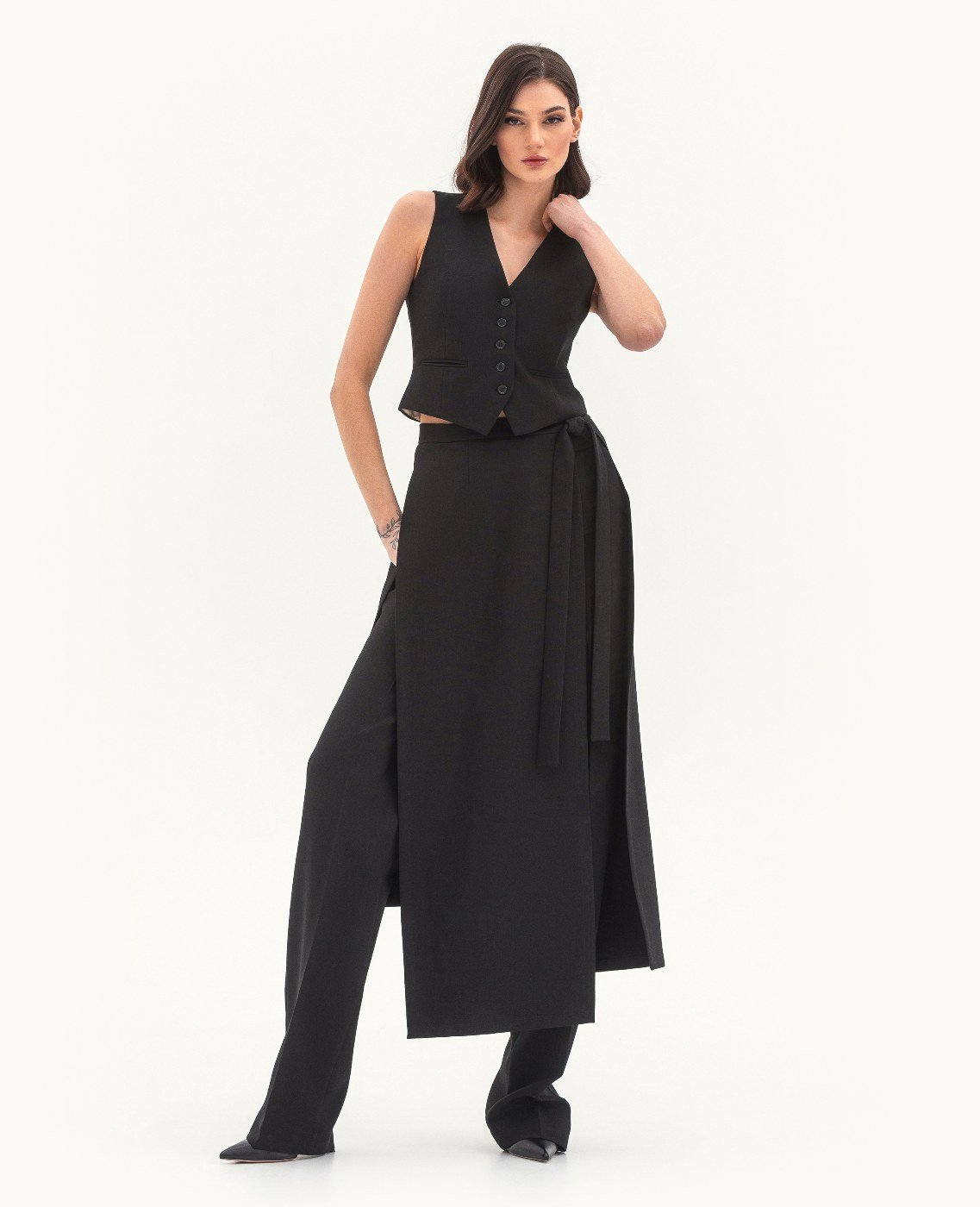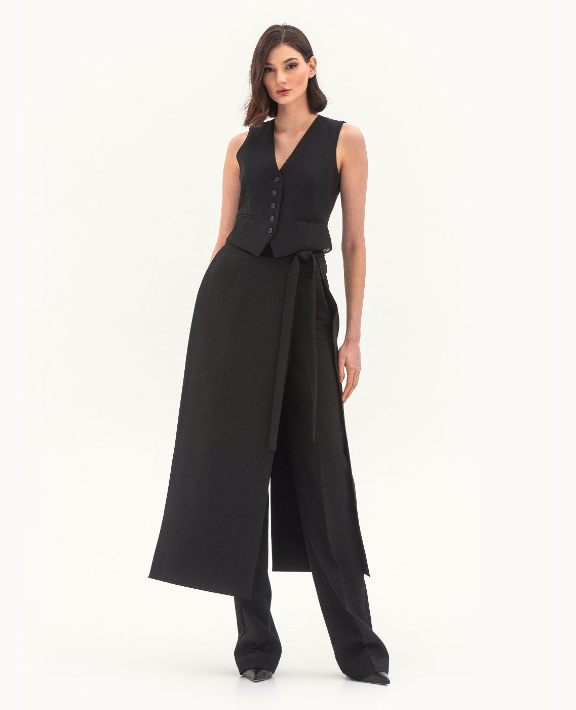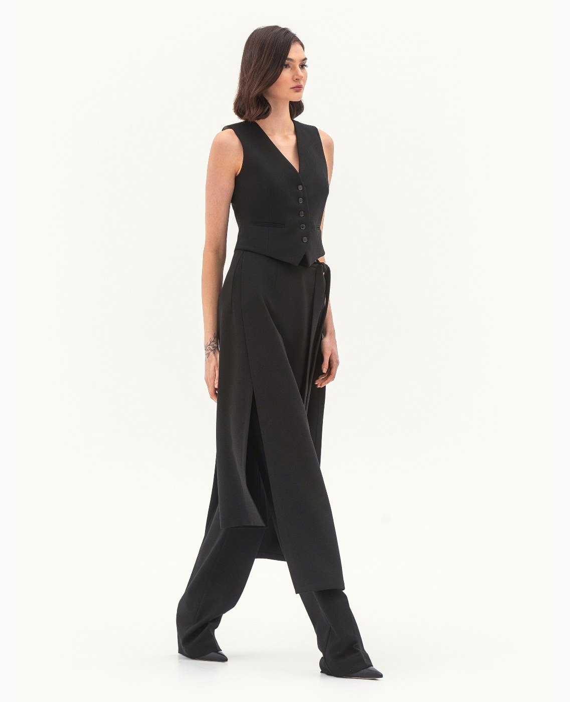 Вид изделия: тройной комплект, состоящий из жилета на пуговицах, прямых брюк и юбки-пояса с отлетными деталями ассимитричной длины. Силуэт, длина: полуприлегающий, свободный. Посадка по линии талии: слегка заниженная. Плотность и вид ткани: средней плотности, текстильный материал с добавлением эластана. Вид застежки: пуговицы, молния, крючки, отлетные завязки. Наличие подкладочной ткани: присутствует в жилете. Наличие и вид карманов: подкройные в брюках. Вырез горловины: V-образный. Вид рукава: открытая пройма. Уход за изделием: Деликатная, быстрая, ручная стирка при 30 градусах, без использования агрессивных моющих средств. Размер изделия на фото: UA 40; еur 34; USA 2; INT XXS. Параметры модели на фотографии: Рост: 179см, ОГ — 89см, ОТ — 60см, ОБ — 89см.