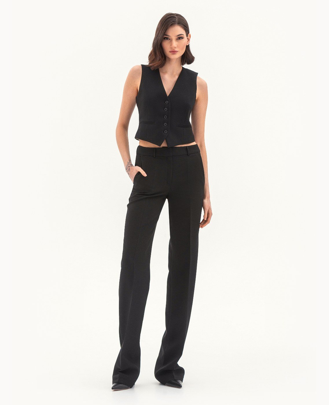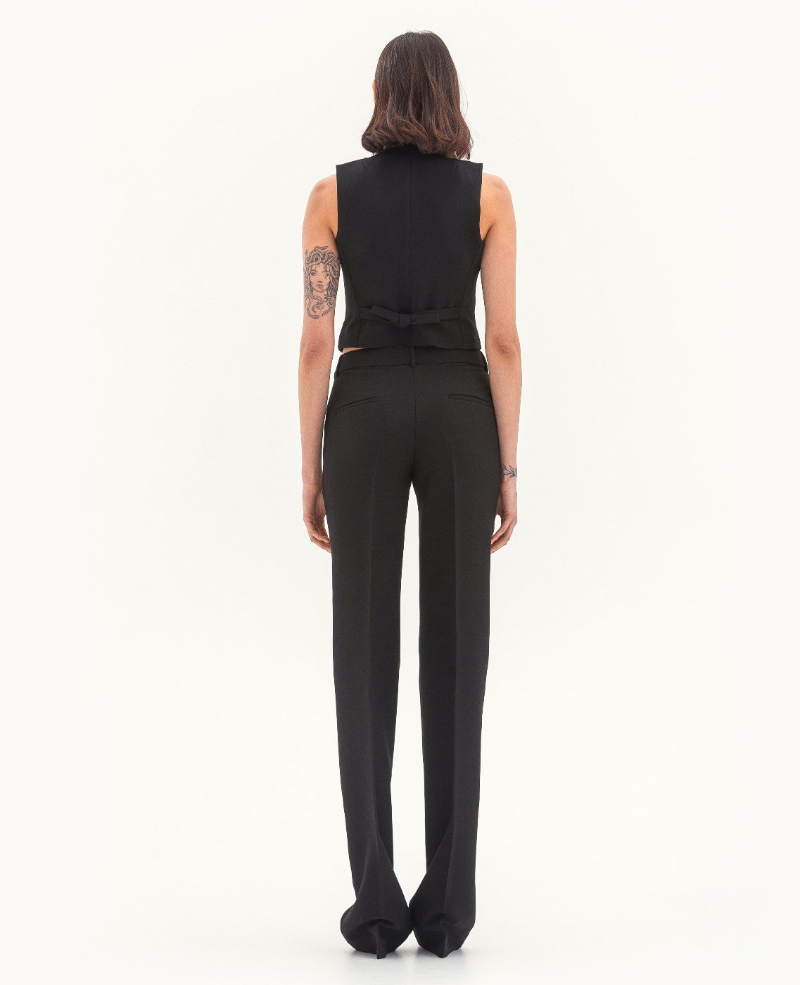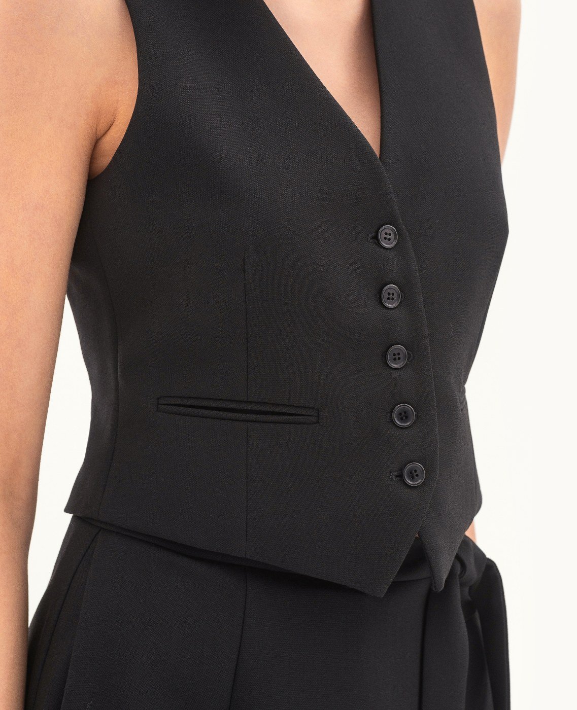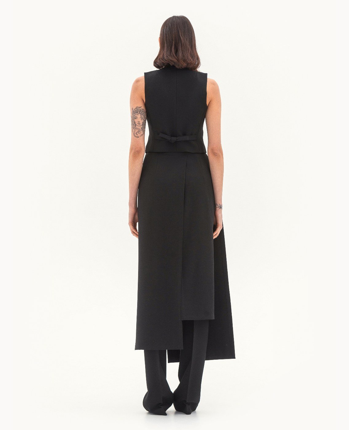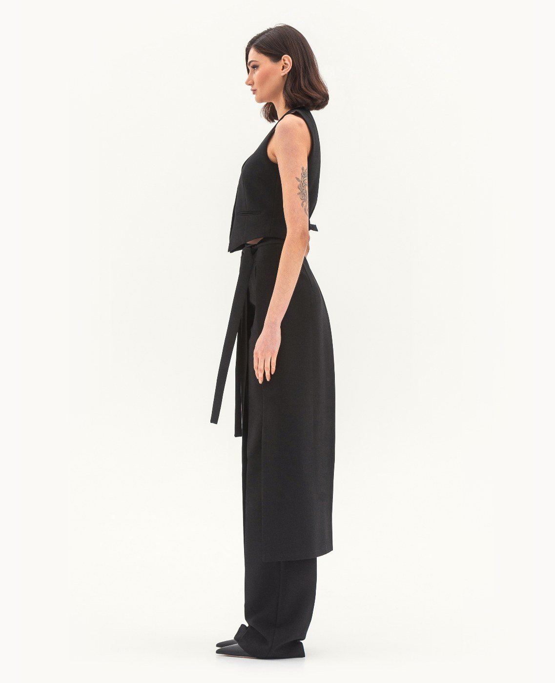 Вид изделия: тройной комплект, состоящий из жилета на пуговицах, прямых брюк и юбки-пояса с отлетными деталями ассимитричной длины. Силуэт, длина: полуприлегающий, свободный. Посадка по линии талии: слегка заниженная. Плотность и вид ткани: средней плотности, текстильный материал с добавлением эластана. Вид застежки: пуговицы, молния, крючки, отлетные завязки. Наличие подкладочной ткани: присутствует в жилете. Наличие и вид карманов: подкройные в брюках. Вырез горловины: V-образный. Вид рукава: открытая пройма. Уход за изделием: Деликатная, быстрая, ручная стирка при 30 градусах, без использования агрессивных моющих средств. Размер изделия на фото: UA 40; еur 34; USA 2; INT XXS. Параметры модели на фотографии: Рост: 179см, ОГ — 89см, ОТ — 60см, ОБ — 89см.