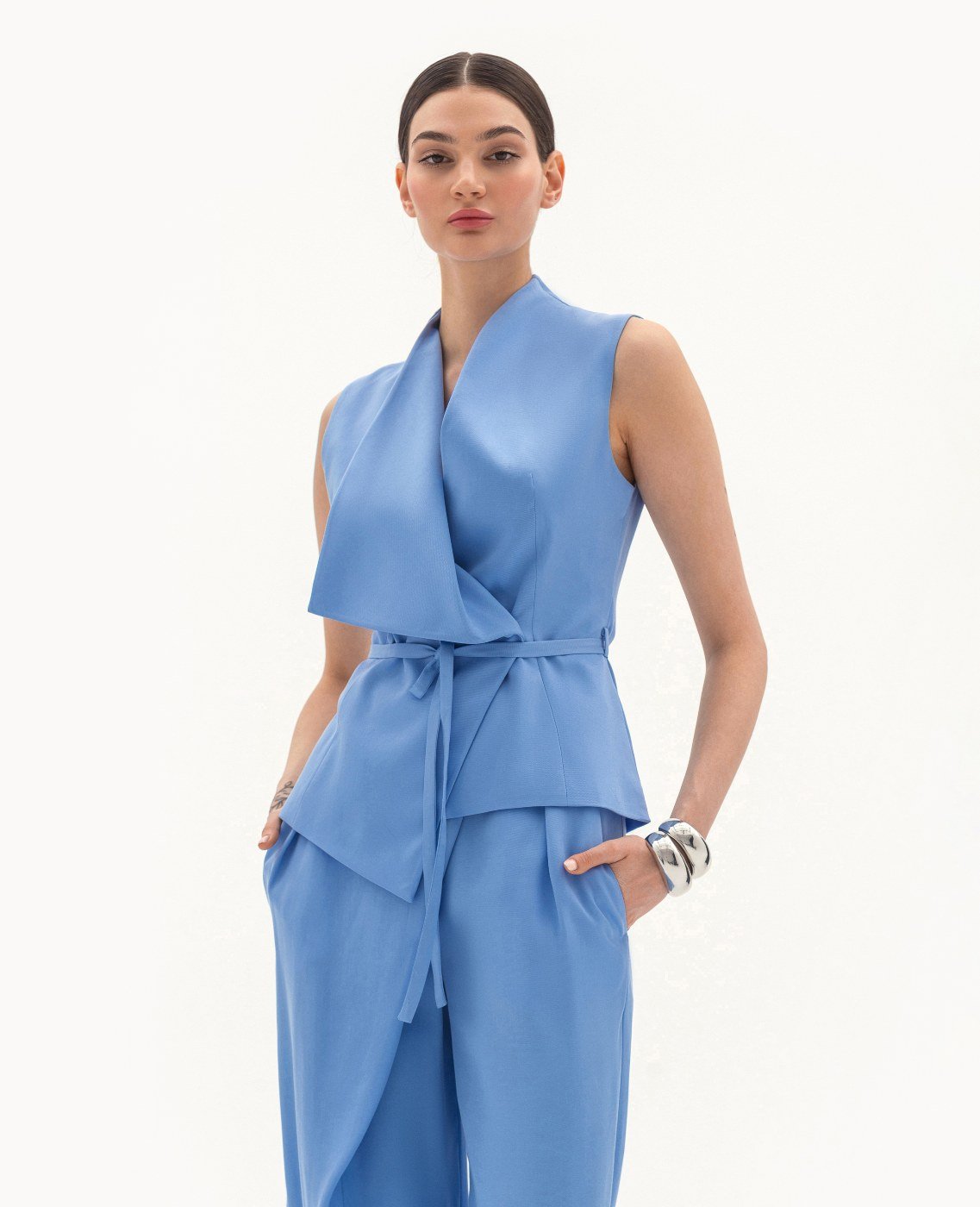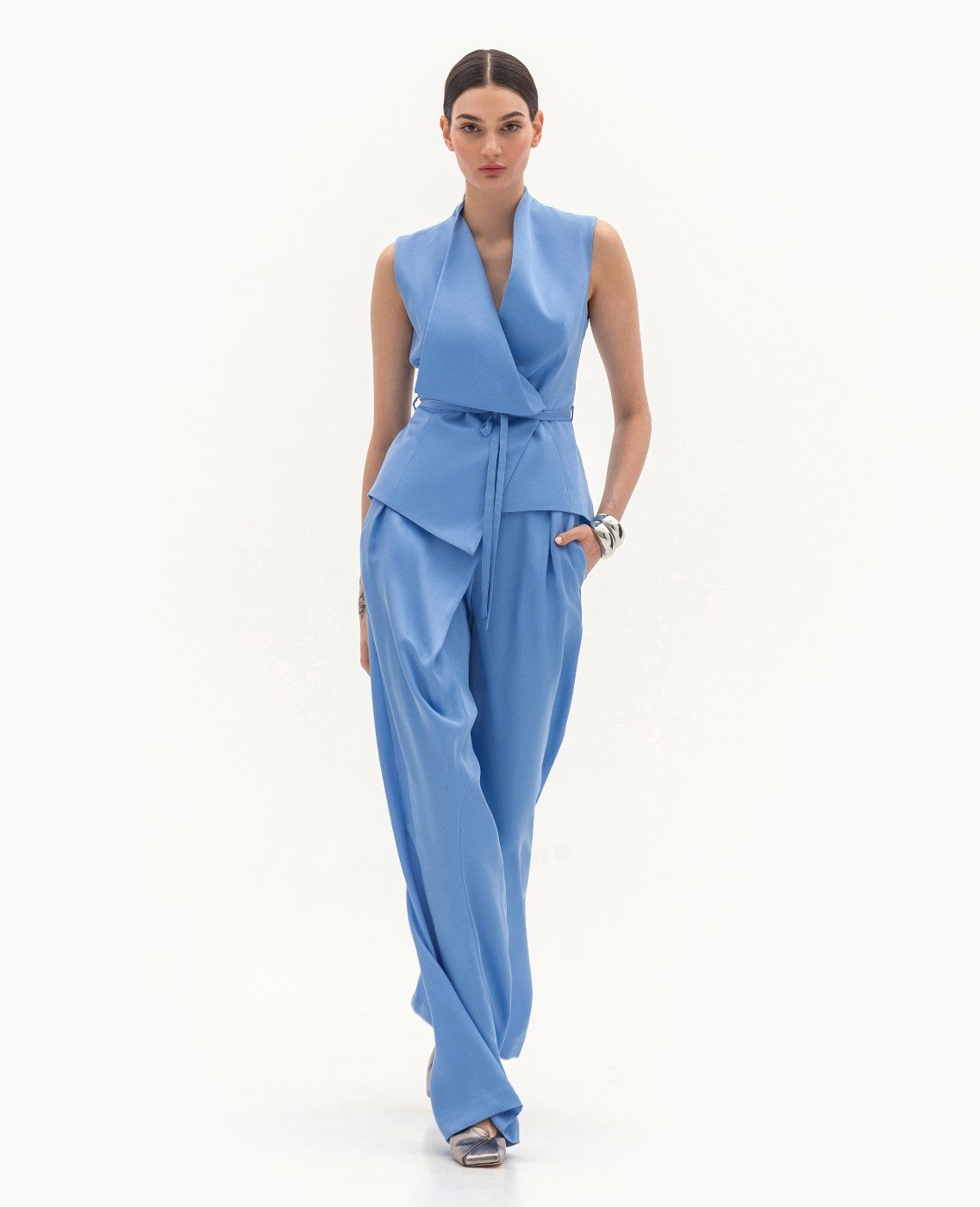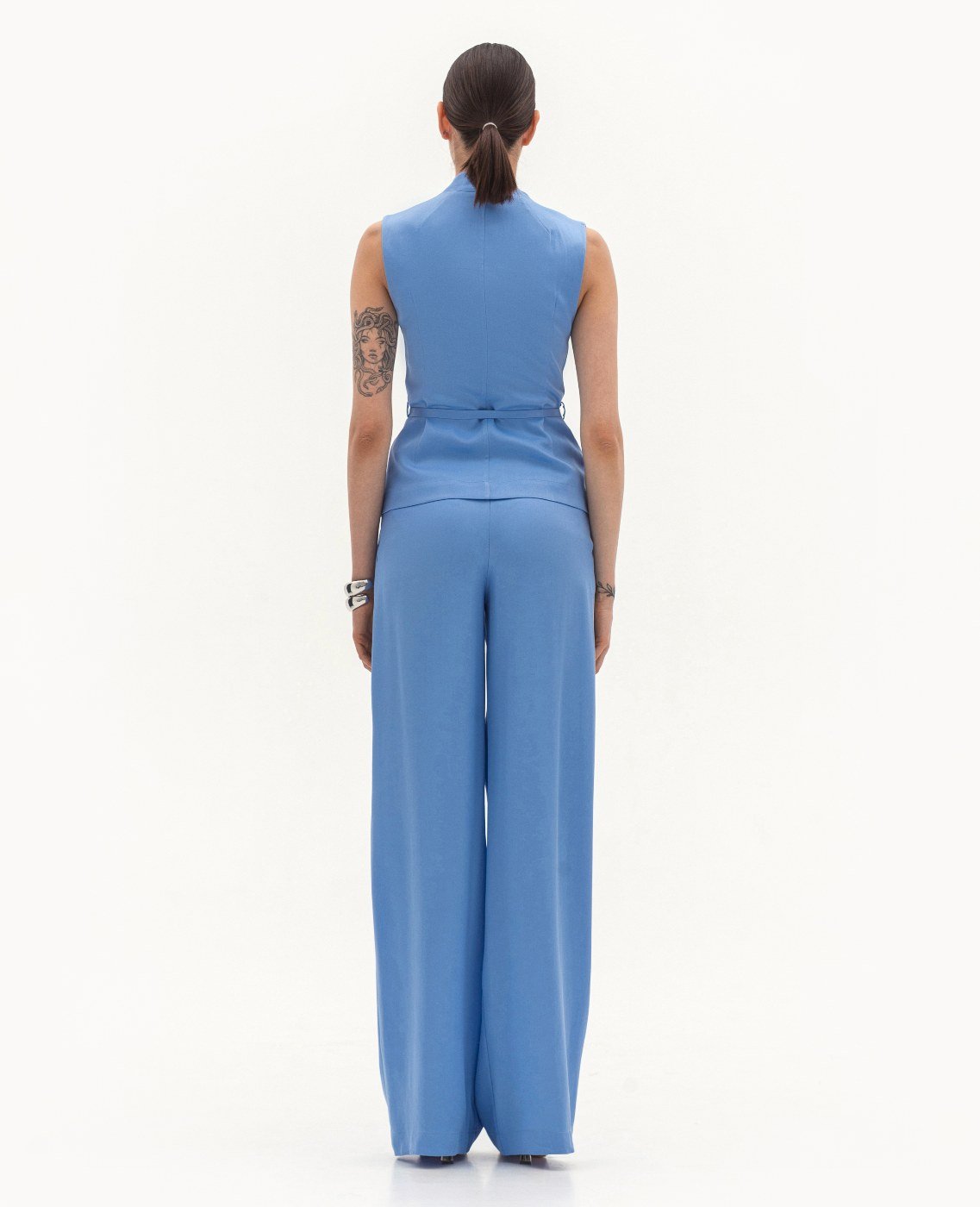 Вид изделия: брючный комплект с двубортным жилетом, поясом-шнурком. Силуэт, длина: полуприлегающий, свободный. Посадка по линии талии: классическая. Плотность и вид ткани: средней плотности тенсел. Вид застежки: кнопки, крючек, молния. Наличие подкладочной ткани: присутствует в жилете. Наличие и вид карманов: подкройные. Вырез горловины: V — образный. Вид рукава: Уход за изделием: Деликатная, быстрая, ручная стирка при 30 градусах, без использования агрессивных моющих средств. Размер изделия на фото: UA 40; еur 34; USA 2; INT XXS. Параметры модели на фотографии: Рост: 179см, ОГ — 89см, ОТ — 60см, ОБ — 89см.