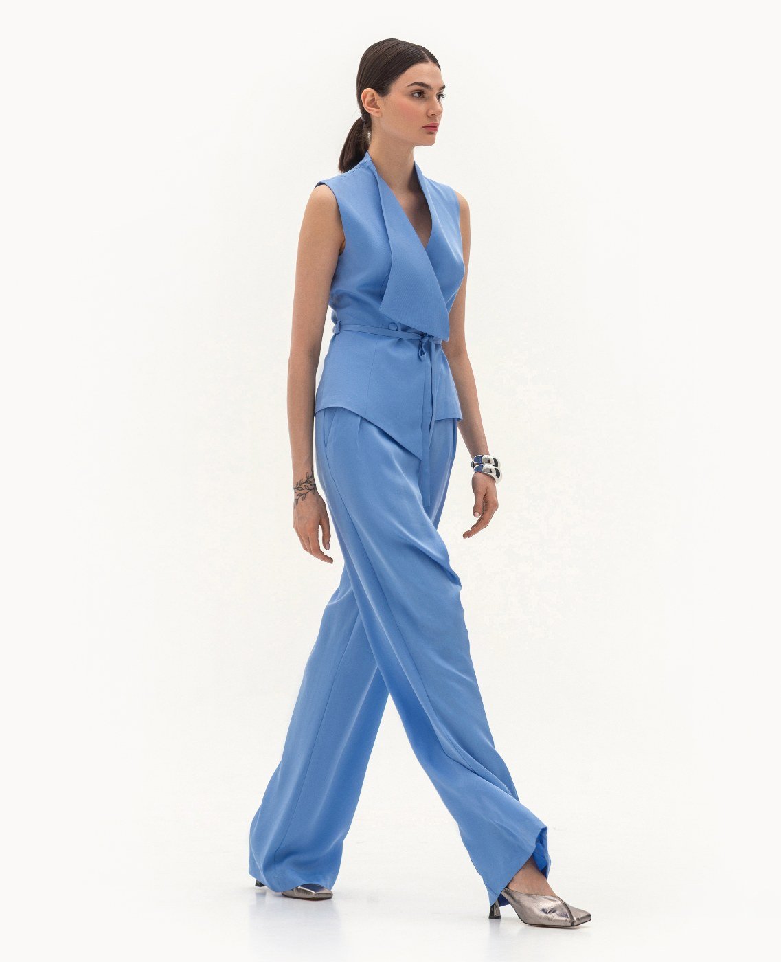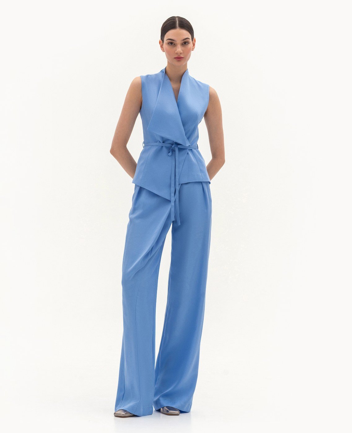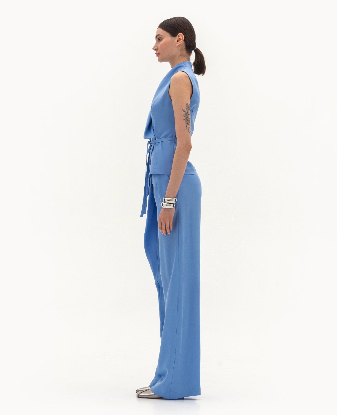 Вид изделия: брючный комплект с двубортным жилетом, поясом-шнурком. Силуэт, длина: полуприлегающий, свободный. Посадка по линии талии: классическая. Плотность и вид ткани: средней плотности тенсел. Вид застежки: кнопки, крючек, молния. Наличие подкладочной ткани: присутствует в жилете. Наличие и вид карманов: подкройные. Вырез горловины: V — образный. Вид рукава: Уход за изделием: Деликатная, быстрая, ручная стирка при 30 градусах, без использования агрессивных моющих средств. Размер изделия на фото: UA 40; еur 34; USA 2; INT XXS. Параметры модели на фотографии: Рост: 179см, ОГ — 89см, ОТ — 60см, ОБ — 89см.
