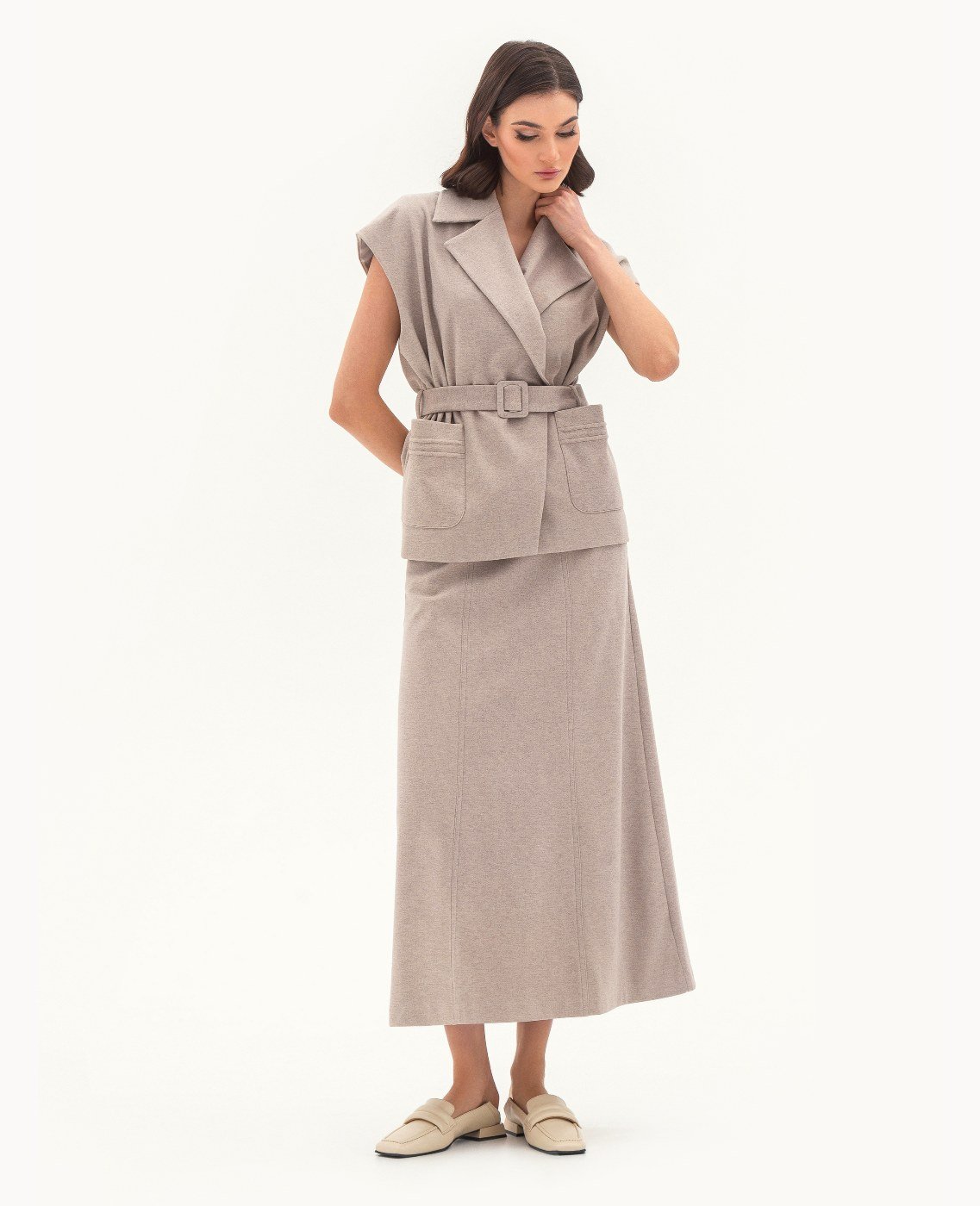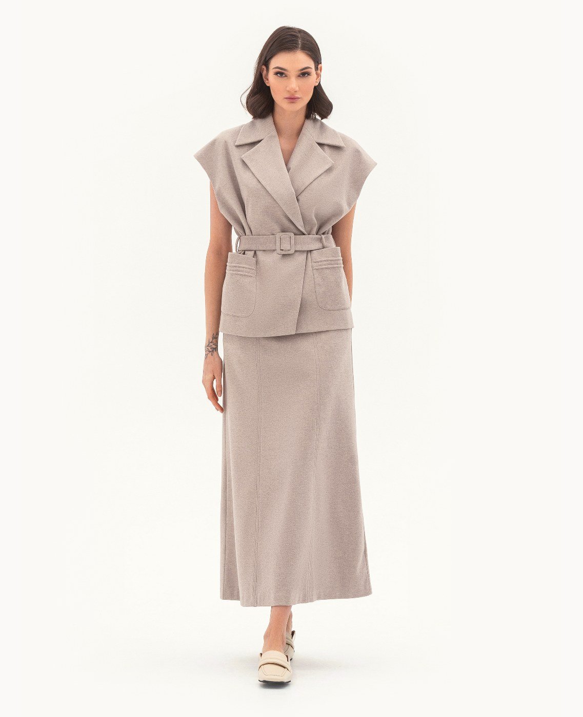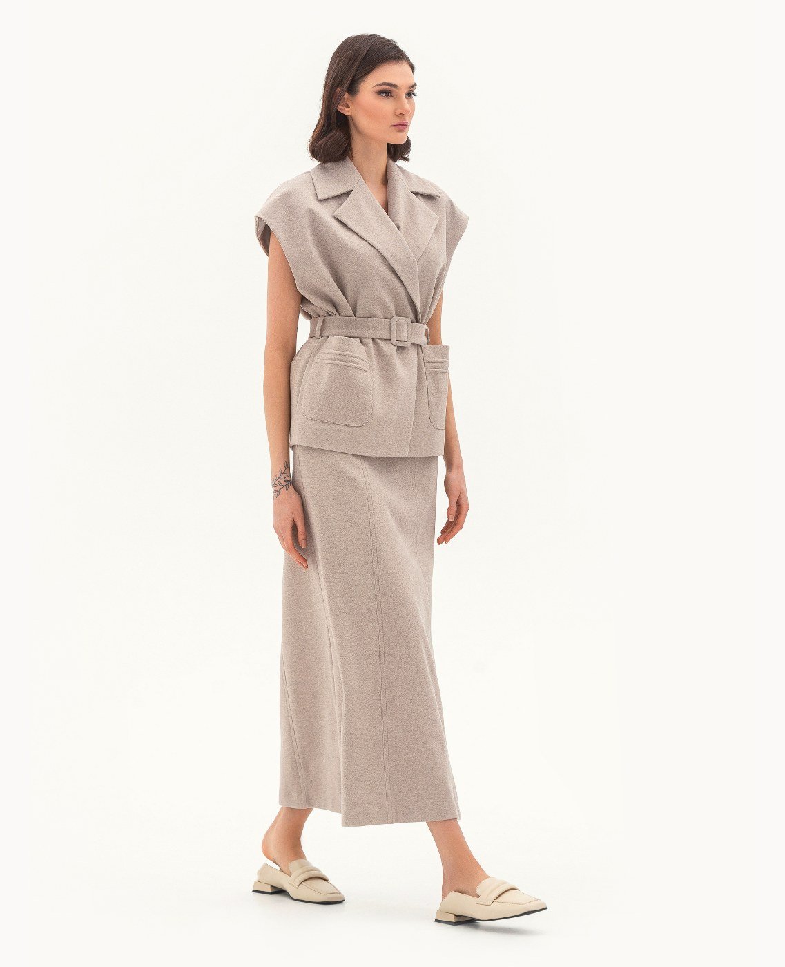 Вид изделия: комплект, состоящий из обьемного, двубортного жилета с воротником и лацканами, настрочными карманами и юбки-трапеции с четырьмя клиньями, в комплектации со сьемным поясом. Силуэт, длина: свободный, макси. Посадка по линии талии: классическая. Плотность и вид ткани: плотный, очень теплый и мягкий материал, тактильно имитирующий кашемир. Вид застежки: кнопки в жилете, молния в юбке. Наличие подкладочной ткани: присутствует. Наличие и вид карманов: настрочные в жилете, подкройные в юбке. Вырез горловины: V-образный. Вид рукава: без рукава. Уход за изделием: Деликатная, быстрая, ручная стирка при 30 градусах, без использования агрессивных моющих средств. Размер изделия на фото: UA 40; еur 34; USA 2; INT XXS. Параметры модели на фотографии: Рост: 179см, ОГ — 89см, ОТ — 60см, ОБ — 89см.