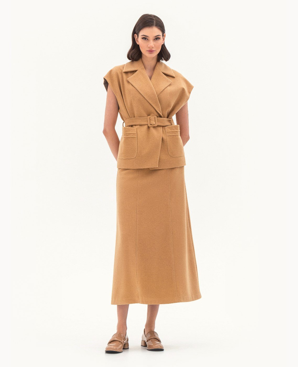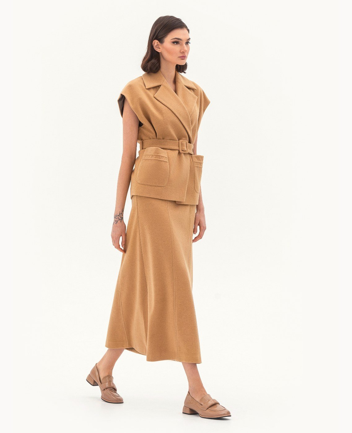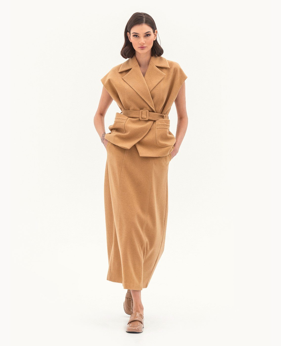 Вид изделия: комплект, состоящий из обьемного, двубортного жилета с воротником и лацканами, настрочными карманами и юбки-трапеции с четырьмя клиньями, в комплектации со сьемным поясом. Силуэт, длина: свободный, макси. Посадка по линии талии: классическая. Плотность и вид ткани: плотный, очень теплый и мягкий материал, тактильно имитирующий кашемир. Вид застежки: кнопки в жилете, молния в юбке. Наличие подкладочной ткани: присутствует. Наличие и вид карманов: настрочные в жилете, подкройные в юбке. Вырез горловины: V-образный. Вид рукава: без рукава. Уход за изделием: Деликатная, быстрая, ручная стирка при 30 градусах, без использования агрессивных моющих средств. Размер изделия на фото: UA 40; еur 34; USA 2; INT XXS. Параметры модели на фотографии: Рост: 179см, ОГ — 89см, ОТ — 60см, ОБ — 89см.