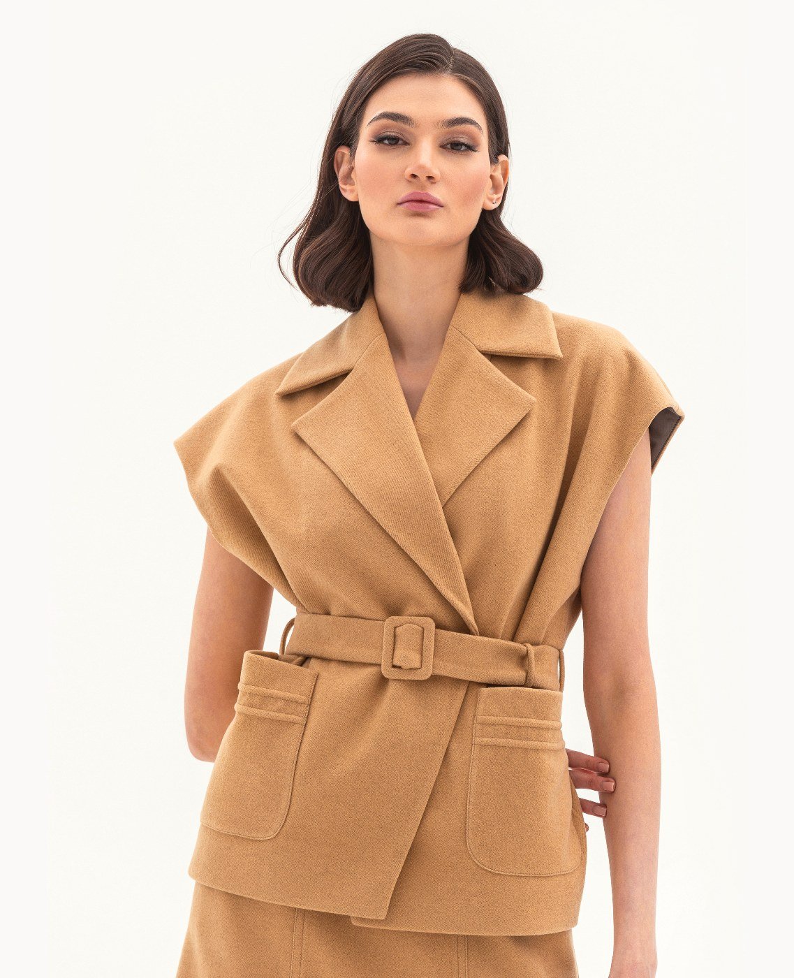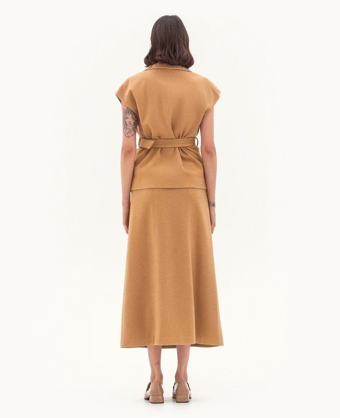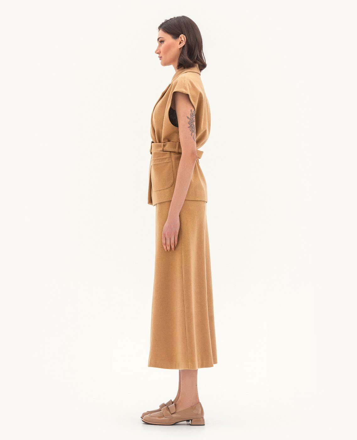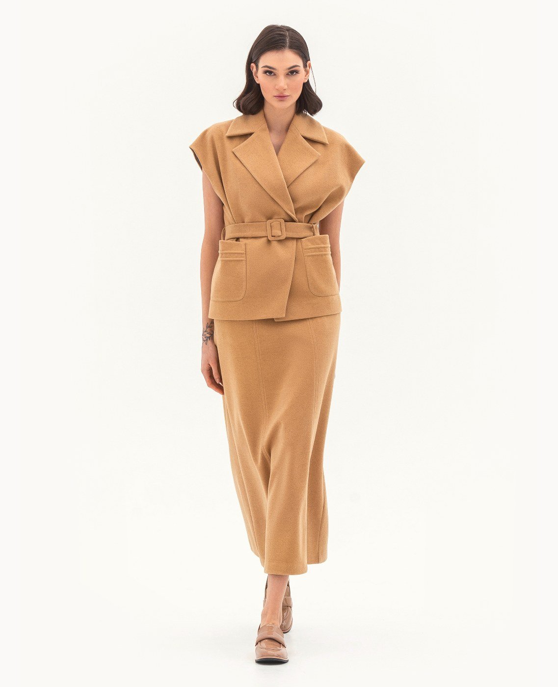 Вид изделия: комплект, состоящий из обьемного, двубортного жилета с воротником и лацканами, настрочными карманами и юбки-трапеции с четырьмя клиньями, в комплектации со сьемным поясом. Силуэт, длина: свободный, макси. Посадка по линии талии: классическая. Плотность и вид ткани: плотный, очень теплый и мягкий материал, тактильно имитирующий кашемир. Вид застежки: кнопки в жилете, молния в юбке. Наличие подкладочной ткани: присутствует. Наличие и вид карманов: настрочные в жилете, подкройные в юбке. Вырез горловины: V-образный. Вид рукава: без рукава. Уход за изделием: Деликатная, быстрая, ручная стирка при 30 градусах, без использования агрессивных моющих средств. Размер изделия на фото: UA 40; еur 34; USA 2; INT XXS. Параметры модели на фотографии: Рост: 179см, ОГ — 89см, ОТ — 60см, ОБ — 89см.