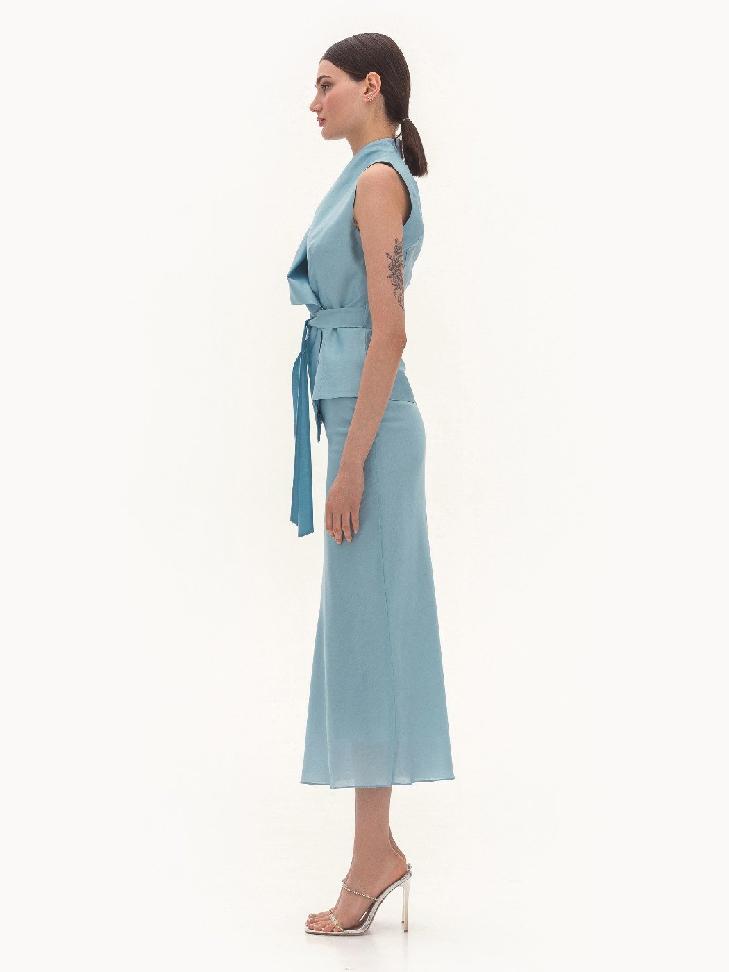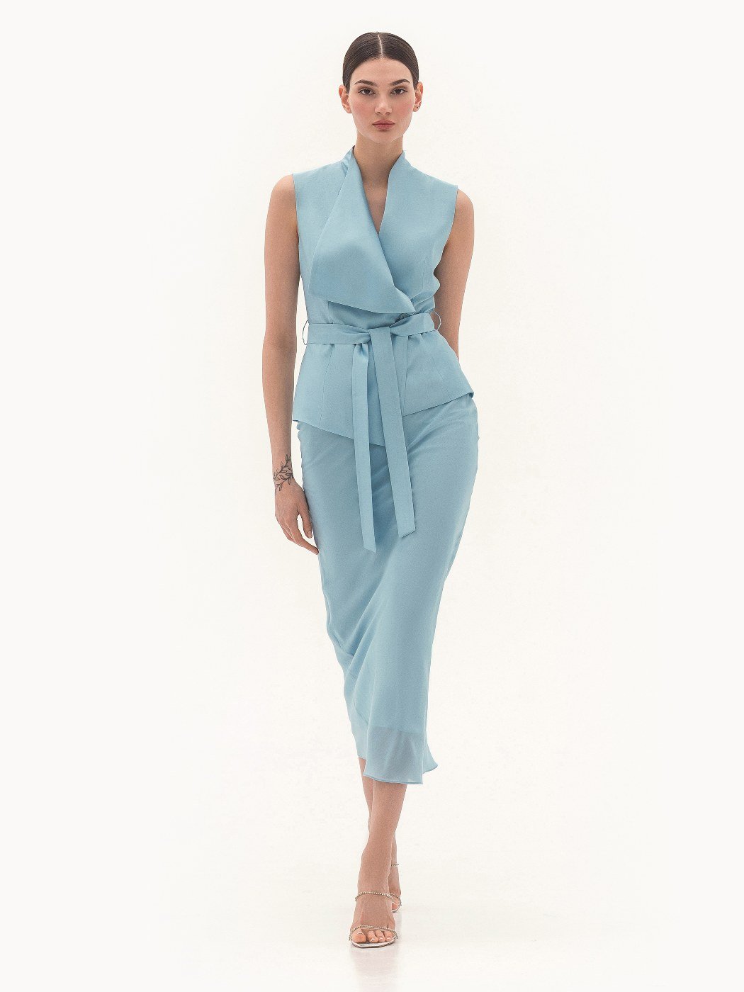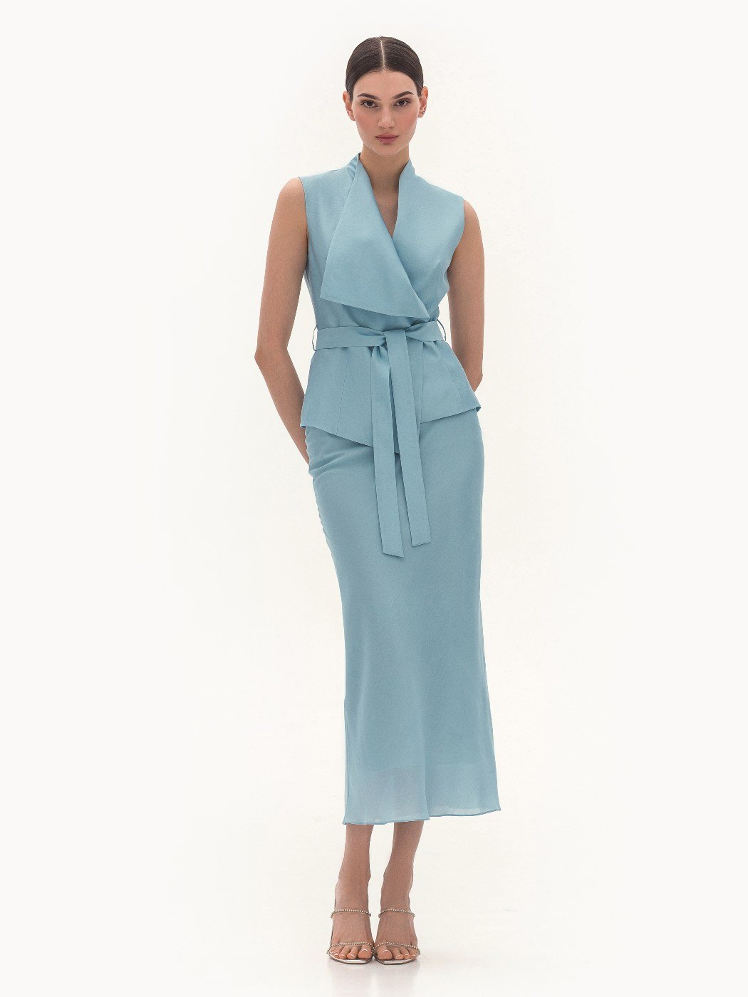 Вид изделия: комплект, состоящий из двубортного жилета с поясом и юбки по «косой». Силуэт, длина: полуприлегающий, макси. Посадка по линии талии: классическая. Плотность и вид ткани: тонкий тенсел. Вид застежки: молния, пуговицы. Наличие подкладочной ткани: присутствует. Уход за изделием: Деликатная, быстрая, ручная стирка при 30 градусах, без использования агрессивных моющих средств. Размер изделия на фото: UA 40; еur 34; USA 2; INT XXS. Параметры модели на фотографии: Рост: 179см, ОГ — 89см, ОТ — 60см, ОБ — 89см.