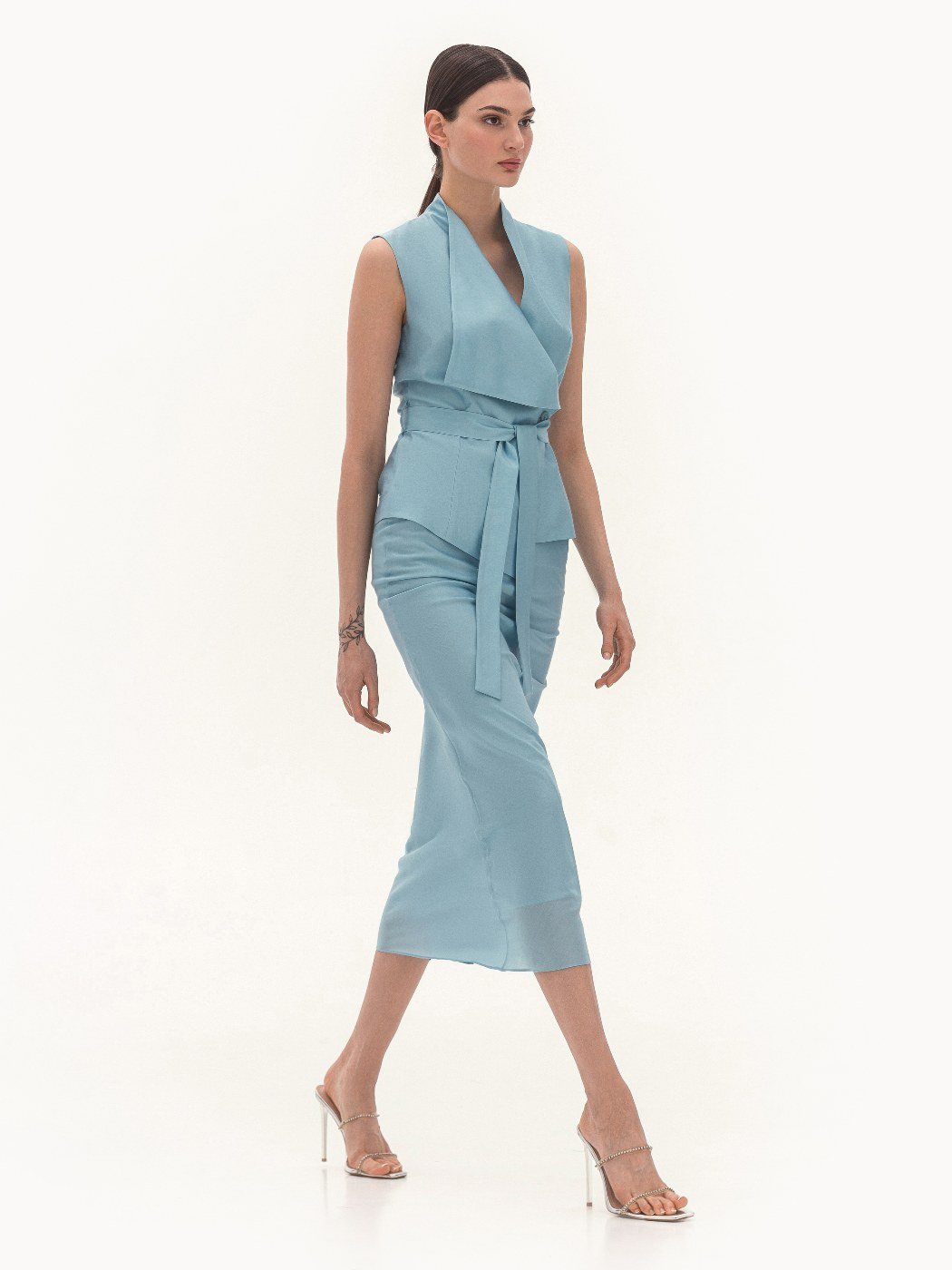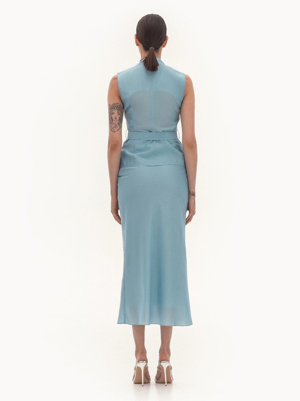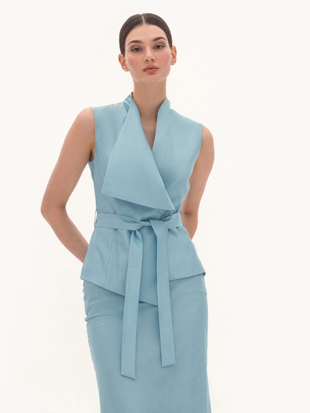 Вид изделия: комплект, состоящий из двубортного жилета с поясом и юбки по «косой». Силуэт, длина: полуприлегающий, макси. Посадка по линии талии: классическая. Плотность и вид ткани: тонкий тенсел. Вид застежки: молния, пуговицы. Наличие подкладочной ткани: присутствует. Уход за изделием: Деликатная, быстрая, ручная стирка при 30 градусах, без использования агрессивных моющих средств. Размер изделия на фото: UA 40; еur 34; USA 2; INT XXS. Параметры модели на фотографии: Рост: 179см, ОГ — 89см, ОТ — 60см, ОБ — 89см.