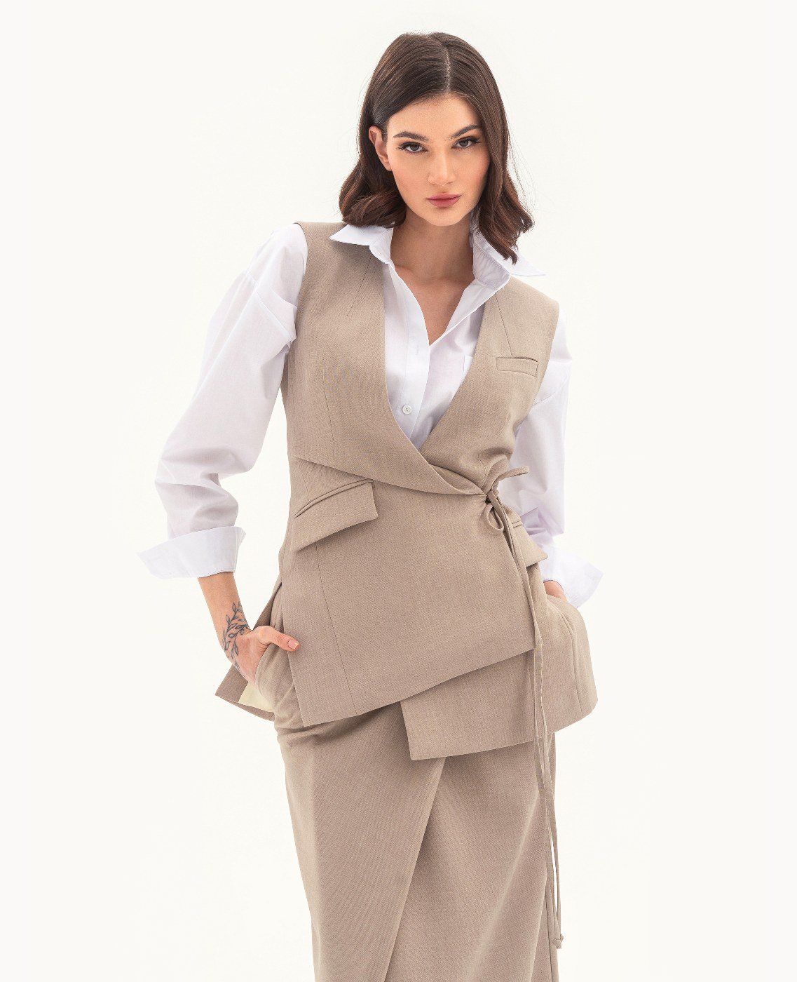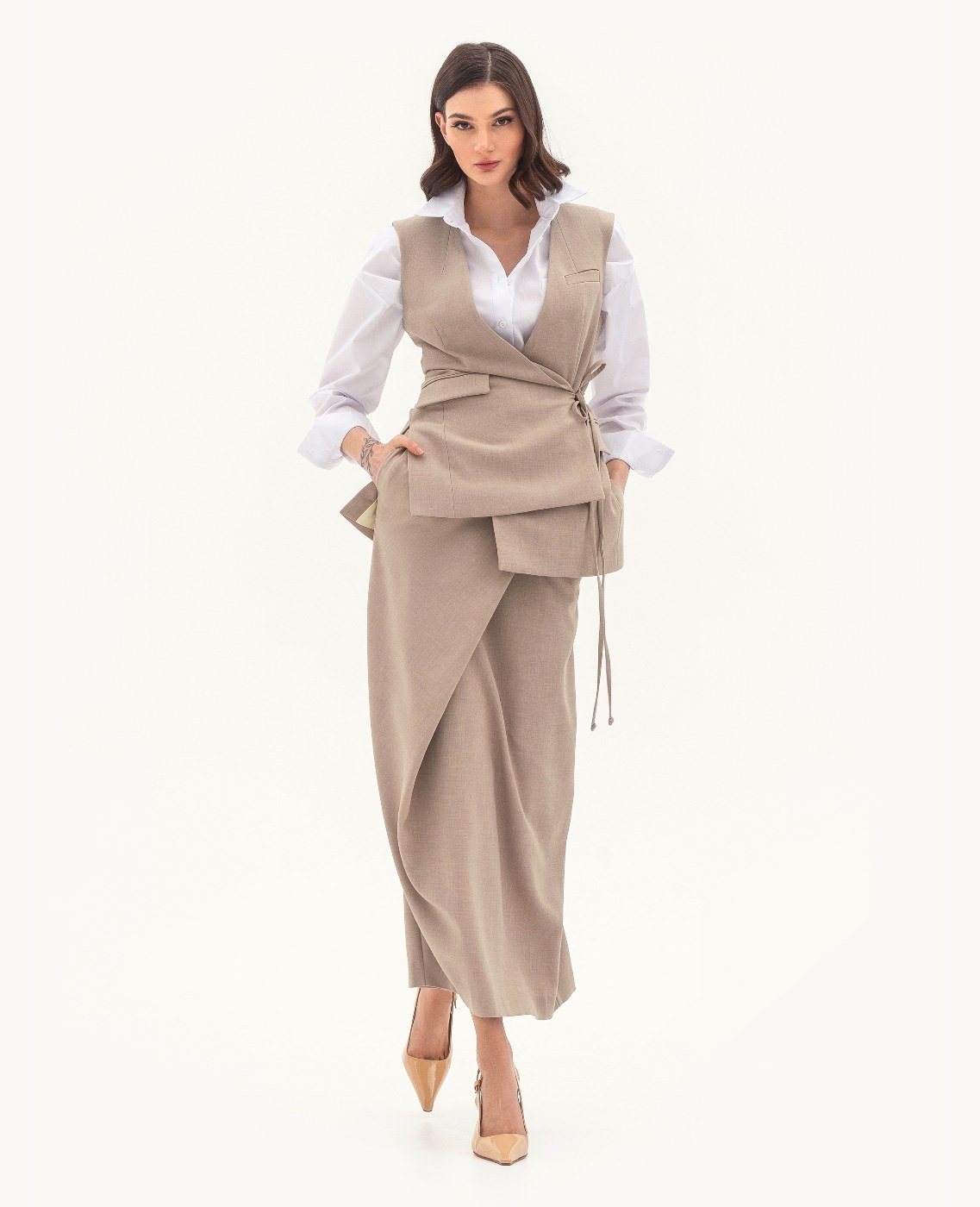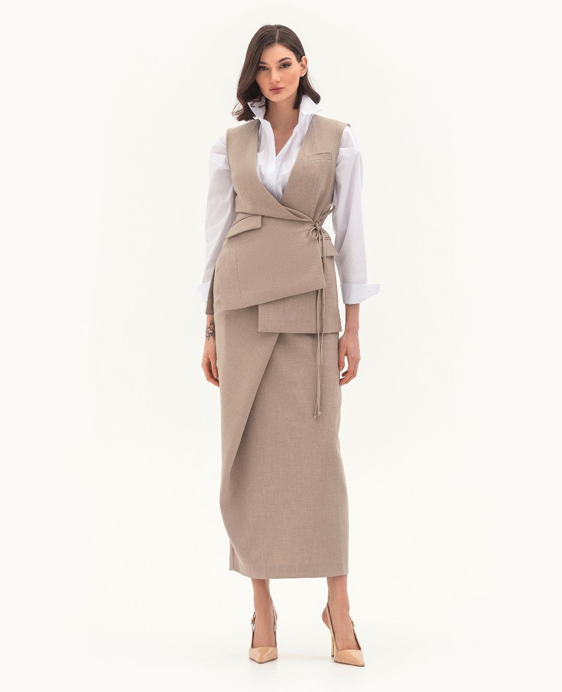 Вид изделия: комплект, состоящий из удлинённого жилета с асимметричными деталями на завязках-шнурках и разрезами по боковым швам, а также прямой юбки с акцентной деталью. Силуэт, длина: полуприлегающий, свободный; длина миди. Посадка по талии: классическая. Плотность и вид ткани: текстильный материал средней плотности с добавлением эластана. Вид застёжки: — жилет — шнурки-завязки; — юбка — молния и кнопка. Подкладка: присутствует. Карманы: — жилет — карманы в рамку с клапаном; — юбка — подкройные карманы. Вырез горловины: V-образный. Рукав: отсутствует (открытая пройма).