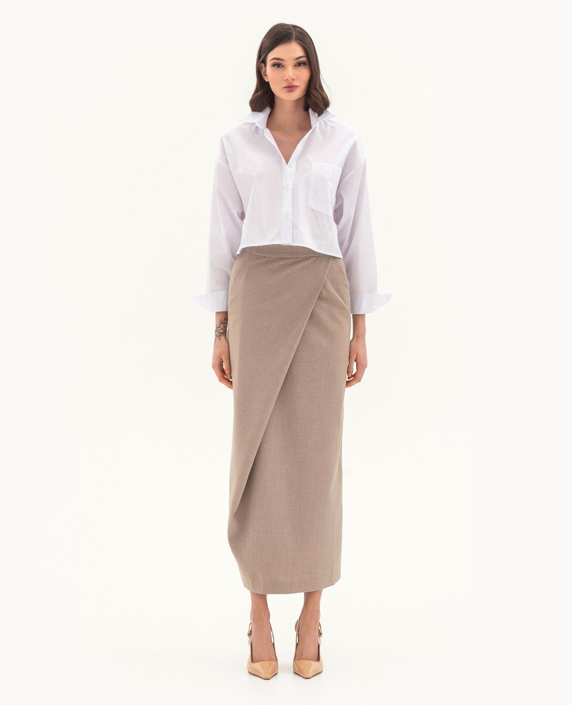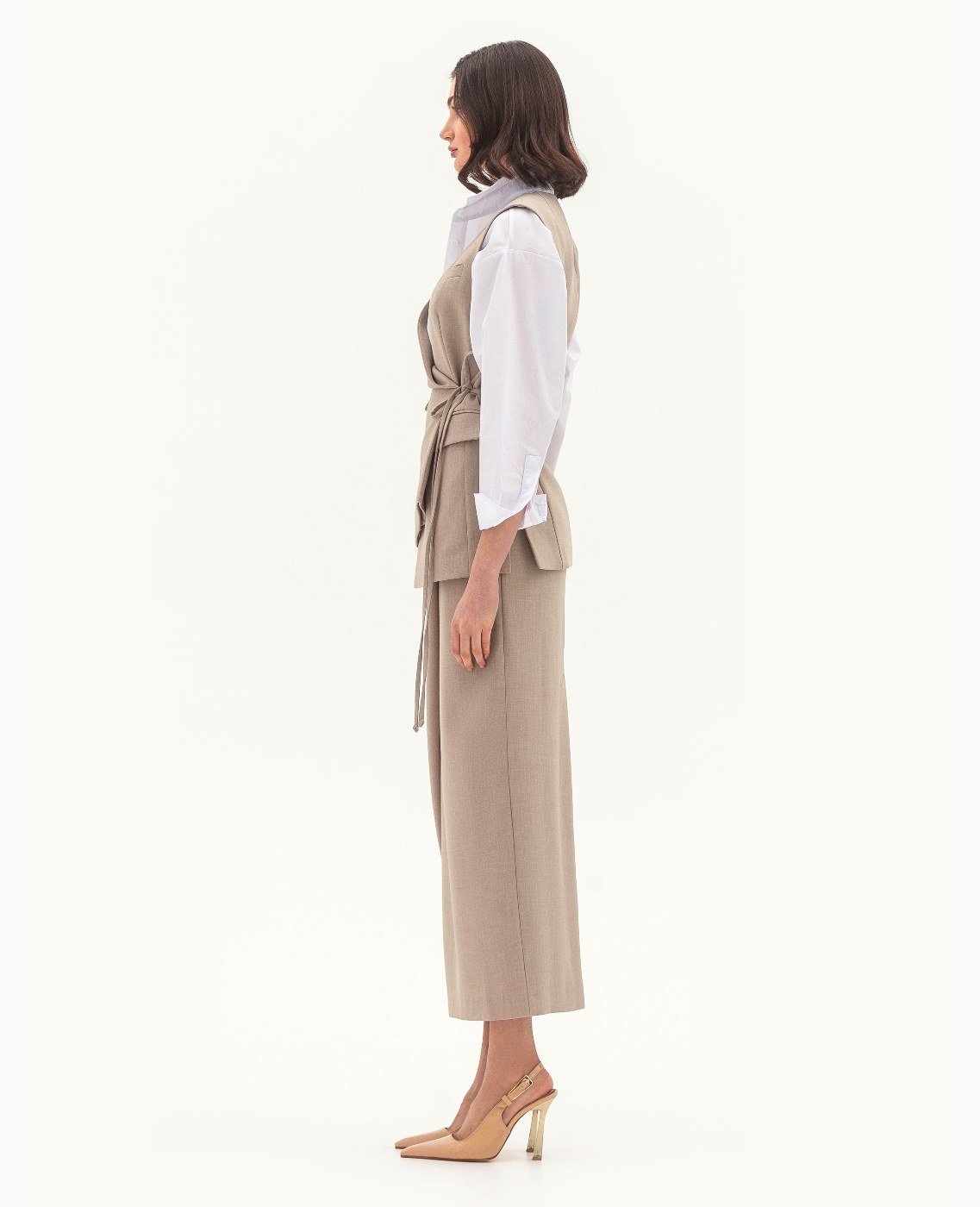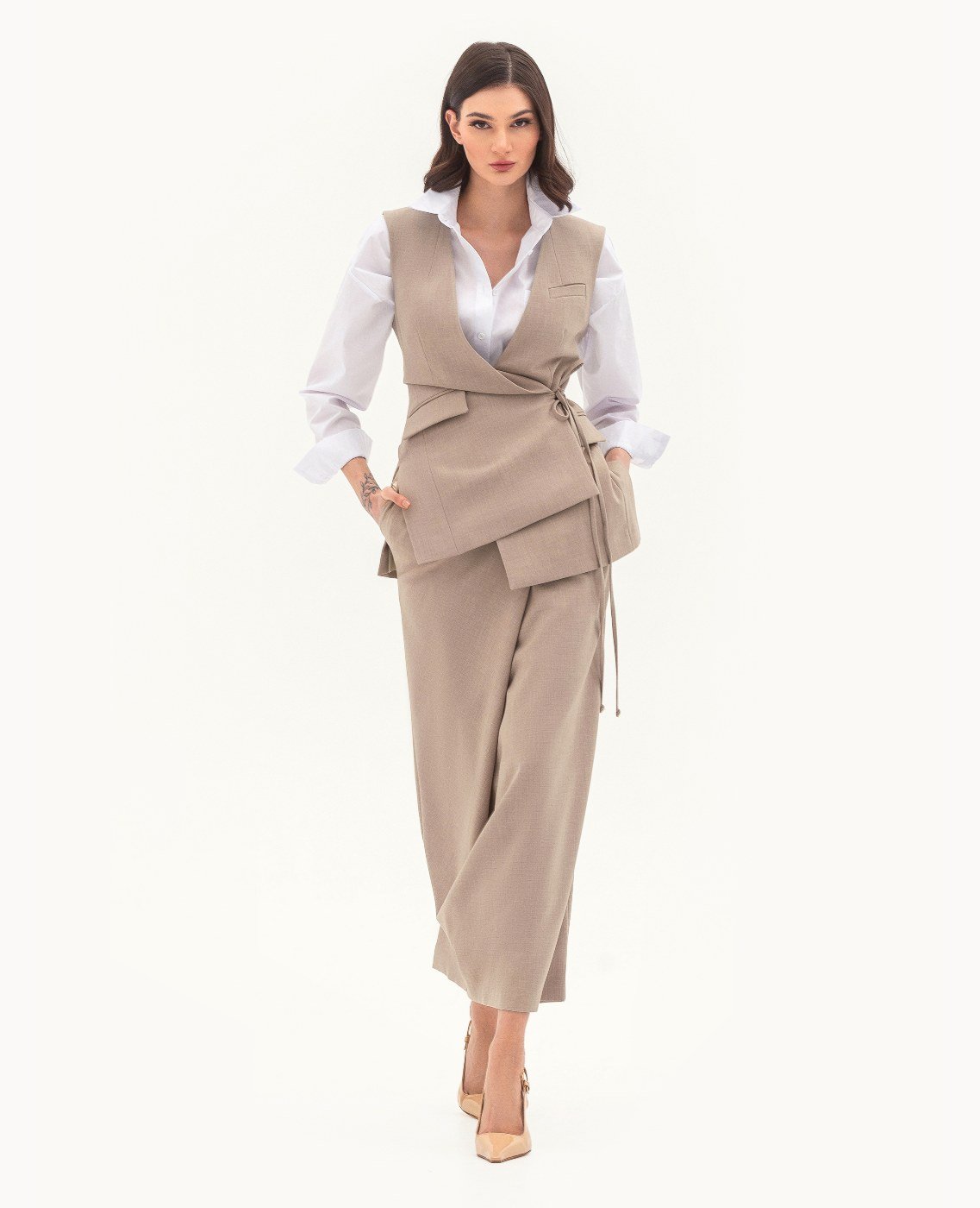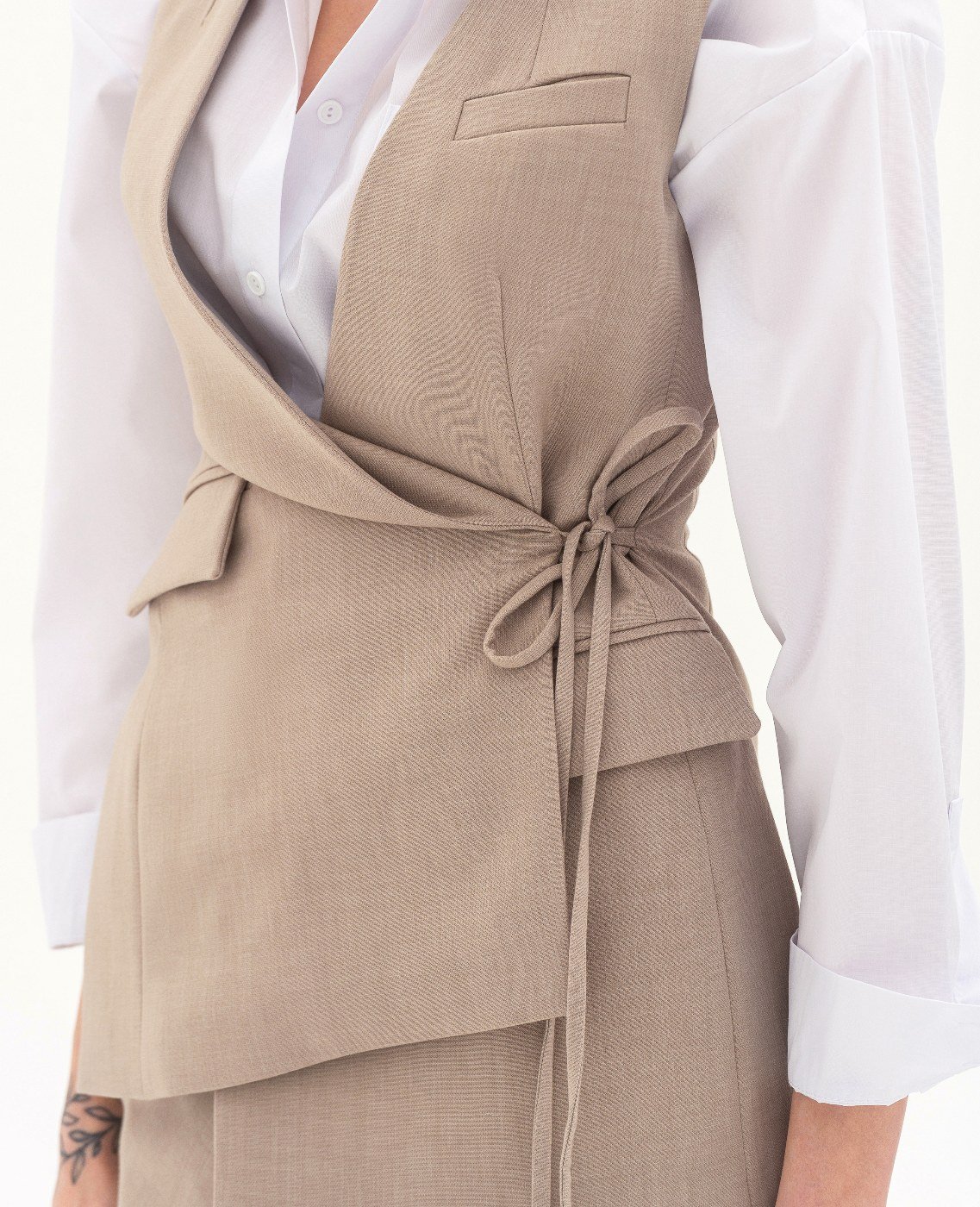 Вид изделия: комплект, состоящий из удлинённого жилета с асимметричными деталями на завязках-шнурках и разрезами по боковым швам, а также прямой юбки с акцентной деталью. Силуэт, длина: полуприлегающий, свободный; длина миди. Посадка по талии: классическая. Плотность и вид ткани: текстильный материал средней плотности с добавлением эластана. Вид застёжки: — жилет — шнурки-завязки; — юбка — молния и кнопка. Подкладка: присутствует. Карманы: — жилет — карманы в рамку с клапаном; — юбка — подкройные карманы. Вырез горловины: V-образный. Рукав: отсутствует (открытая пройма).