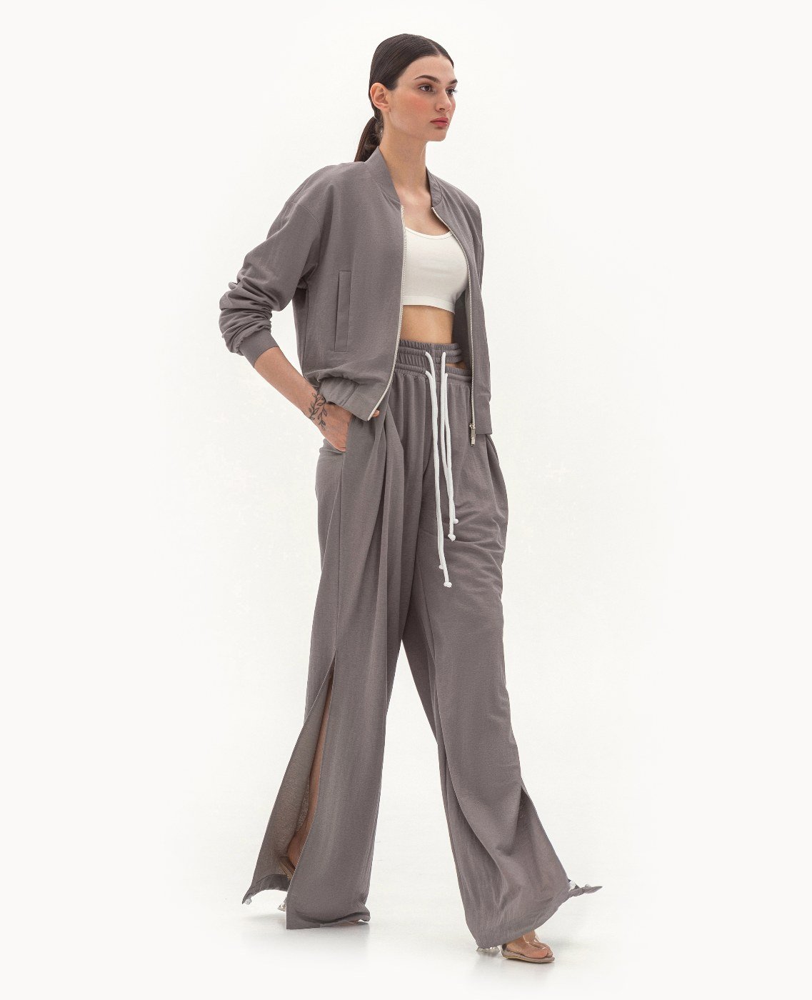 Вид изделия: летний комплект, состоящий из худи на металлической молнии, на резинке по низу и рукавам, и из брюк свободного, широкого кроя на двойном поясе с резинкой, с боковыми разрезами, кулиской по низу и декорированными шнурами контрастного цвета. Силуэт, длина: свободный. Посадка по линии талии: классическая. Плотность и вид ткани: тонкий, трикотажный материал с добавлением льна, хлопка и эластана. Вид застежки: молния в худи. Наличие подкладочной ткани: худи на подкладочной ткани. Наличие и вид карманов: карманы с листочкой, подкройные. Вырез горловины: стойка. Вид рукава: спущенный. Уход за изделием: Деликатная, быстрая, ручная стирка при 30 градусах, без использования агрессивных моющих средств. Размер изделия на фото: UA 40; еur 34; USA 2; INT XXS. Параметры модели на фотографии: Рост: 179см, ОГ — 89см, ОТ — 60см, ОБ — 89см.