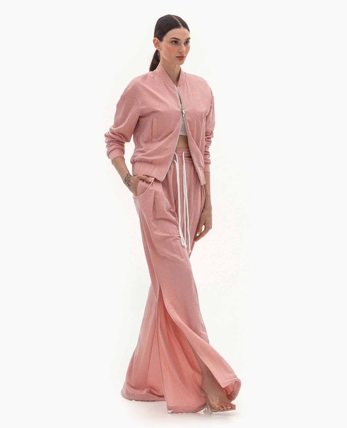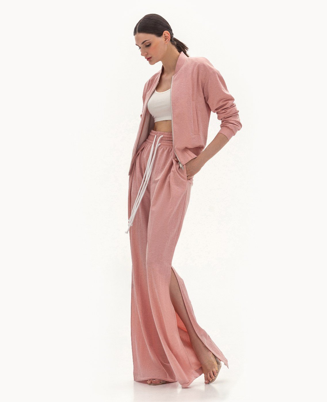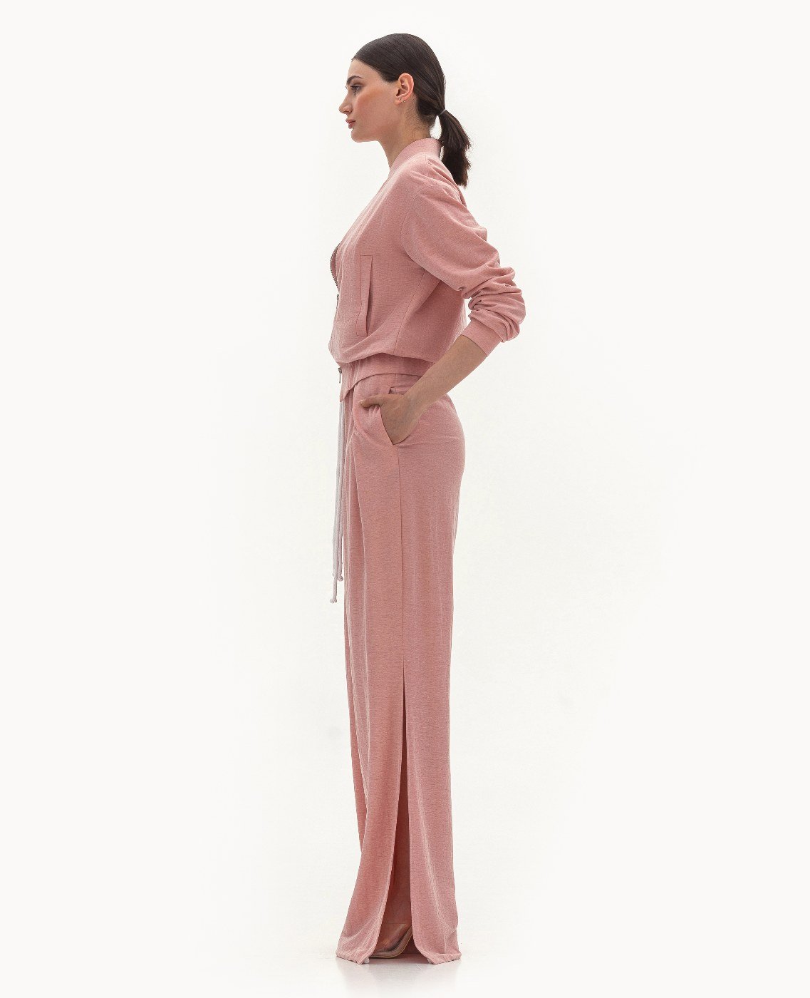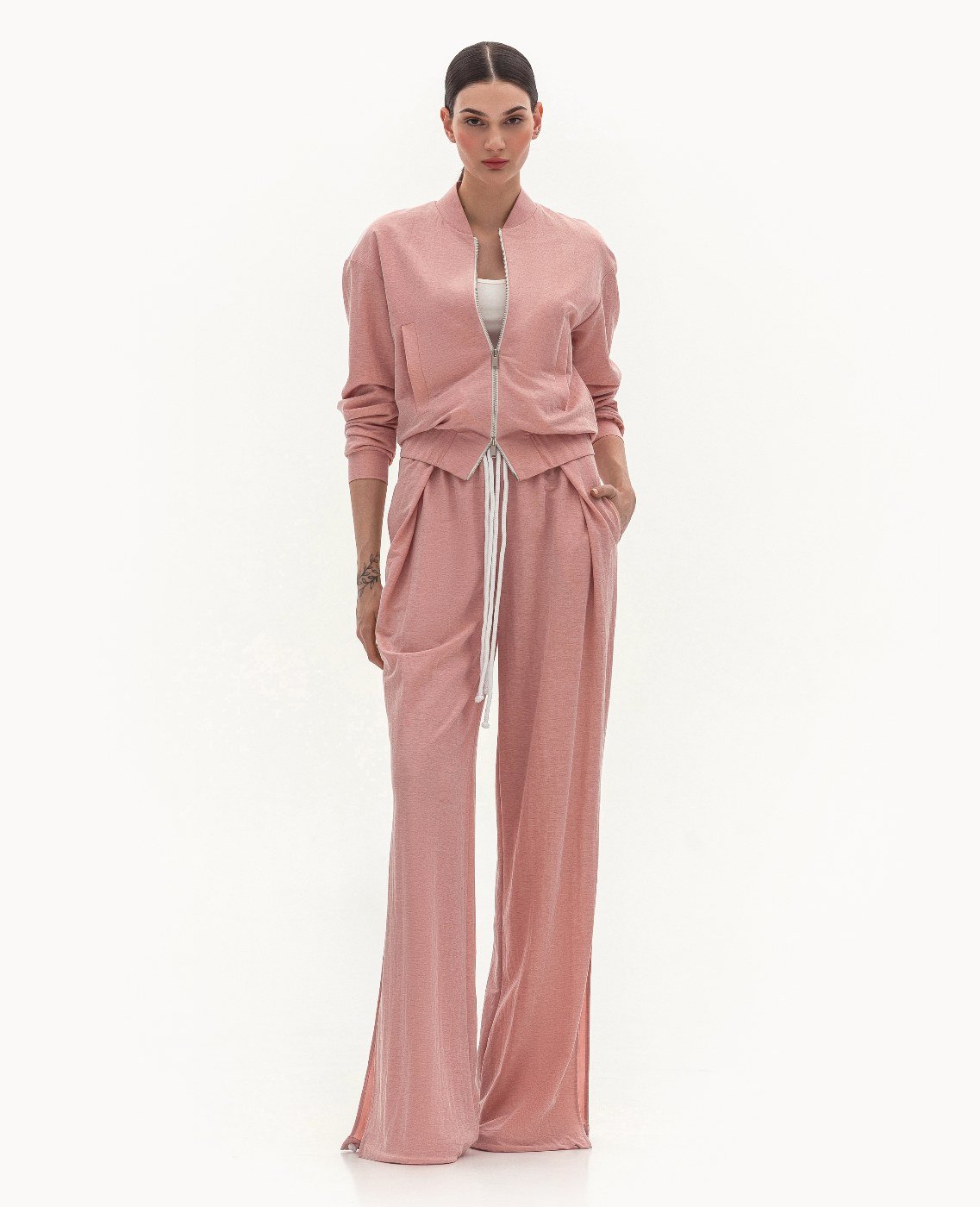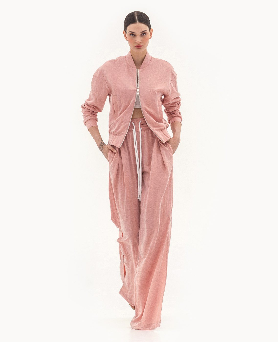 Вид изделия: летний комплект, состоящий из худи на металлической молнии, на резинке по низу и рукавам, и из брюк свободного, широкого кроя на двойном поясе с резинкой, с боковыми разрезами, кулиской по низу и декорированными шнурами контрастного цвета. Силуэт, длина: свободный. Посадка по линии талии: классическая. Плотность и вид ткани: тонкий, трикотажный материал с добавлением льна, хлопка и эластана. Вид застежки: молния в худи. Наличие подкладочной ткани: худи на подкладочной ткани. Наличие и вид карманов: карманы с листочкой, подкройные. Вырез горловины: стойка. Вид рукава: спущенный. Уход за изделием: Деликатная, быстрая, ручная стирка при 30 градусах, без использования агрессивных моющих средств. Размер изделия на фото: UA 40; еur 34; USA 2; INT XXS. Параметры модели на фотографии: Рост: 179см, ОГ — 89см, ОТ — 60см, ОБ — 89см.
