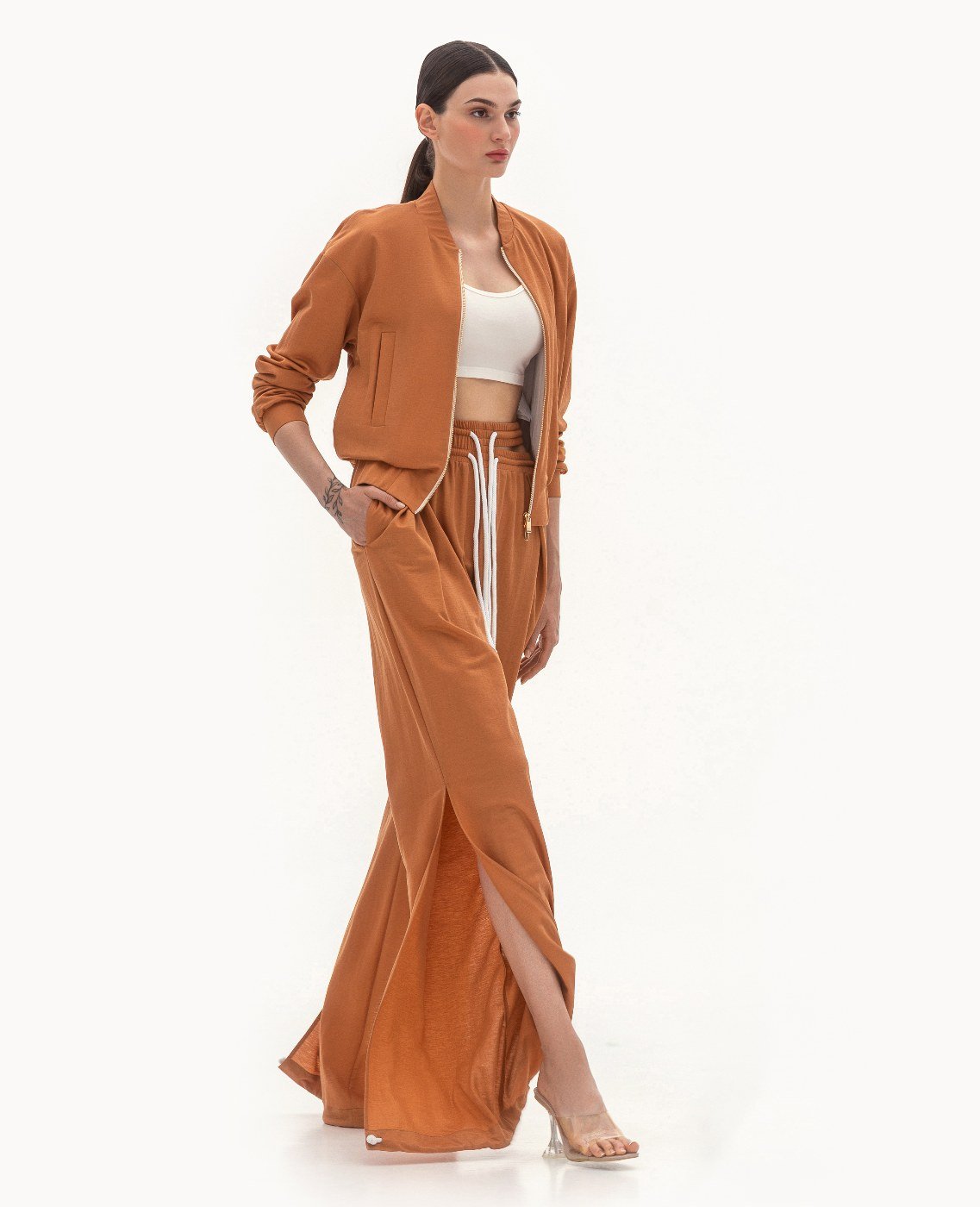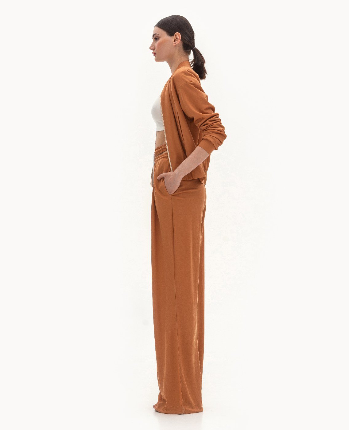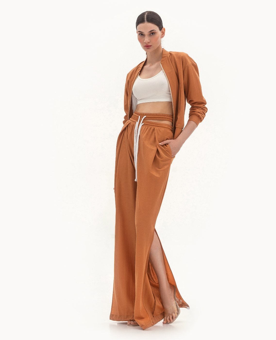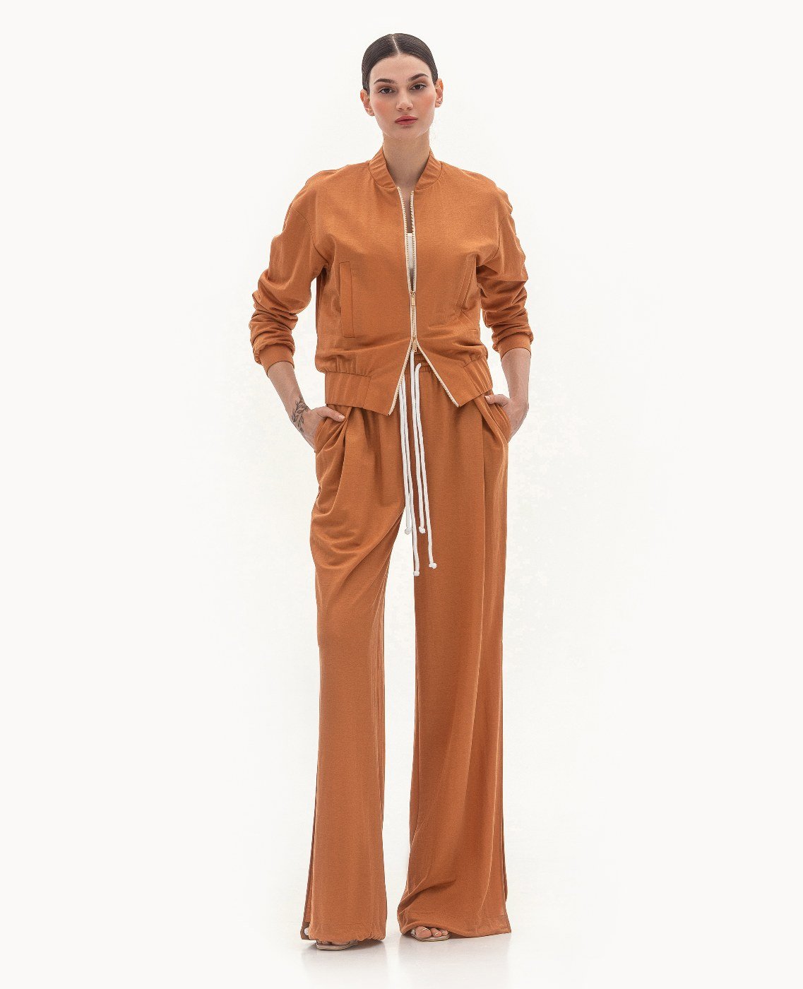 Вид изделия: летний комплект, состоящий из худи на металлической молнии, на резинке по низу и рукавам, и из брюк свободного, широкого кроя на двойном поясе с резинкой, с боковыми разрезами, кулиской по низу и декорированными шнурами контрастного цвета. Силуэт, длина: свободный. Посадка по линии талии: классическая. Плотность и вид ткани: тонкий, трикотажный материал с добавлением льна, хлопка и эластана. Вид застежки: молния в худи. Наличие подкладочной ткани: худи на подкладочной ткани. Наличие и вид карманов: карманы с листочкой, подкройные. Вырез горловины: стойка. Вид рукава: спущенный. Уход за изделием: Деликатная, быстрая, ручная стирка при 30 градусах, без использования агрессивных моющих средств. Размер изделия на фото: UA 40; еur 34; USA 2; INT XXS. Параметры модели на фотографии: Рост: 179см, ОГ — 89см, ОТ — 60см, ОБ — 89см.