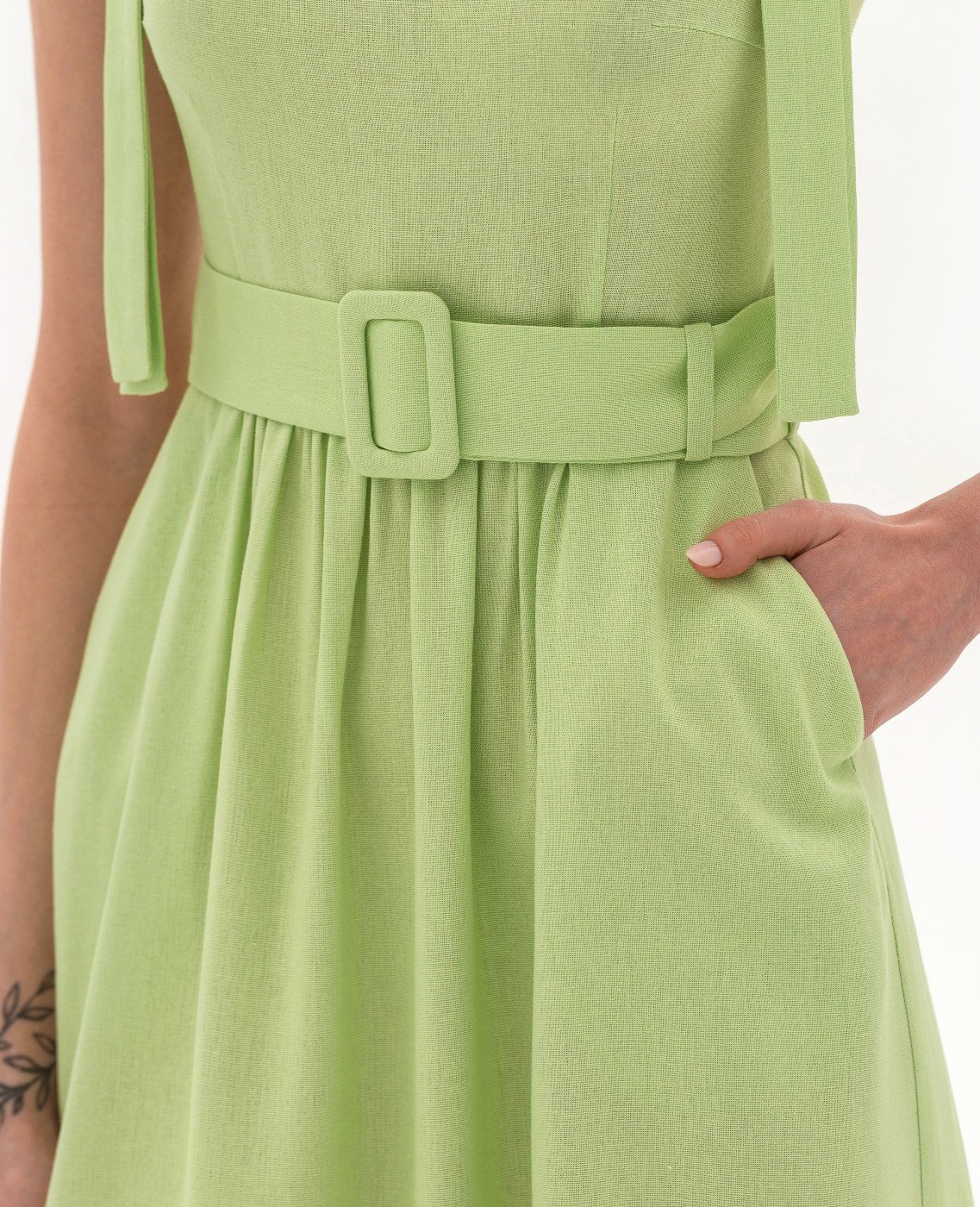 Вид изделия: летнее платье с отрезной линией талии, открытой проймой, декоративными элементами по плечам, с поясом на пряжке. Силуэт, длина: свободный, расклешенный, миди. Посадка по линии талии: классическая. Плотность и вид ткани: легкий, натуральный, текстильный материал. Вид застежки: молния. Наличие и вид карманов: подкройные. Уход за изделием: Деликатная, быстрая, ручная стирка при 30 градусах, без использования агрессивных моющих средств. Размер изделия на фото: UA 40; еur 34; USA 2; INT XXS. Параметры модели на фотографии: Рост: 179см, ОГ — 89см, ОТ — 60см, ОБ — 89см.