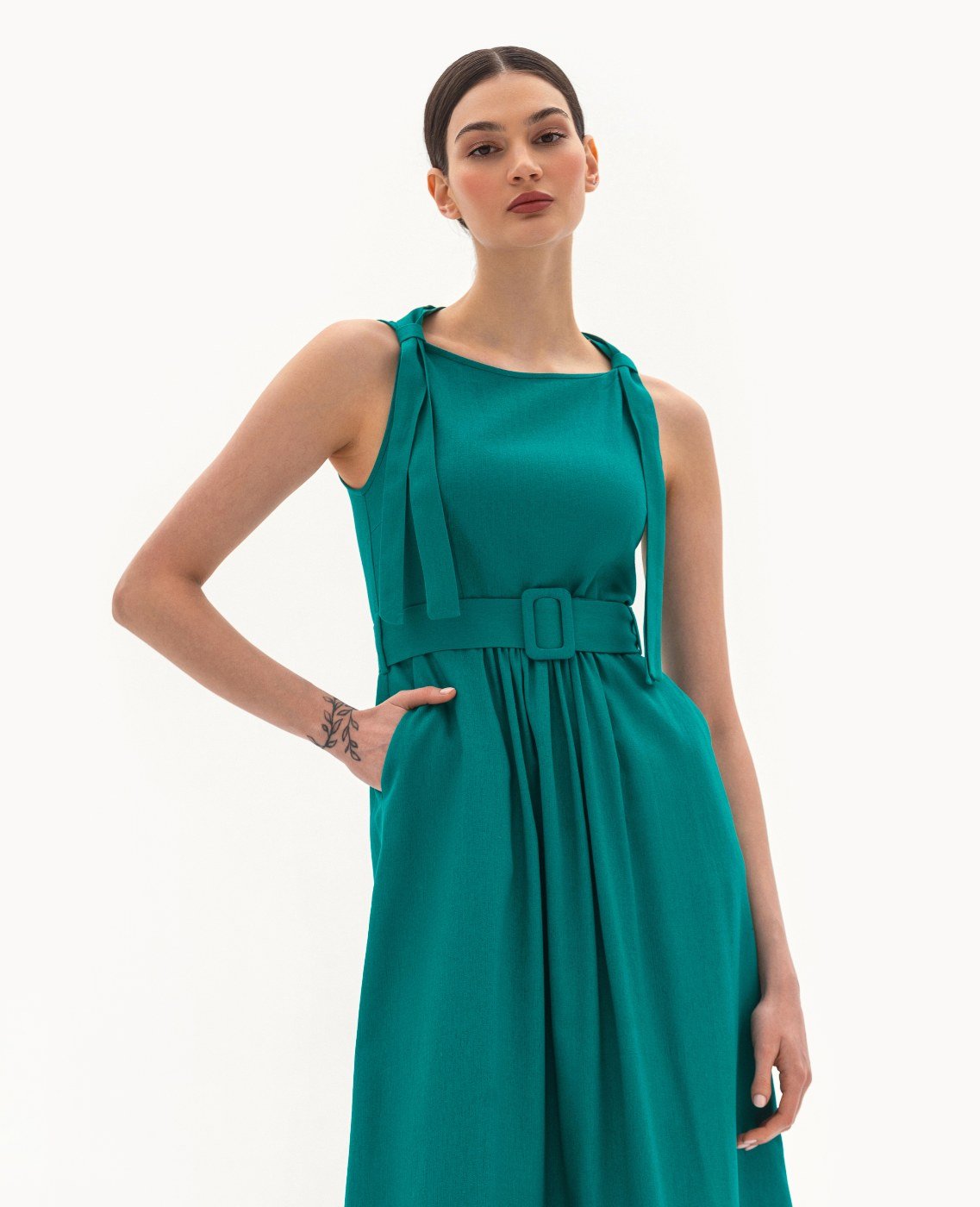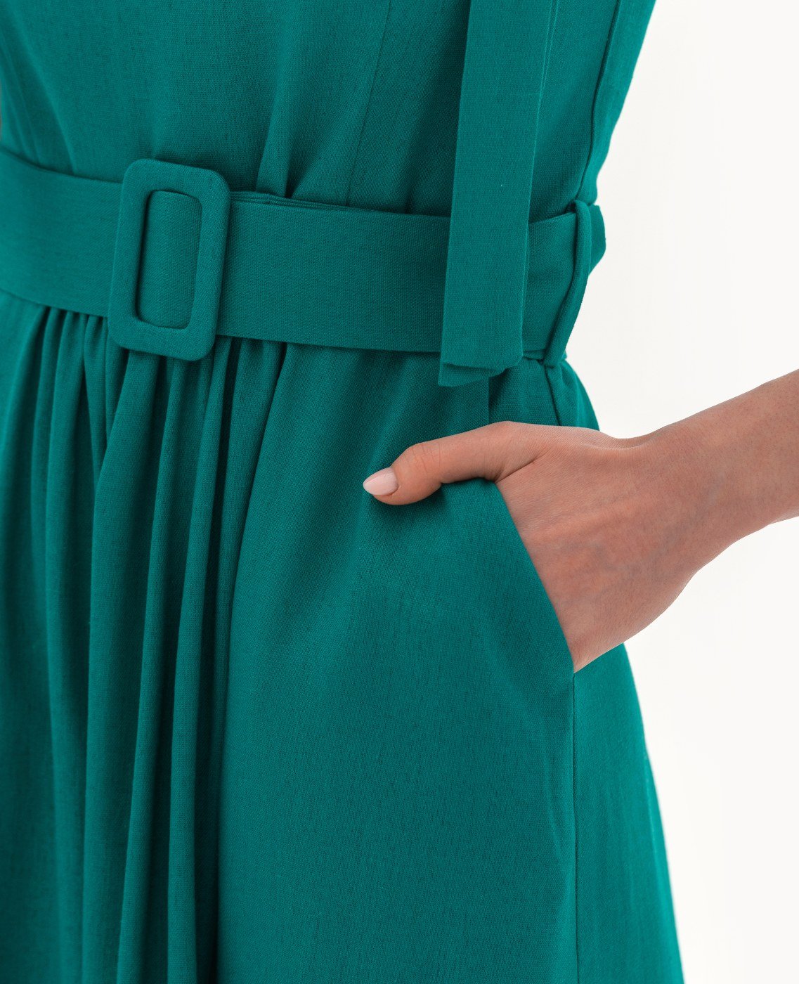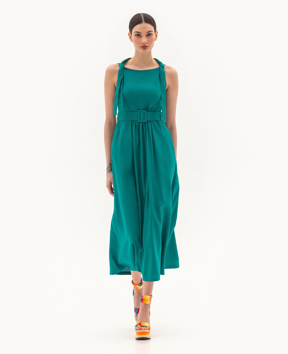 Вид изделия: летнее платье с отрезной линией талии, открытой проймой, декоративными элементами по плечам, с поясом на пряжке. Силуэт, длина: свободный, расклешенный, миди. Посадка по линии талии: классическая. Плотность и вид ткани: легкий, натуральный, текстильный материал. Вид застежки: молния. Наличие и вид карманов: подкройные. Уход за изделием: Деликатная, быстрая, ручная стирка при 30 градусах, без использования агрессивных моющих средств. Размер изделия на фото: UA 40; еur 34; USA 2; INT XXS. Параметры модели на фотографии: Рост: 179см, ОГ — 89см, ОТ — 60см, ОБ — 89см.