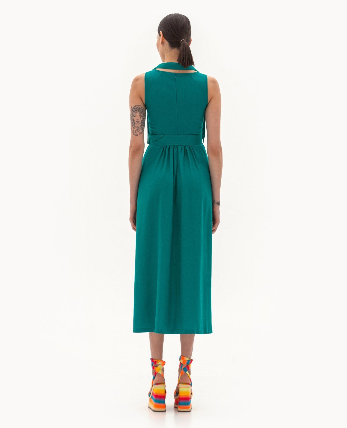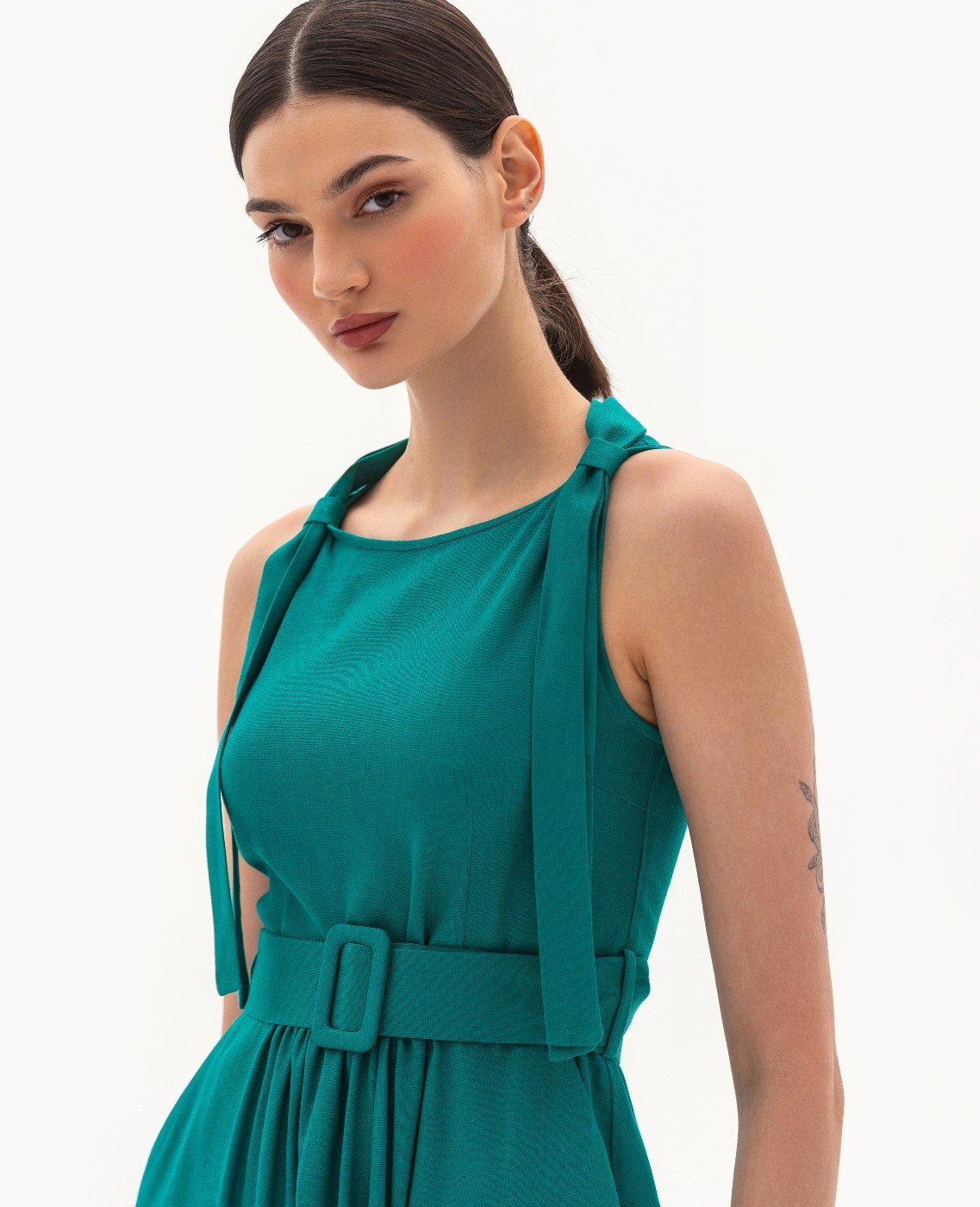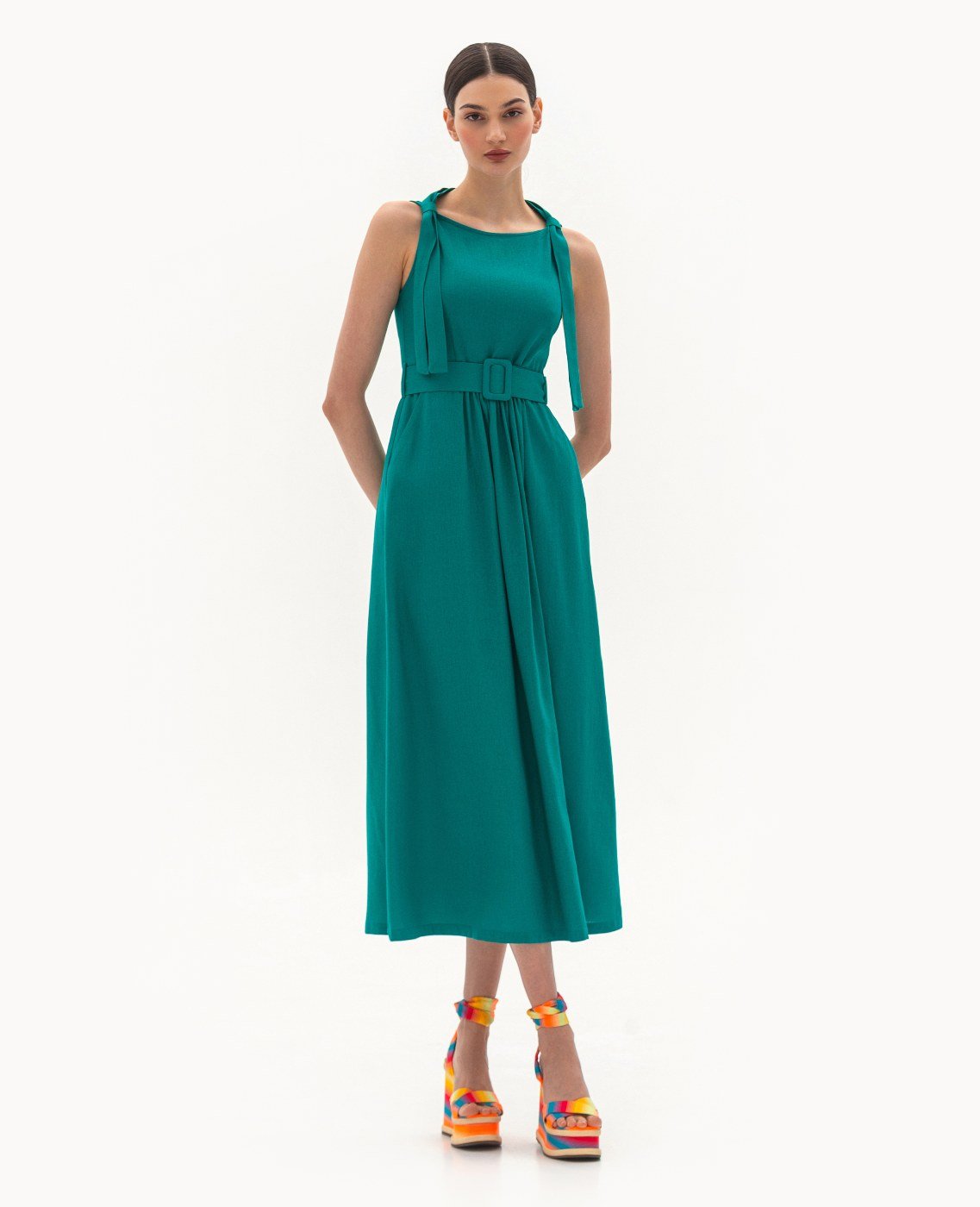 Вид изделия: летнее платье с отрезной линией талии, открытой проймой, декоративными элементами по плечам, с поясом на пряжке. Силуэт, длина: свободный, расклешенный, миди. Посадка по линии талии: классическая. Плотность и вид ткани: легкий, натуральный, текстильный материал. Вид застежки: молния. Наличие и вид карманов: подкройные. Уход за изделием: Деликатная, быстрая, ручная стирка при 30 градусах, без использования агрессивных моющих средств. Размер изделия на фото: UA 40; еur 34; USA 2; INT XXS. Параметры модели на фотографии: Рост: 179см, ОГ — 89см, ОТ — 60см, ОБ — 89см.
