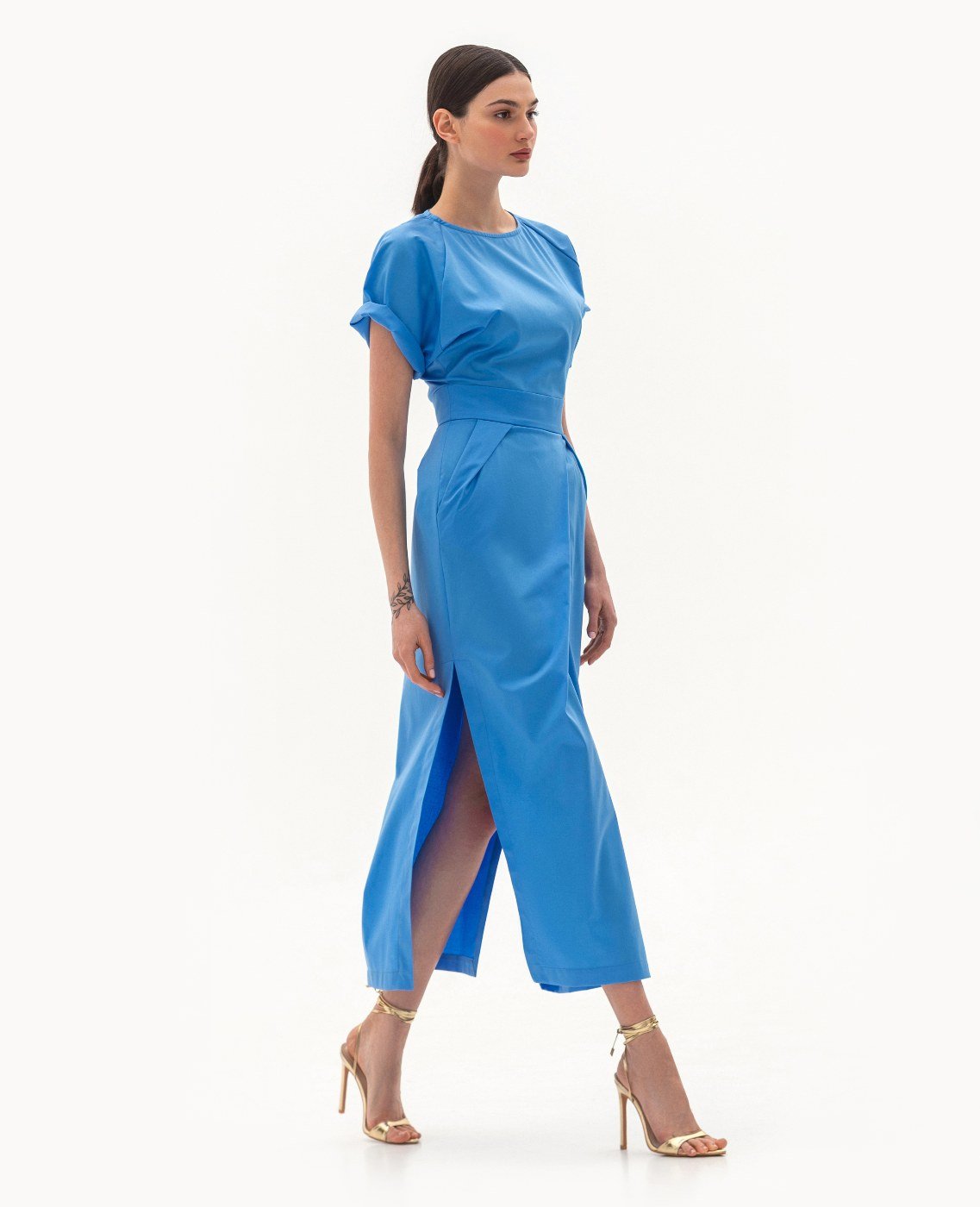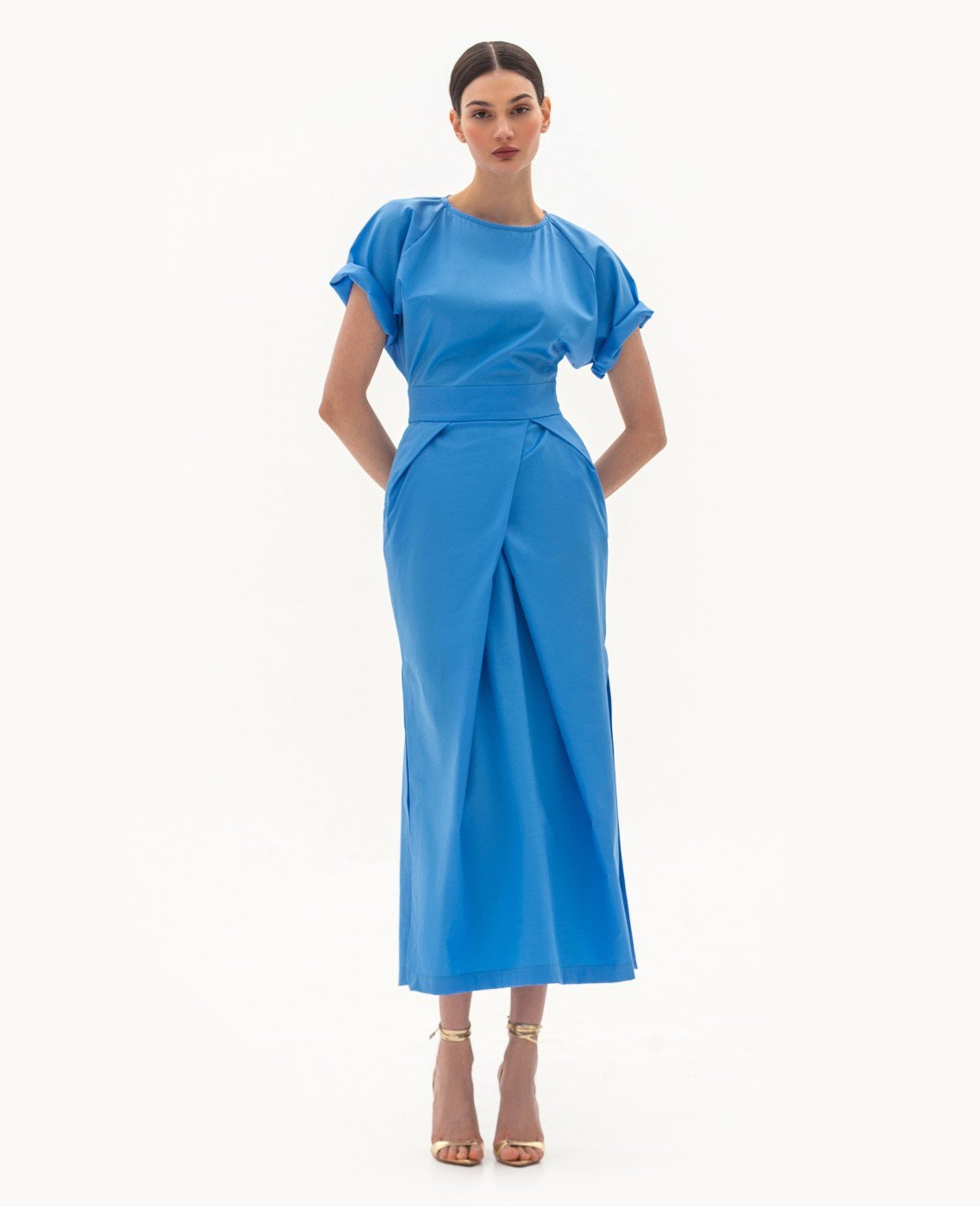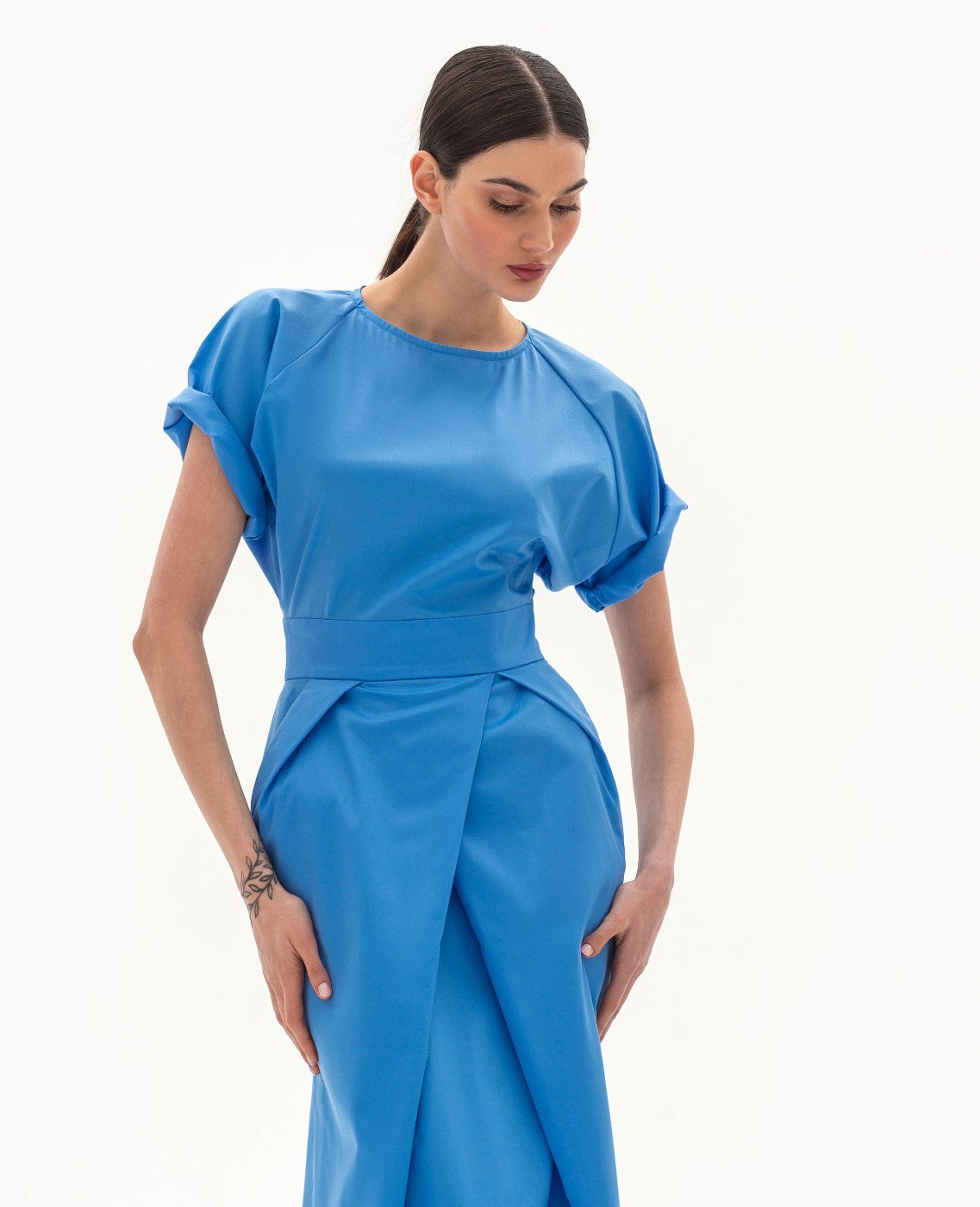 Вид изделия: платье в длине макси, с выделенной линией талии, объемным верхом и юбкой со складами, выложенными по косой линии. Силуэт: полуприлегающий, прямой. Вырез горловины: лодочка. Плотность и вид ткани: тонкий, хопковый, текстильный материал с добавлением эластана. Тип рукава: полуреглан. Вид застежки: потайная молния по боковому шву и кнопки по спинке до линии талии. Длина изделия: макси. Тип карманов: внутренние, подкройные. Уход за изделием: Деликатная, быстрая, ручная стирка при 30 градусах, без использования агрессивных моющих средств. Параметры модели на фотографии: Рост: 179см, ОГ — 89см, ОТ — 60см, ОБ — 89см.