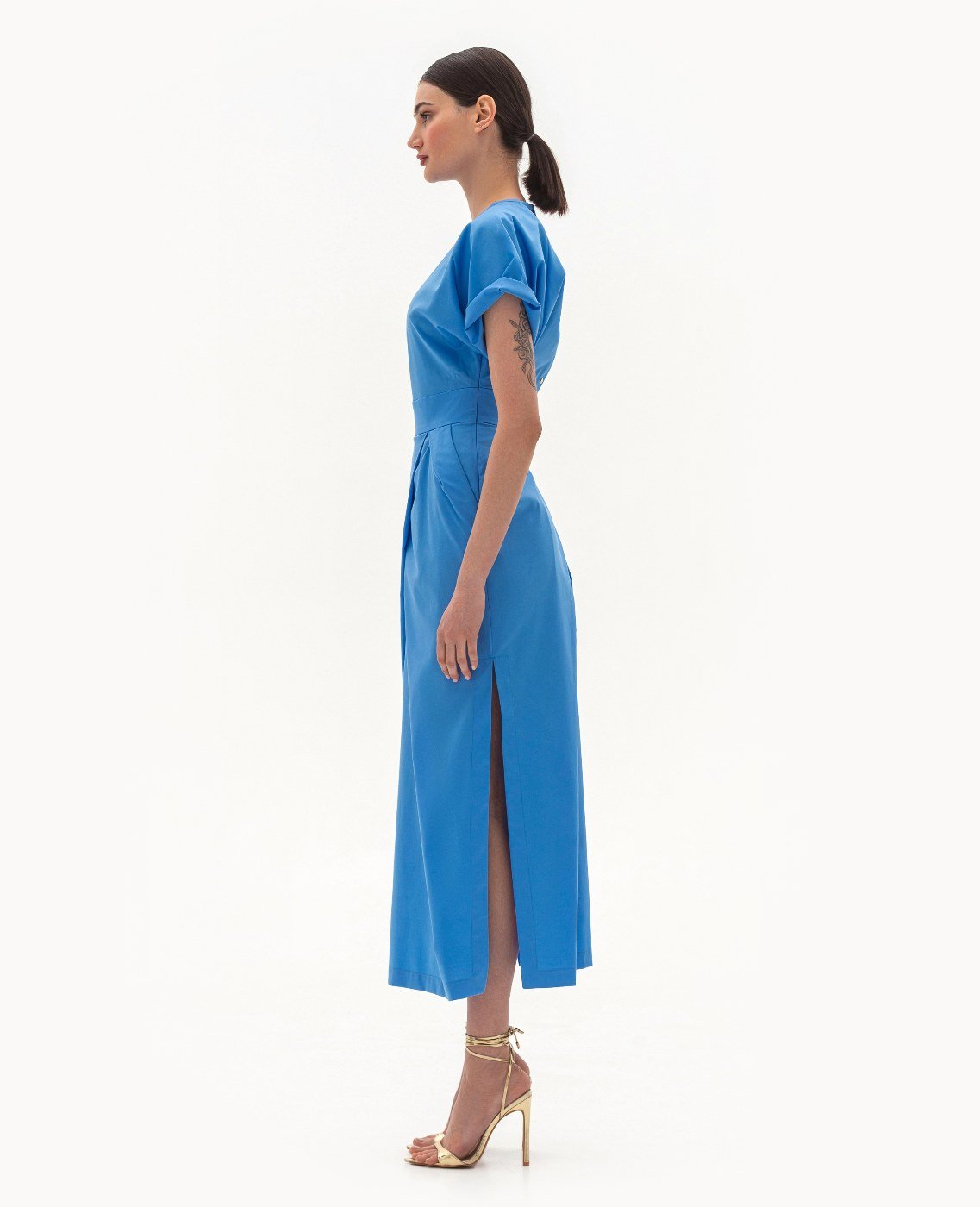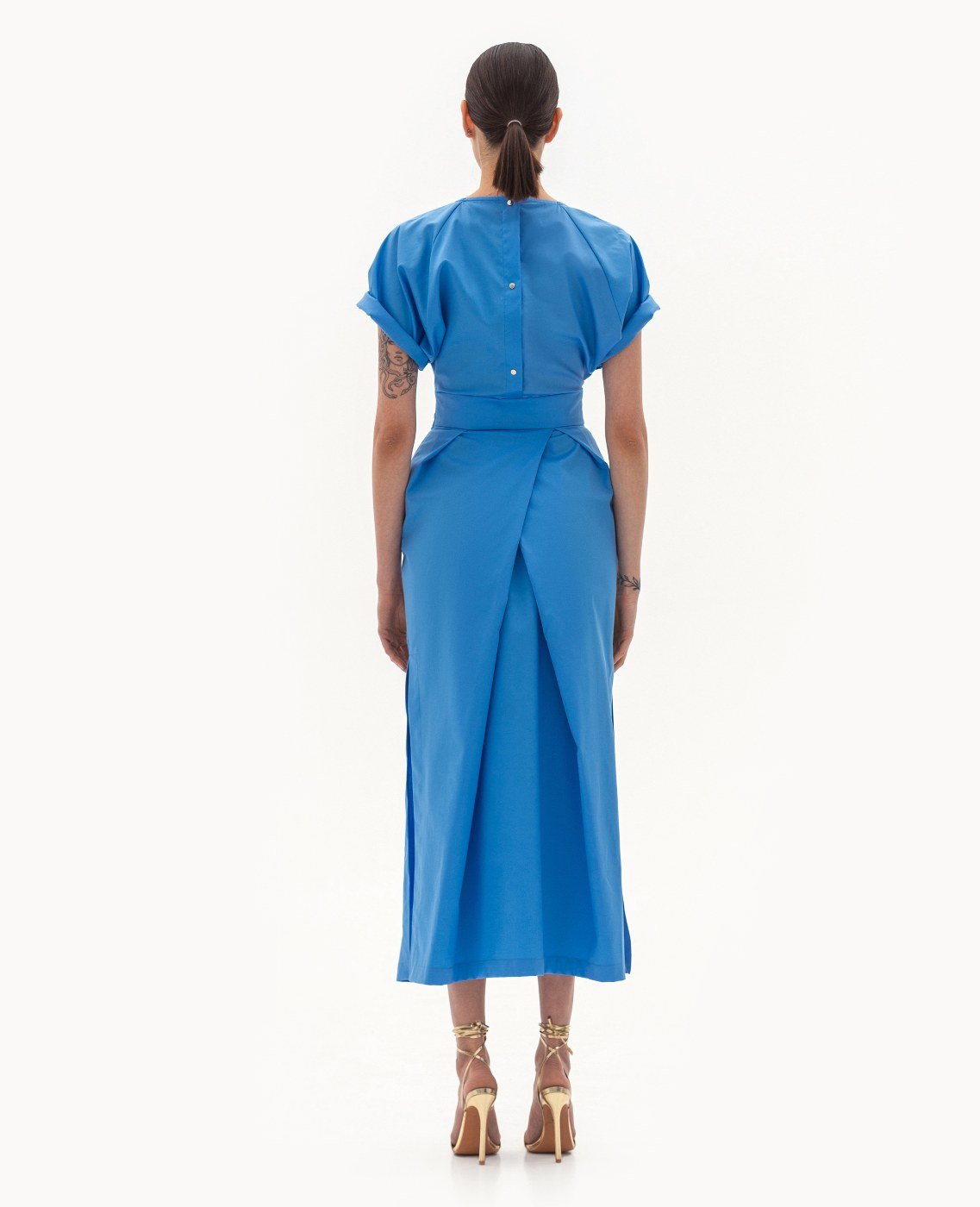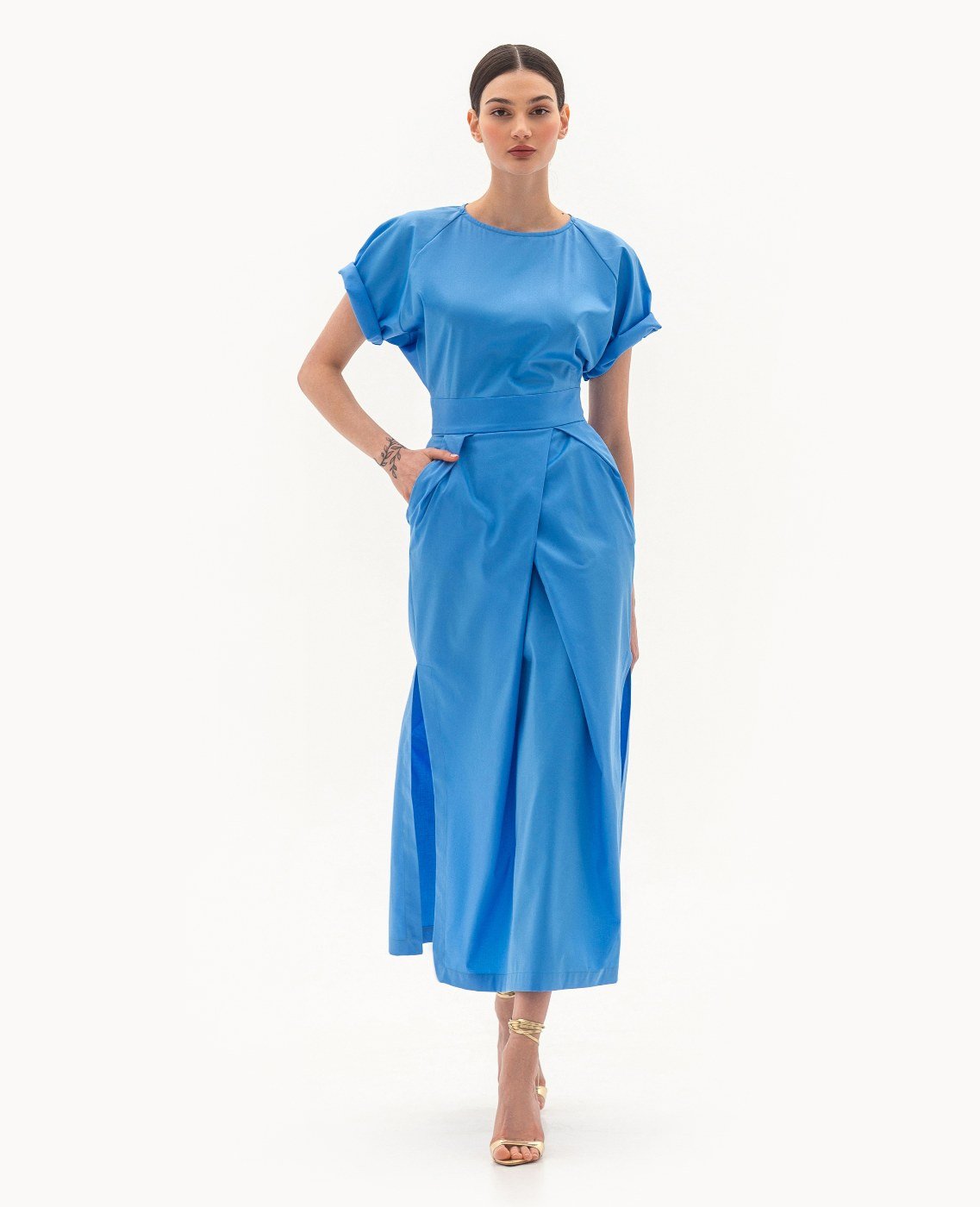 Вид изделия: платье в длине макси, с выделенной линией талии, объемным верхом и юбкой со складами, выложенными по косой линии. Силуэт: полуприлегающий, прямой. Вырез горловины: лодочка. Плотность и вид ткани: тонкий, хопковый, текстильный материал с добавлением эластана. Тип рукава: полуреглан. Вид застежки: потайная молния по боковому шву и кнопки по спинке до линии талии. Длина изделия: макси. Тип карманов: внутренние, подкройные. Уход за изделием: Деликатная, быстрая, ручная стирка при 30 градусах, без использования агрессивных моющих средств. Параметры модели на фотографии: Рост: 179см, ОГ — 89см, ОТ — 60см, ОБ — 89см.
