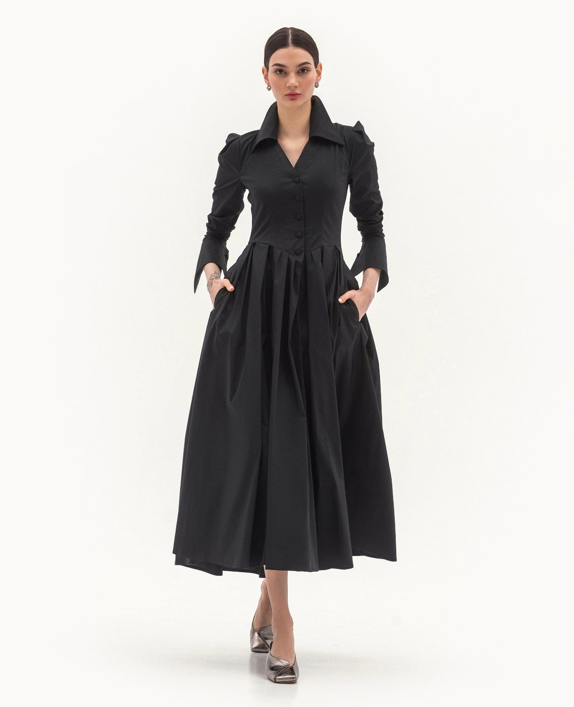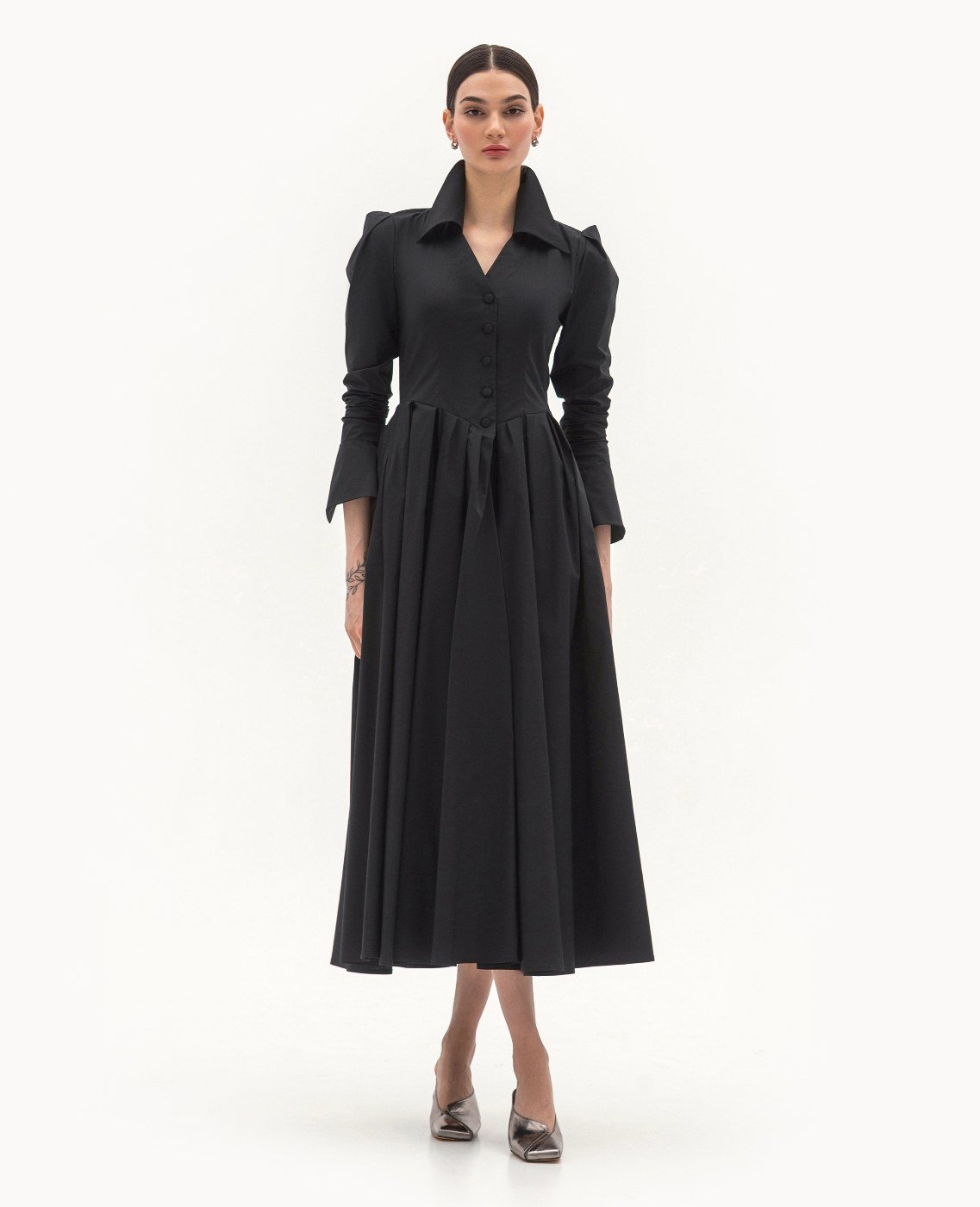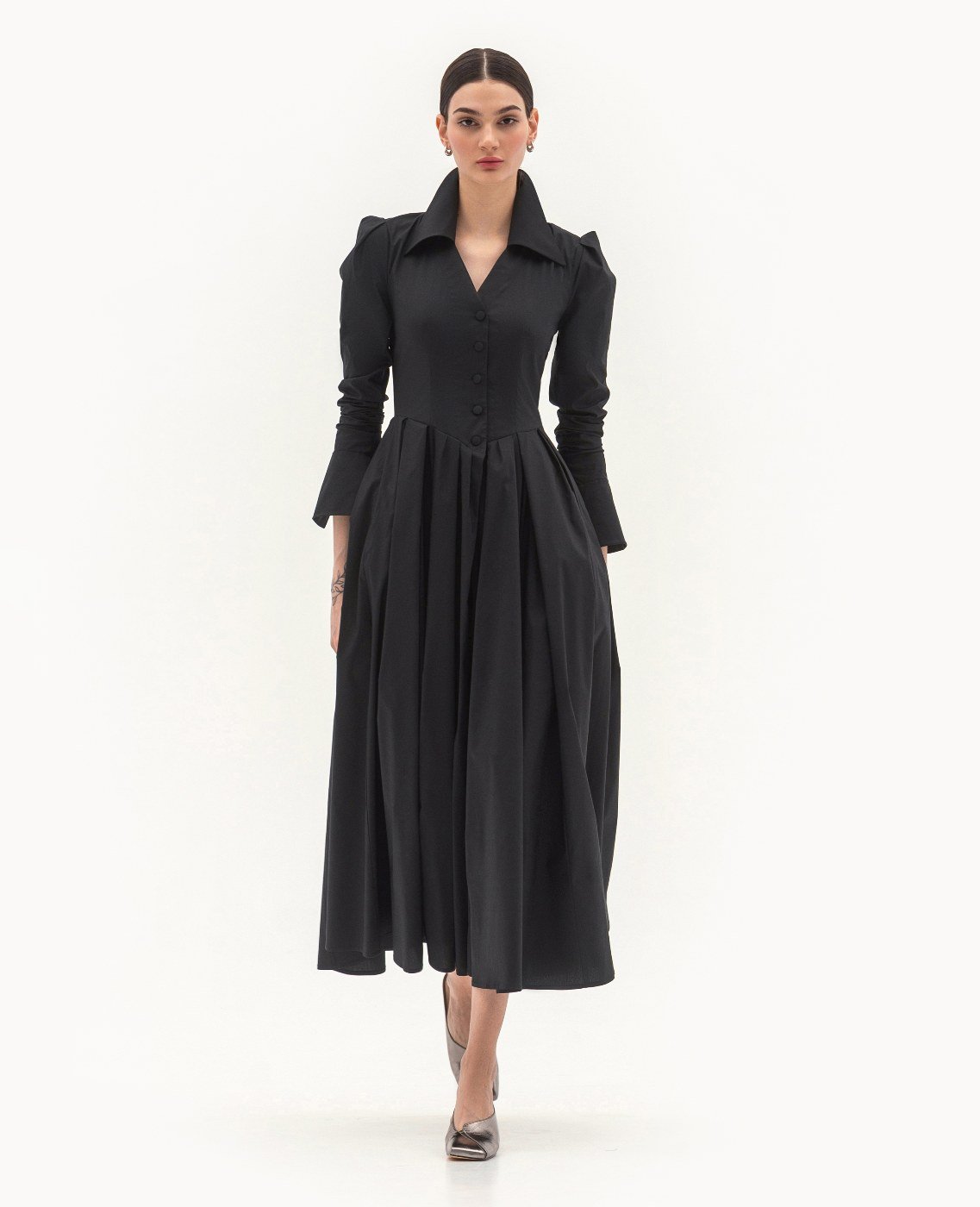 Вид изделия: расклешенное платье в винтажном стиле, с многочисленными складами по линии талии, отлетным воротником, и акцентными рукавами. Силуэт, длина: свободный, приталенный, расклешенный. Посадка по линии талии: классическая. Плотность и вид ткани: неплотный, хлопковый материал. Вид застежки: пуговицы. Наличие подкладочной ткани: отсутствует. Наличие и вид карманов: в боковых швах. Вырез горловины: V — образный. Вид рукава: втачной, со складами по окату рукава, с манжетой по низу. Уход за изделием: Деликатная, быстрая, ручная стирка при 30 градусах, без использования агрессивных моющих средств. Размер изделия на фото: UA 40; еur 34; USA 2; INT XXS. Параметры модели на фотографии: Рост: 179см, ОГ — 89см, ОТ — 60см, ОБ — 89см.