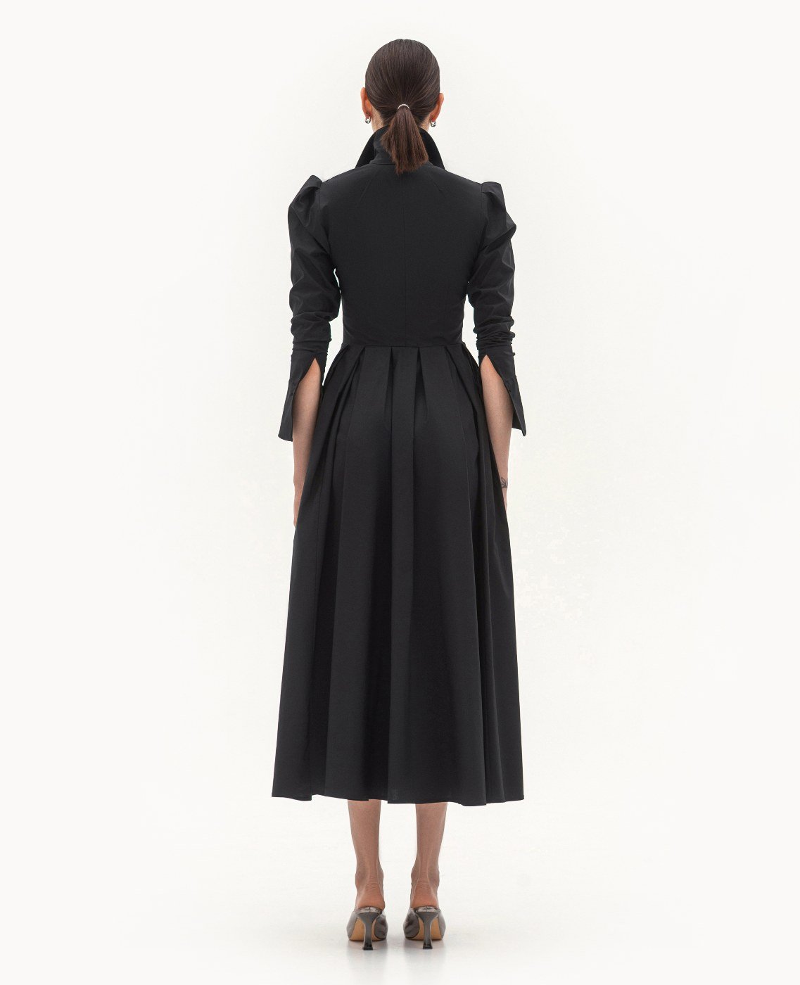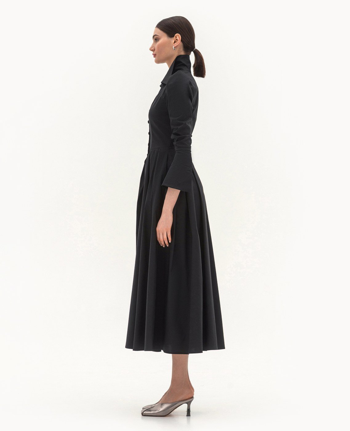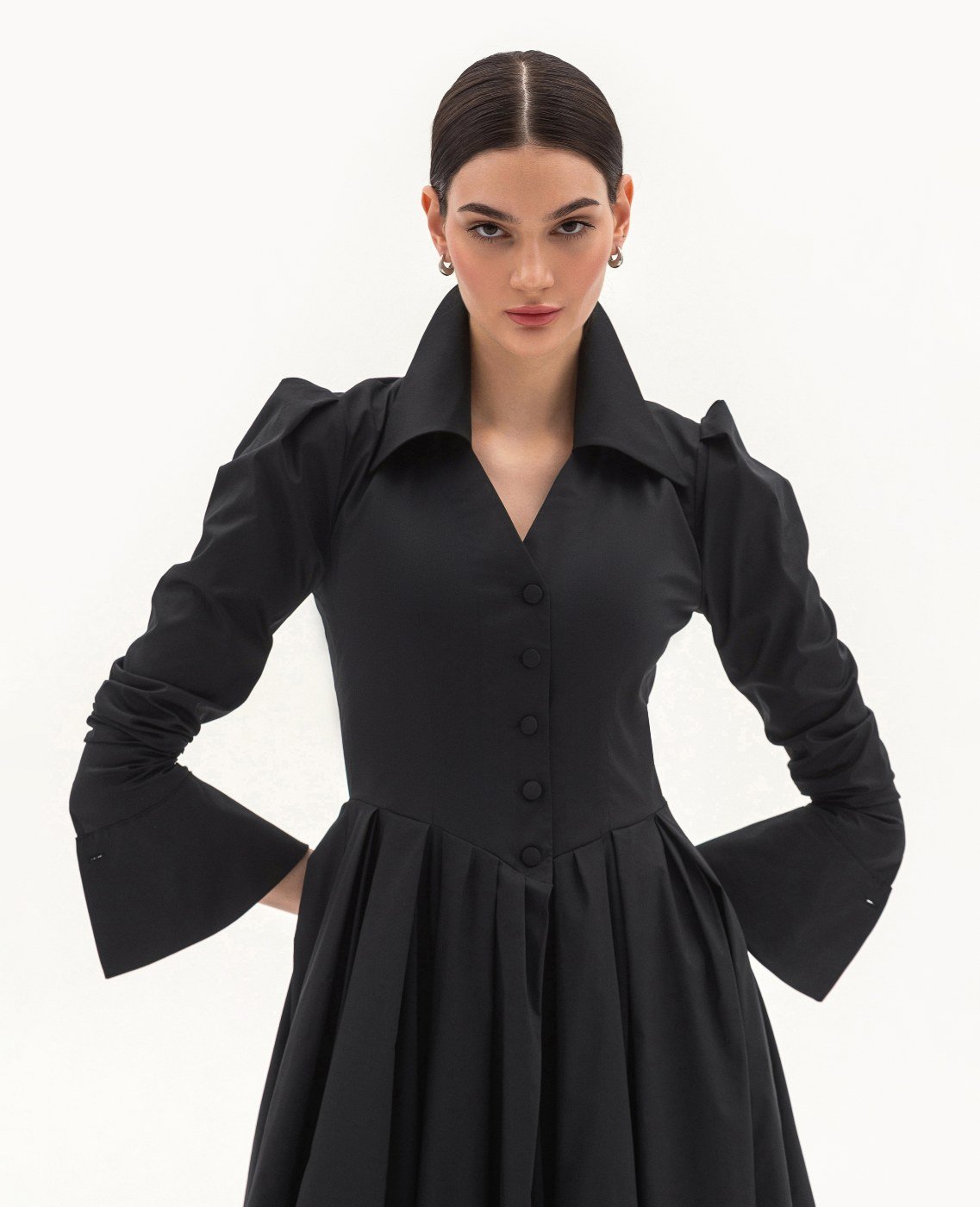 Вид изделия: расклешенное платье в винтажном стиле, с многочисленными складами по линии талии, отлетным воротником, и акцентными рукавами. Силуэт, длина: свободный, приталенный, расклешенный. Посадка по линии талии: классическая. Плотность и вид ткани: неплотный, хлопковый материал. Вид застежки: пуговицы. Наличие подкладочной ткани: отсутствует. Наличие и вид карманов: в боковых швах. Вырез горловины: V — образный. Вид рукава: втачной, со складами по окату рукава, с манжетой по низу. Уход за изделием: Деликатная, быстрая, ручная стирка при 30 градусах, без использования агрессивных моющих средств. Размер изделия на фото: UA 40; еur 34; USA 2; INT XXS. Параметры модели на фотографии: Рост: 179см, ОГ — 89см, ОТ — 60см, ОБ — 89см.
