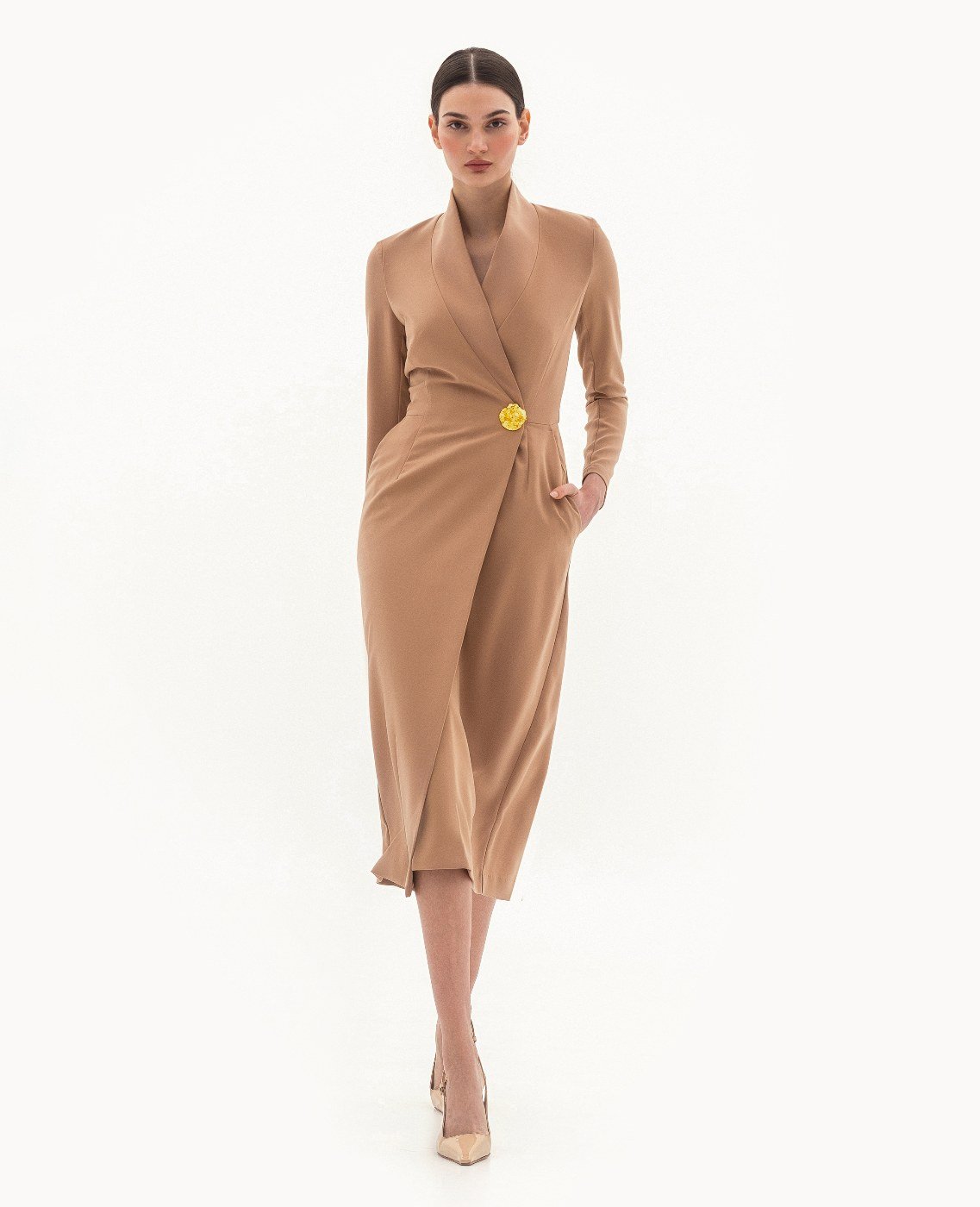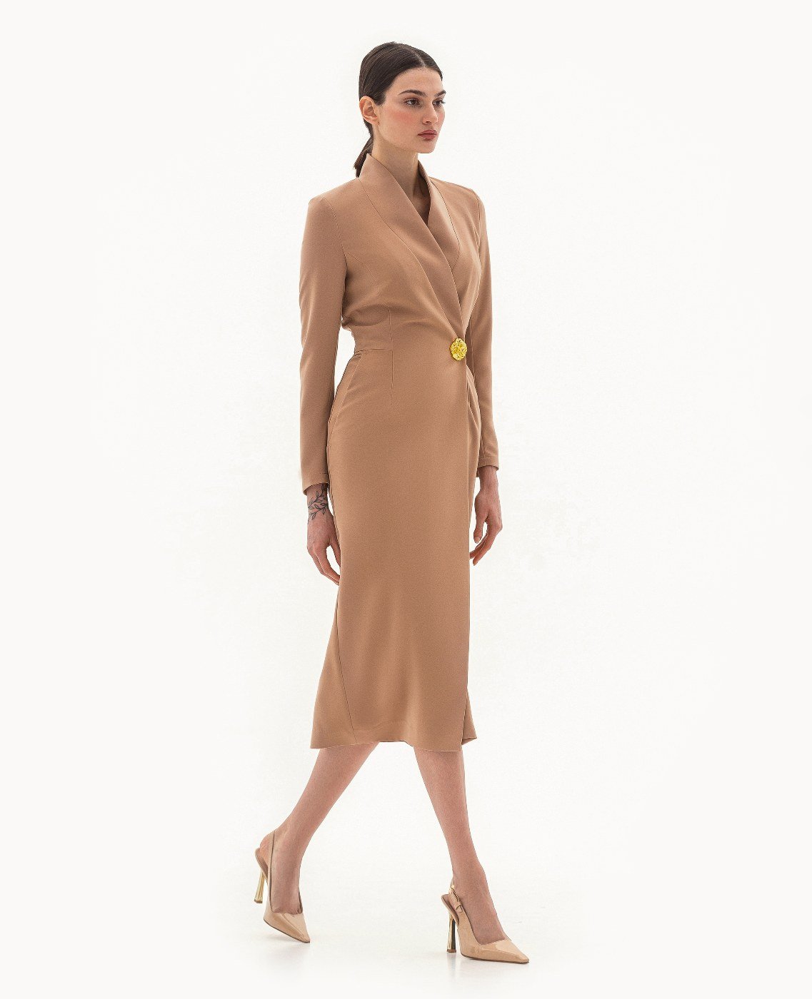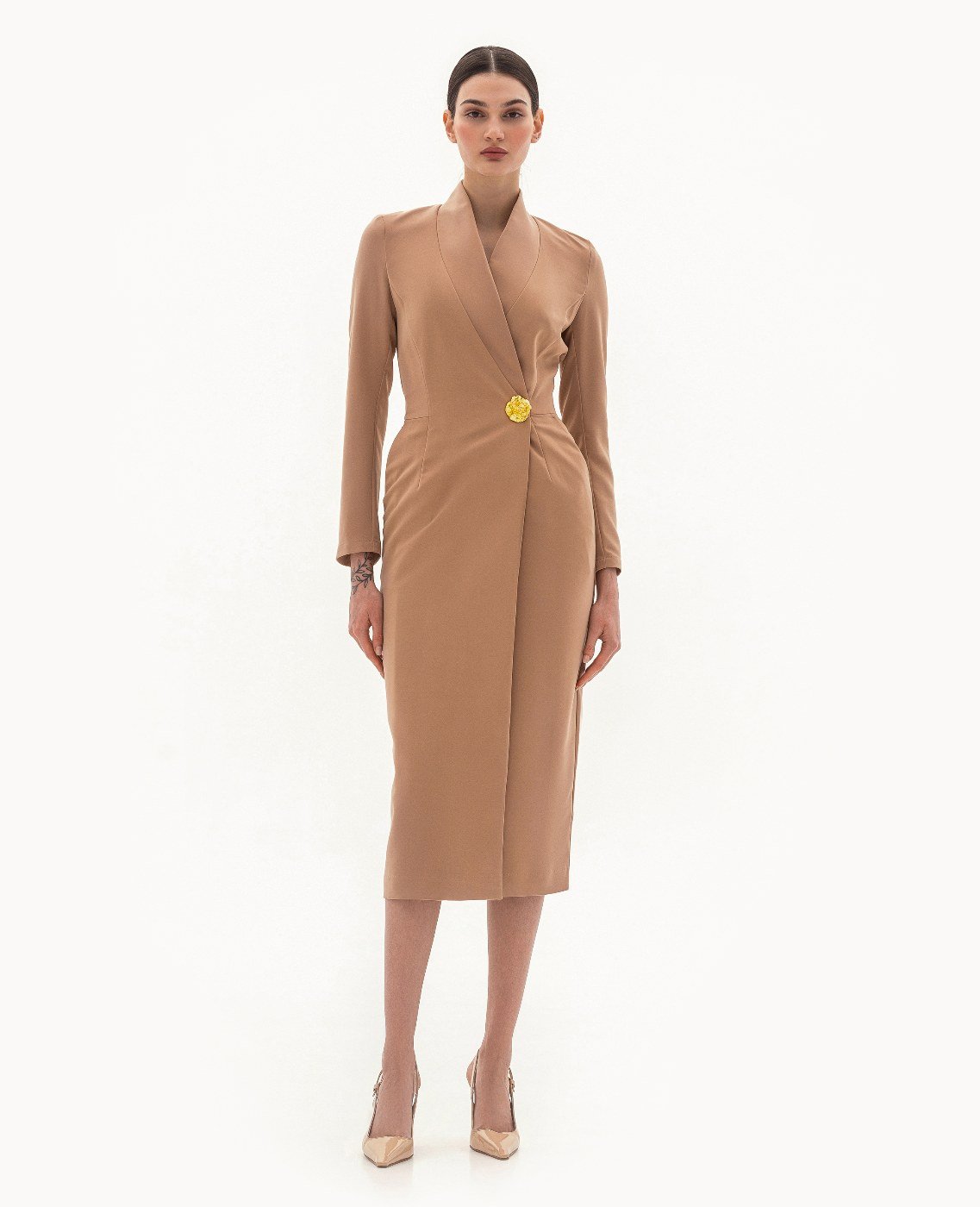 Вид изделия: прямое, двубортное платье, с акцентным декором в виде металлической кнопки/застежки по борту, с удлиненной верхней частью до линии талии для создания визуального эффекта «напуска». Силуэт, длина: прямой, полуприлегающий, в длине миди. Посадка по линии талии: классическая. Плотность и вид ткани: средней плотности, текстильный материал. Вид застежки: кнопка, пуговица. Наличие подкладочной ткани: присутствует. Наличие и вид карманов: подкройные, в боковых швах. Вырез горловины: V — образный. Вид рукава: втачной, трехшовный, с плечевой накладкой. Уход за изделием: Деликатная, быстрая, ручная стирка при 30 градусах, без использования агрессивных моющих средств. Размер изделия на фото: UA 40; еur 34; USA 2; INT XXS. Параметры модели на фотографии: Рост: 179см, ОГ — 89см, ОТ — 60см, ОБ — 89см.