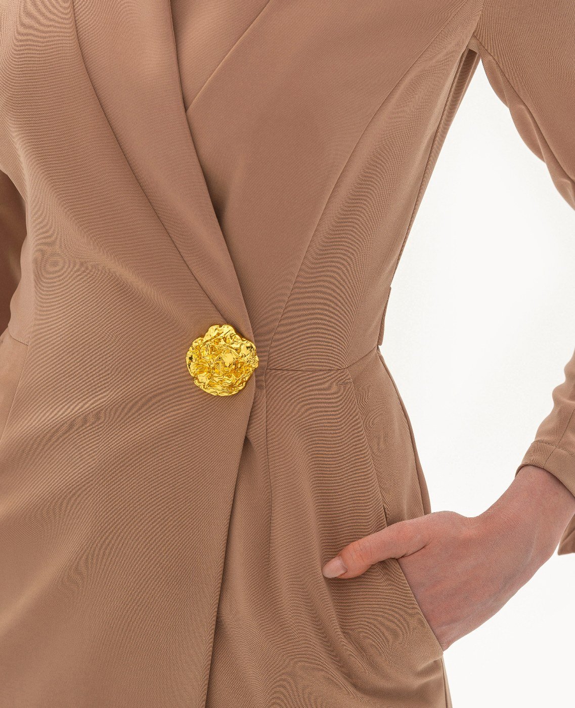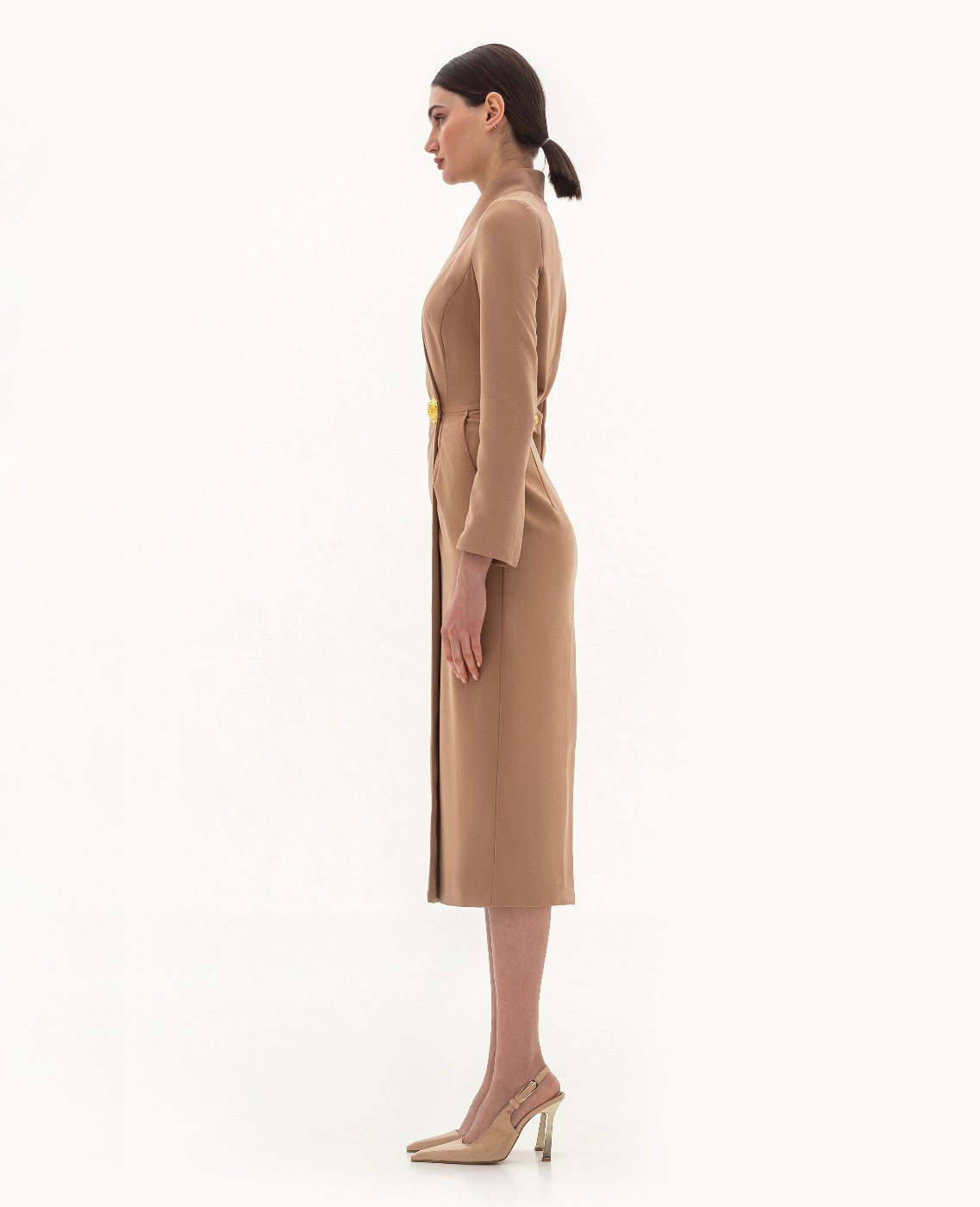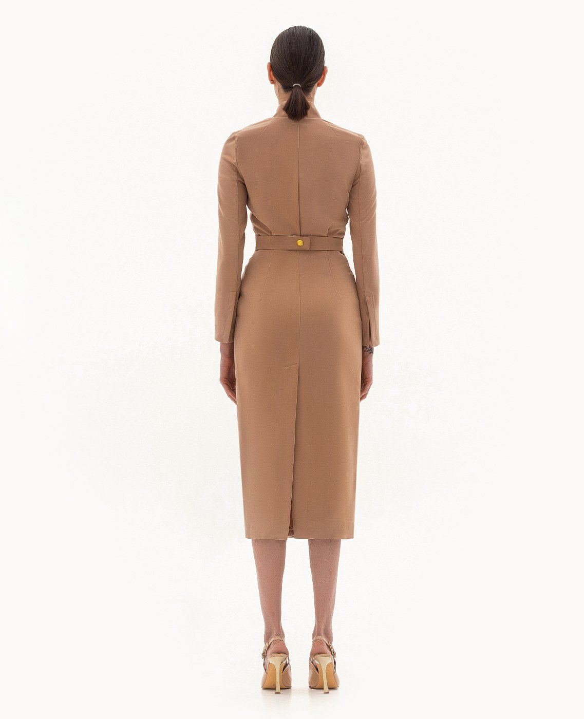 Вид изделия: прямое, двубортное платье, с акцентным декором в виде металлической кнопки/застежки по борту, с удлиненной верхней частью до линии талии для создания визуального эффекта «напуска». Силуэт, длина: прямой, полуприлегающий, в длине миди. Посадка по линии талии: классическая. Плотность и вид ткани: средней плотности, текстильный материал. Вид застежки: кнопка, пуговица. Наличие подкладочной ткани: присутствует. Наличие и вид карманов: подкройные, в боковых швах. Вырез горловины: V — образный. Вид рукава: втачной, трехшовный, с плечевой накладкой. Уход за изделием: Деликатная, быстрая, ручная стирка при 30 градусах, без использования агрессивных моющих средств. Размер изделия на фото: UA 40; еur 34; USA 2; INT XXS. Параметры модели на фотографии: Рост: 179см, ОГ — 89см, ОТ — 60см, ОБ — 89см.