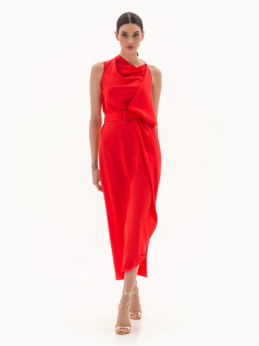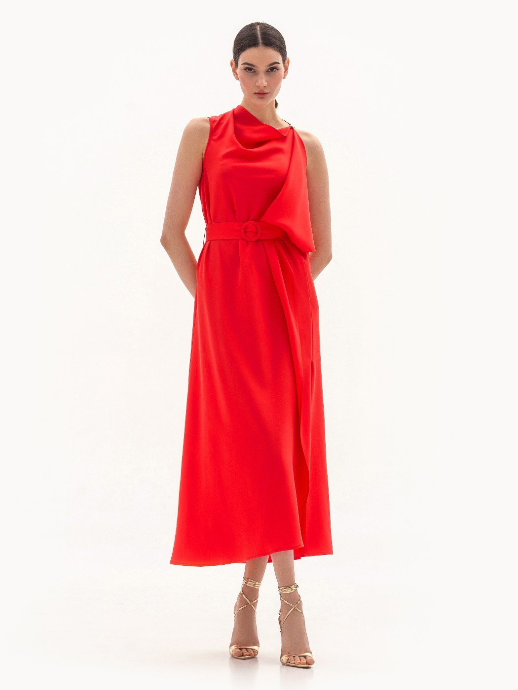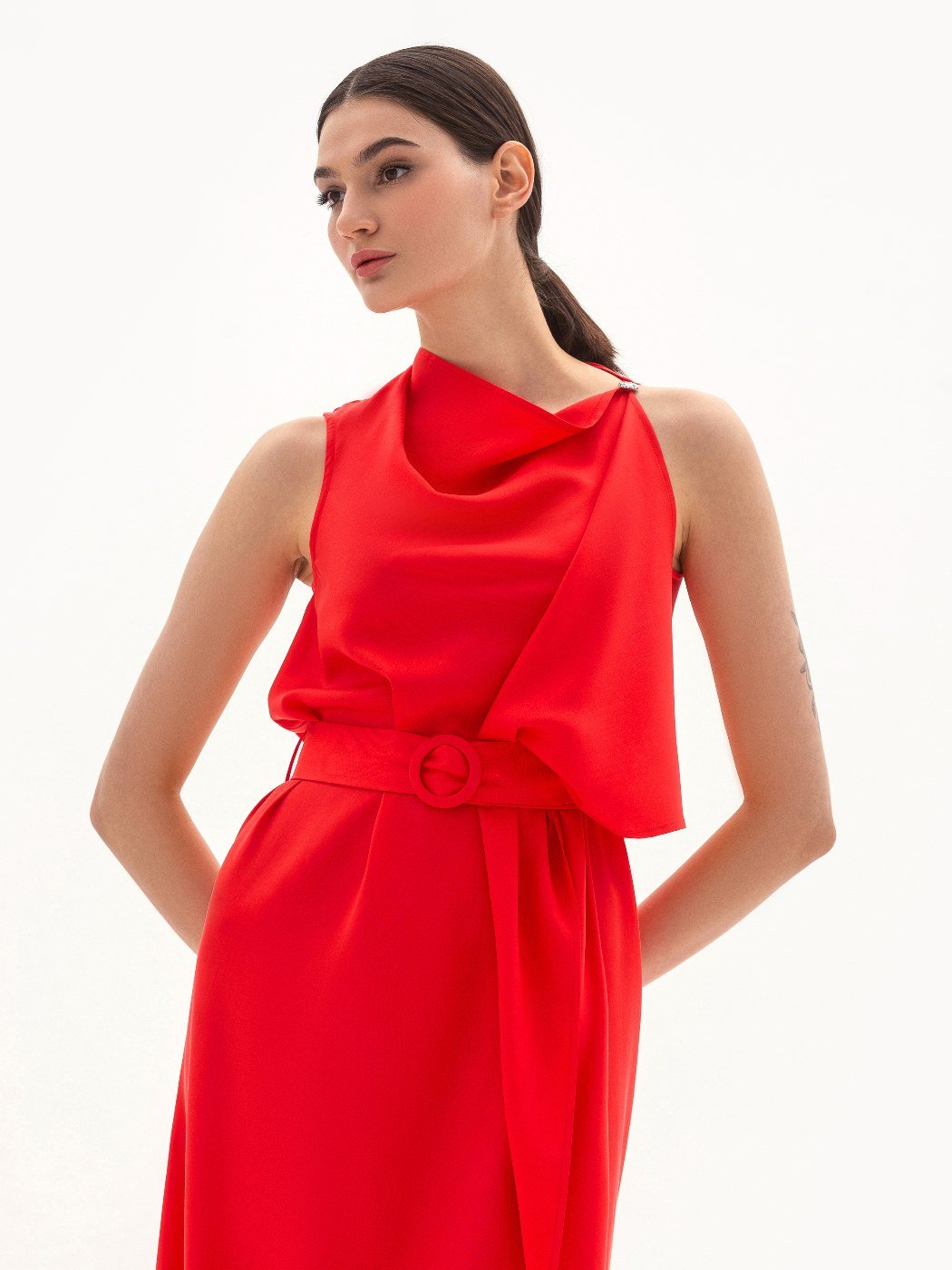 Вид изделия: струящееся, свободного прилегания платье в длине макси, с разрезом спереди и отлетной деталью по полочке, с открытой проймой, с ассиметричным вырезом по горловине, с поясом на пряжке. Силуэт, длина: свободный, расклешенный, в длине макси. Посадка по линии талии: классическая. Плотность и вид ткани: тонкий, струящийся текстильный материал. Вид застежки: пуговица. Наличие подкладочной ткани: отсутствует. Наличие и вид карманов: отсутствует. Вырез горловины: круглый. Вид рукава: открытая пройма. Уход за изделием: Деликатная, быстрая, ручная стирка при 30 градусах, без использования агрессивных моющих средств. Размер изделия на фото: UA 40; еur 34; USA 2; INT XXS. Параметры модели на фотографии: Рост: 179см, ОГ — 89см, ОТ — 60см, ОБ — 89см.