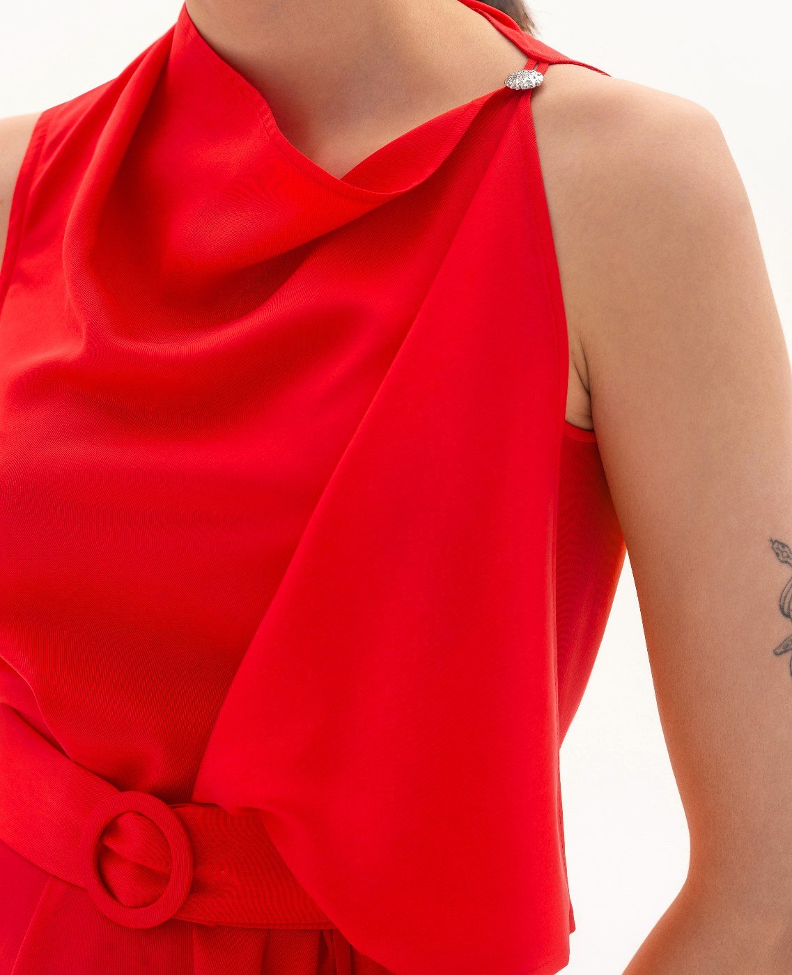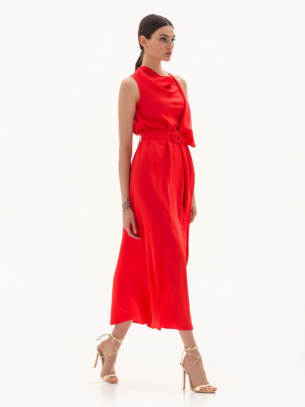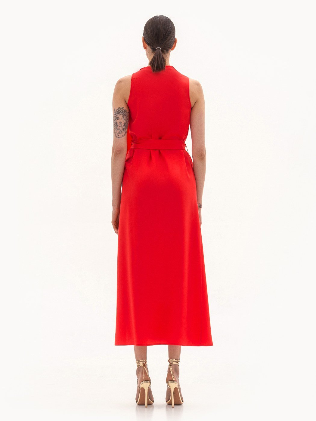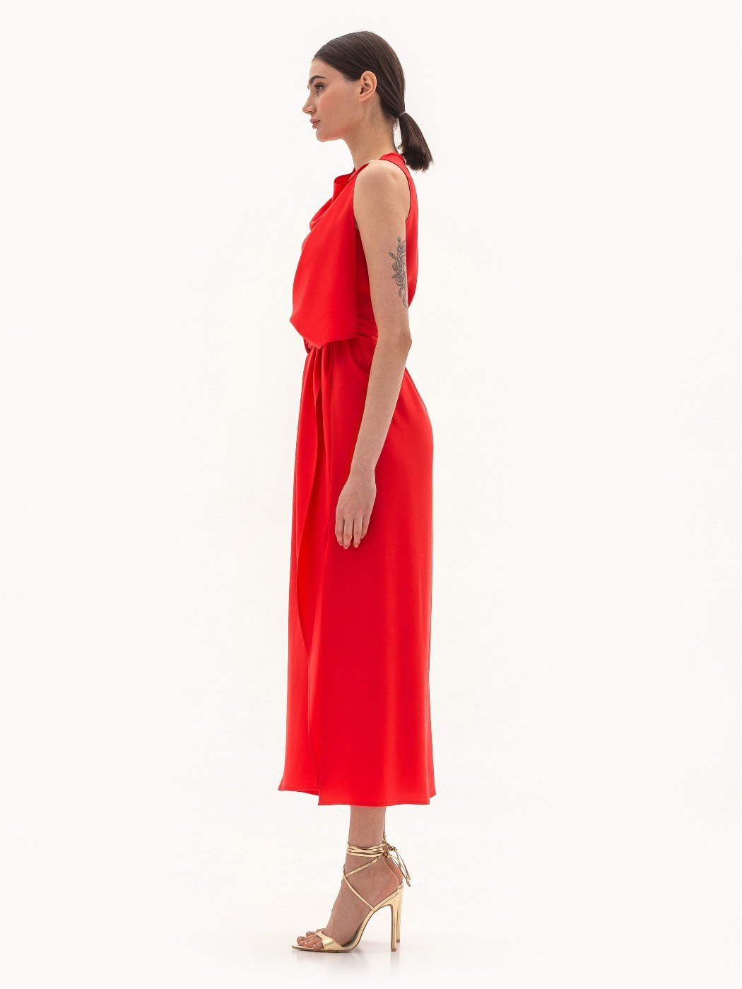 Вид изделия: струящееся, свободного прилегания платье в длине макси, с разрезом спереди и отлетной деталью по полочке, с открытой проймой, с ассиметричным вырезом по горловине, с поясом на пряжке. Силуэт, длина: свободный, расклешенный, в длине макси. Посадка по линии талии: классическая. Плотность и вид ткани: тонкий, струящийся текстильный материал. Вид застежки: пуговица. Наличие подкладочной ткани: отсутствует. Наличие и вид карманов: отсутствует. Вырез горловины: круглый. Вид рукава: открытая пройма. Уход за изделием: Деликатная, быстрая, ручная стирка при 30 градусах, без использования агрессивных моющих средств. Размер изделия на фото: UA 40; еur 34; USA 2; INT XXS. Параметры модели на фотографии: Рост: 179см, ОГ — 89см, ОТ — 60см, ОБ — 89см.