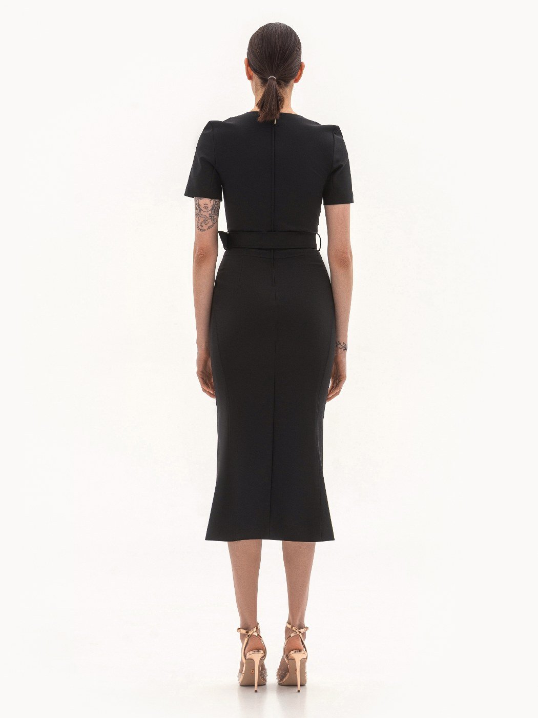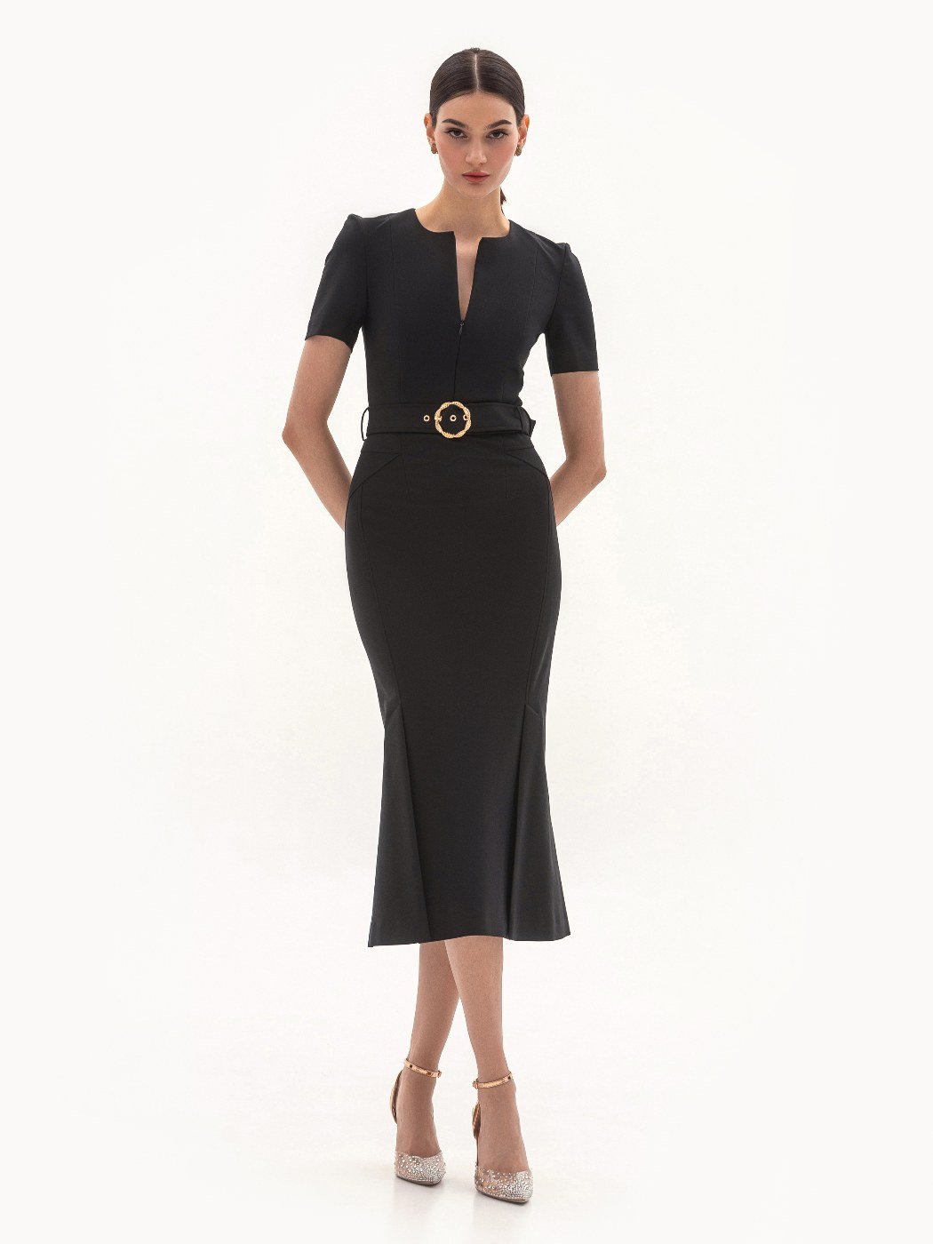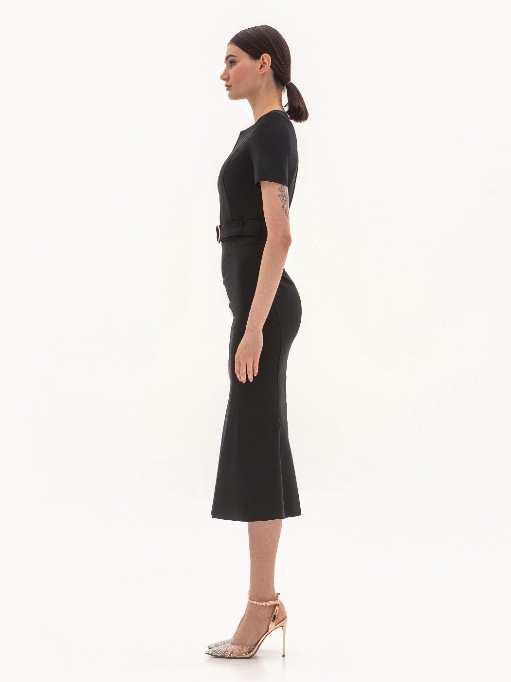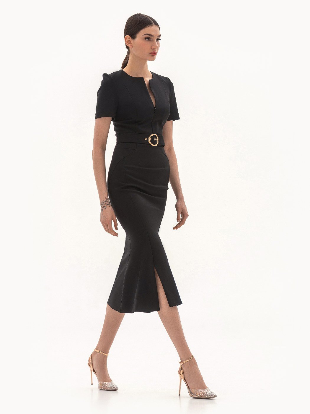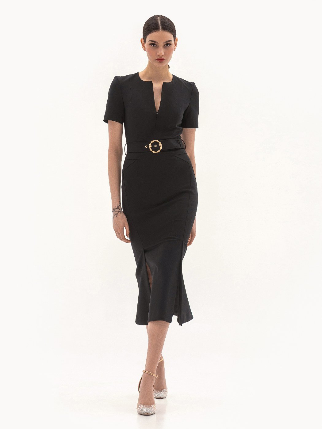 Вид изделия: прямое платье, с многочисленными рельефами, с двумя шлицами по полочке, функциональной молнией в области выреза горловины, с поясом на декоративной пряжке. Силуэт, длина: прилегающий, прямой, зауженный, в длине миди. Посадка по линии талии: классическая. Плотность и вид ткани: хлопковая, текстильная ткань с добавлением эластавна. Вид застежки: молния. Наличие подкладочной ткани: присутствует. Наличие и вид карманов: отсутствуют. Вырез горловины: круглый. Вид рукава: втачной, трехшовный, короткий. Уход за изделием: Деликатная, быстрая, ручная стирка при 30 градусах, без использования агрессивных моющих средств. Размер изделия на фото: UA 40; еur 34; USA 2; INT XXS. Параметры модели на фотографии: Рост: 179см, ОГ — 89см, ОТ — 60см, ОБ — 89см.