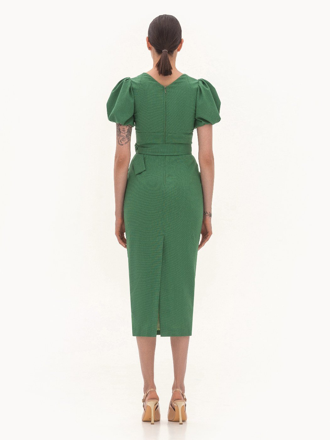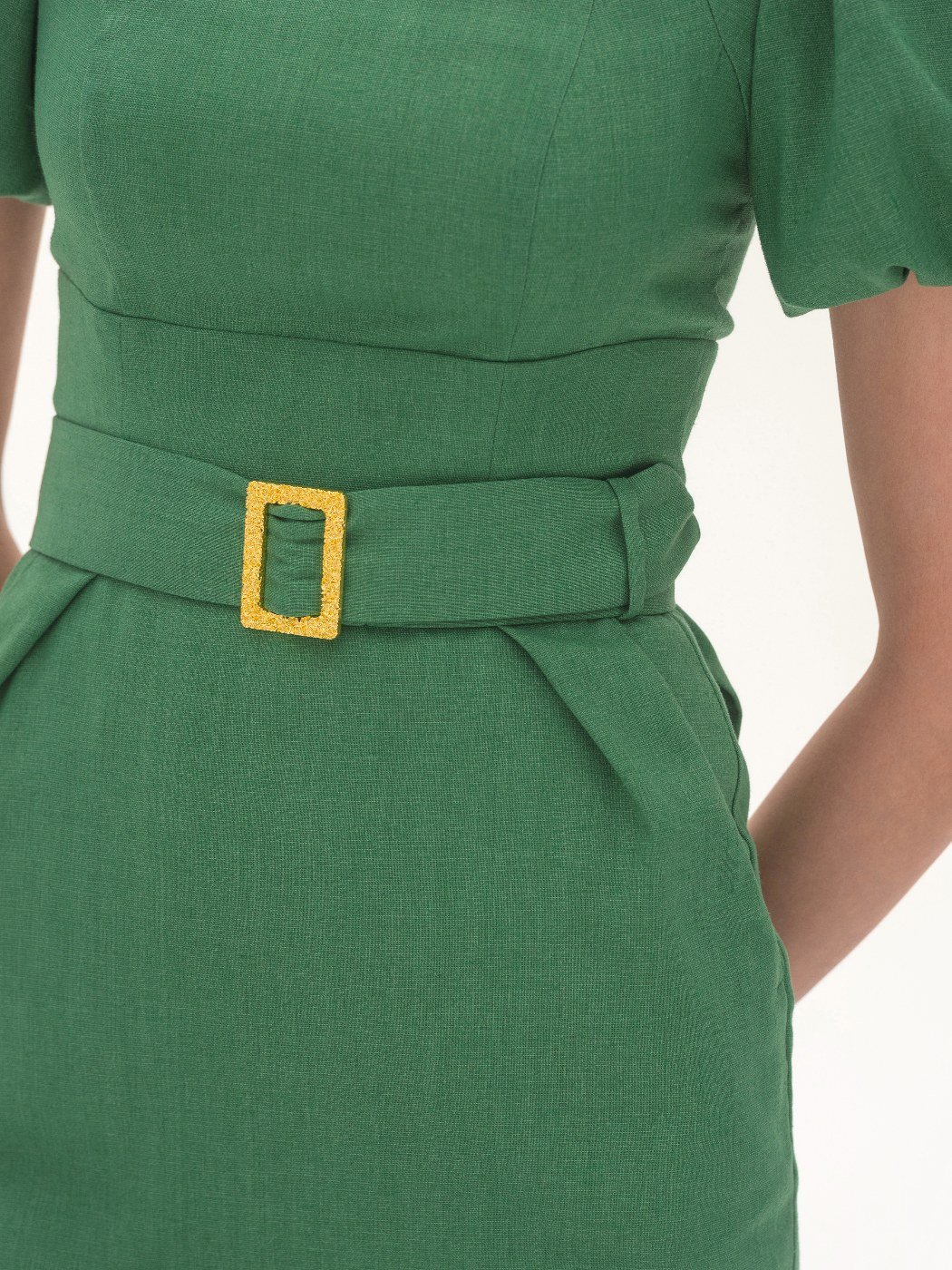 Вид изделия: прямое платье, с кокеткой по линии талии и акцентыми рукавчиками. Силуэт, длина: прилегающий, прямой, зауженный, миди. Посадка по линии талии: классическая. Плотность и вид ткани: средней плотности смесовый, льняной материал. Вид застежки: молния. Наличие подкладочной ткани: присутствует. Наличие и вид карманов: подкройные. Вырез горловины: карэ. Вид рукава: короткий, втачной, присборенный.Уход за изделием: Деликатная, быстрая, ручная стирка при 30 градусах, без использования агрессивных моющих средств. Размер изделия на фото: UA 40; еur 34; USA 2; INT XXS. Параметры модели на фотографии: Рост: 179см, ОГ — 89см, ОТ — 60см, ОБ — 89см.