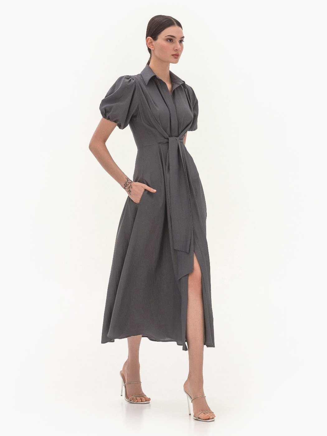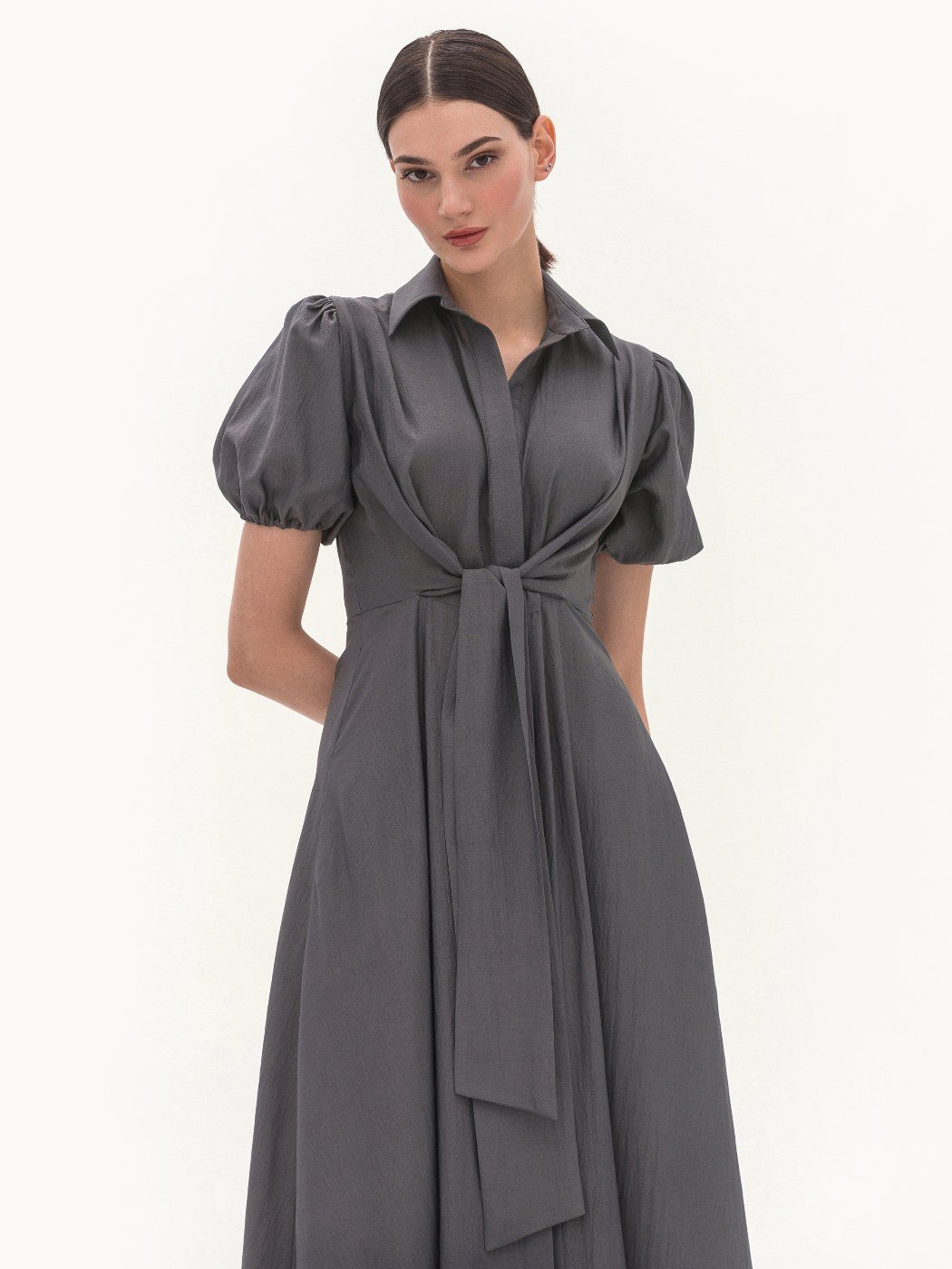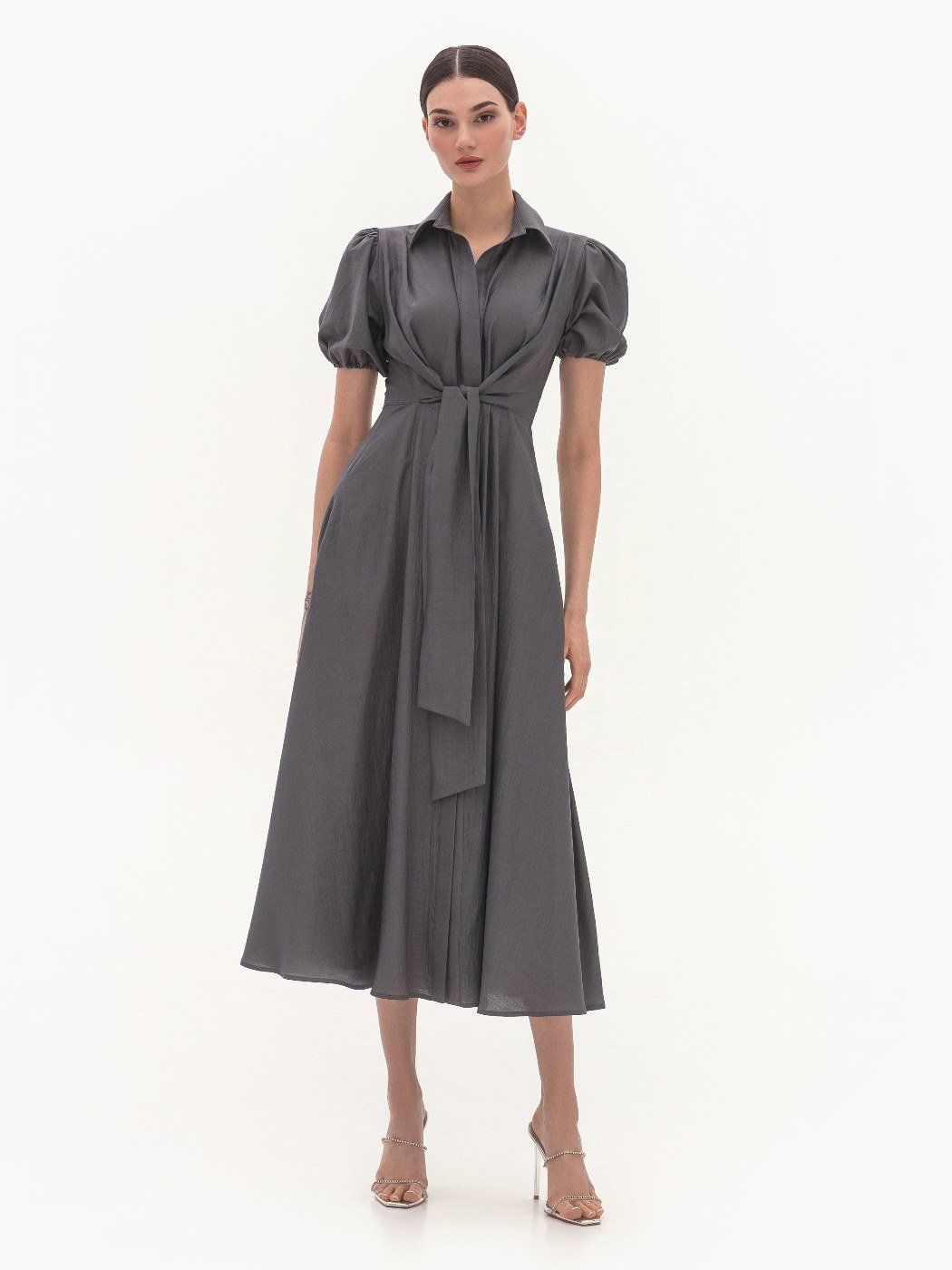 Вид изделия: расклешенное платье, с воротником, акцентными рукавами на резинке по низу, на суппатной застежке, с поясами-завязками, регулирующими линию талии. Силуэт, длина: расклешенный, свободный, макси. Посадка по линии талии: классическая. Плотность и вид ткани: тонкий материал. Вид застежки: суппатная застежка на пуговицах. Наличие и вид карманов: в боковых швах. Вид рукава: втачной, присобранный, на резинке по низу. Уход за изделием: Деликатная, быстрая, ручная стирка при 30 градусах, без использования агрессивных моющих средств. Размер изделия на фото: UA 40; еur 34; USA 2; INT XXS. Параметры модели на фотографии: Рост: 179см, ОГ — 89см, ОТ — 60см, ОБ — 89см.