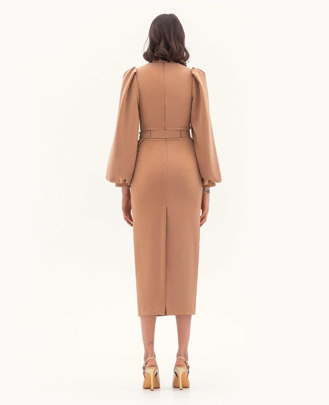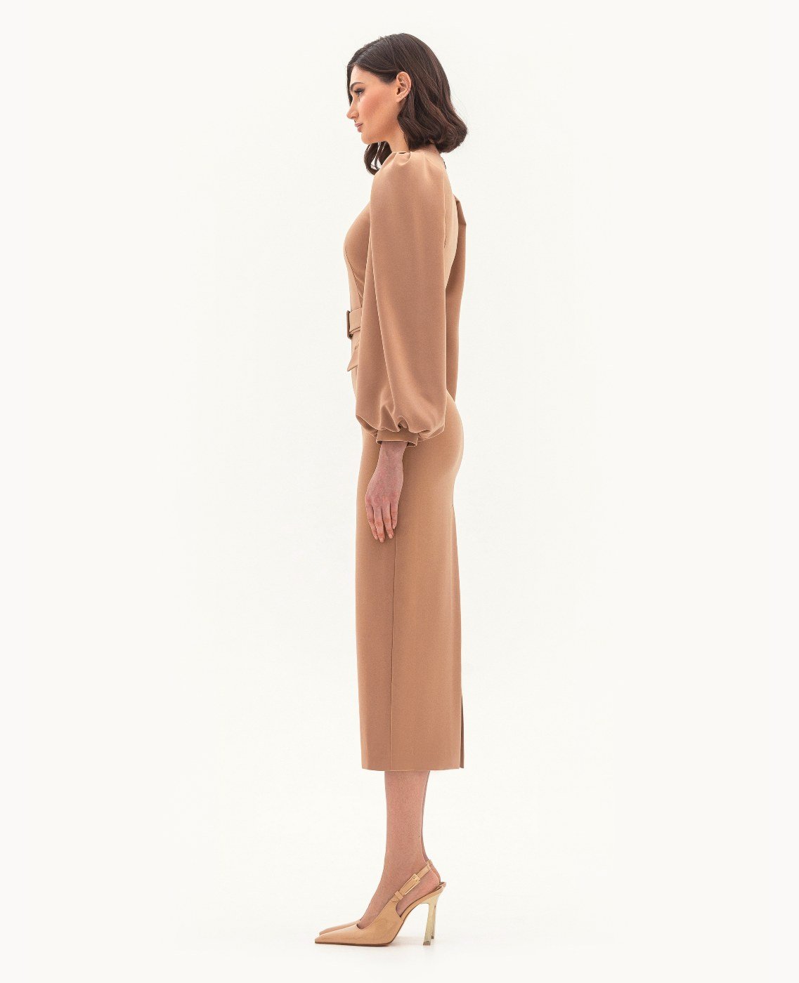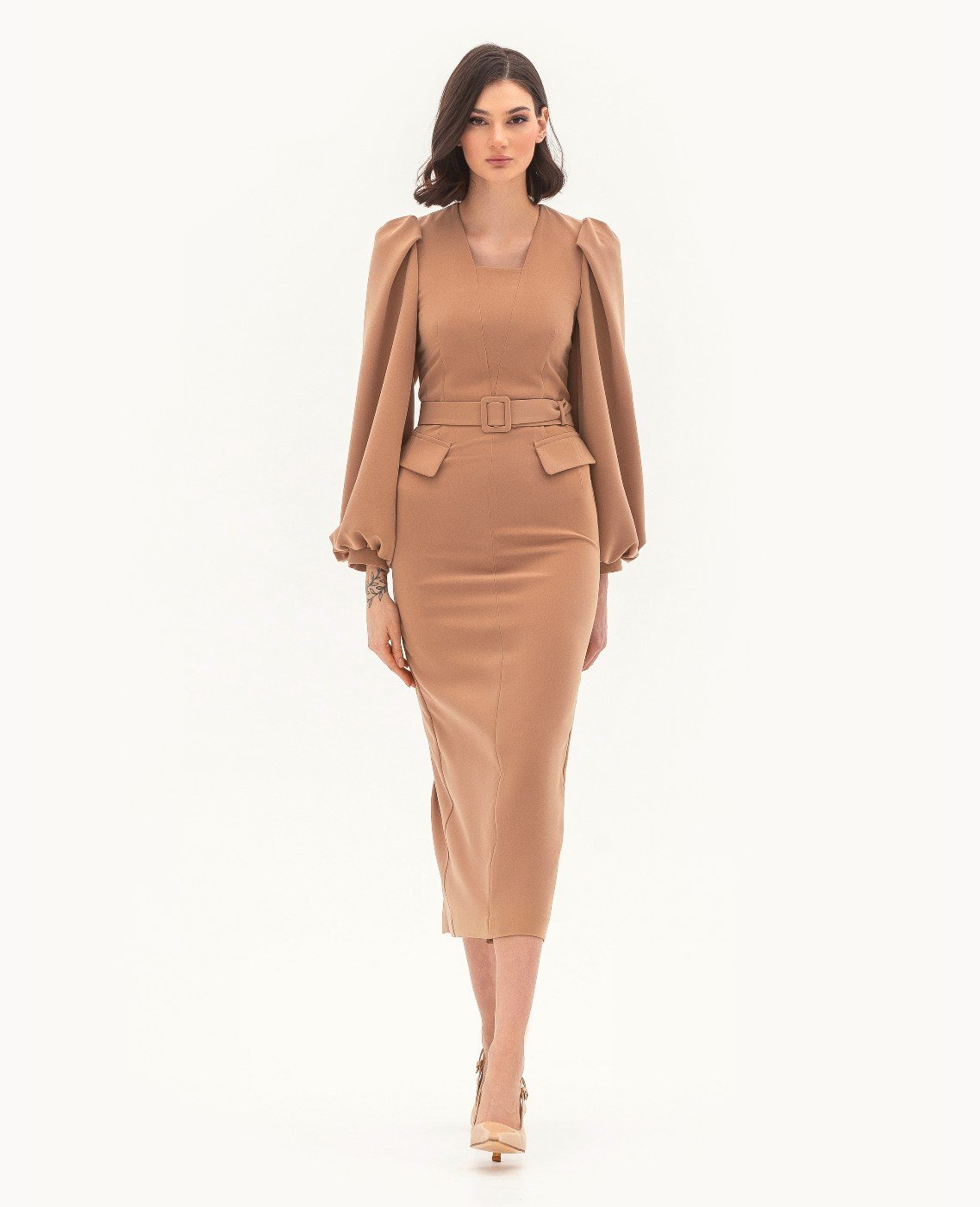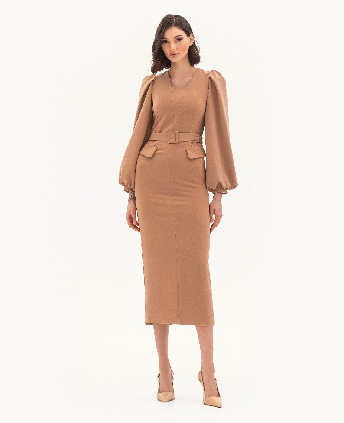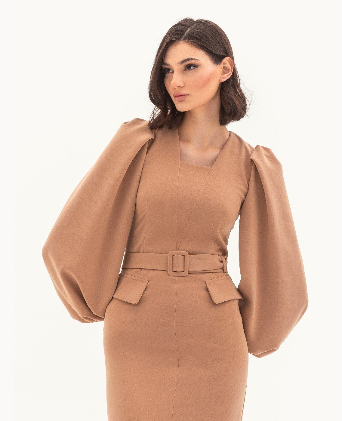 Вид изделия: прямое платье, полуприлегающего силуэта, с обьемными и акцентными рукавами, с поясом на пряжке, с карманами с клапаном по полочке. Силуэт, длина: прямой, полуприлегающий, в длине миди. Посадка по линии талии: классическая. Плотность и вид ткани: средней плотности текстильный материал с добавлением эластана. Вид застежки: молния. Наличие подкладочной ткани: присутствует. Наличие и вид карманов: в рамку с клапаном. Вырез горловины: V-образный. Вид рукава: втачной, обьемный, со складами по окату, с манжетой и складами по низу. Уход за изделием: Деликатная, быстрая, ручная стирка при 30 градусах, без использования агрессивных моющих средств. Размер изделия на фото: UA 40; еur 34; USA 2; INT XXS. Параметры модели на фотографии: Рост: 179см, ОГ — 89см, ОТ — 60см, ОБ — 89см.