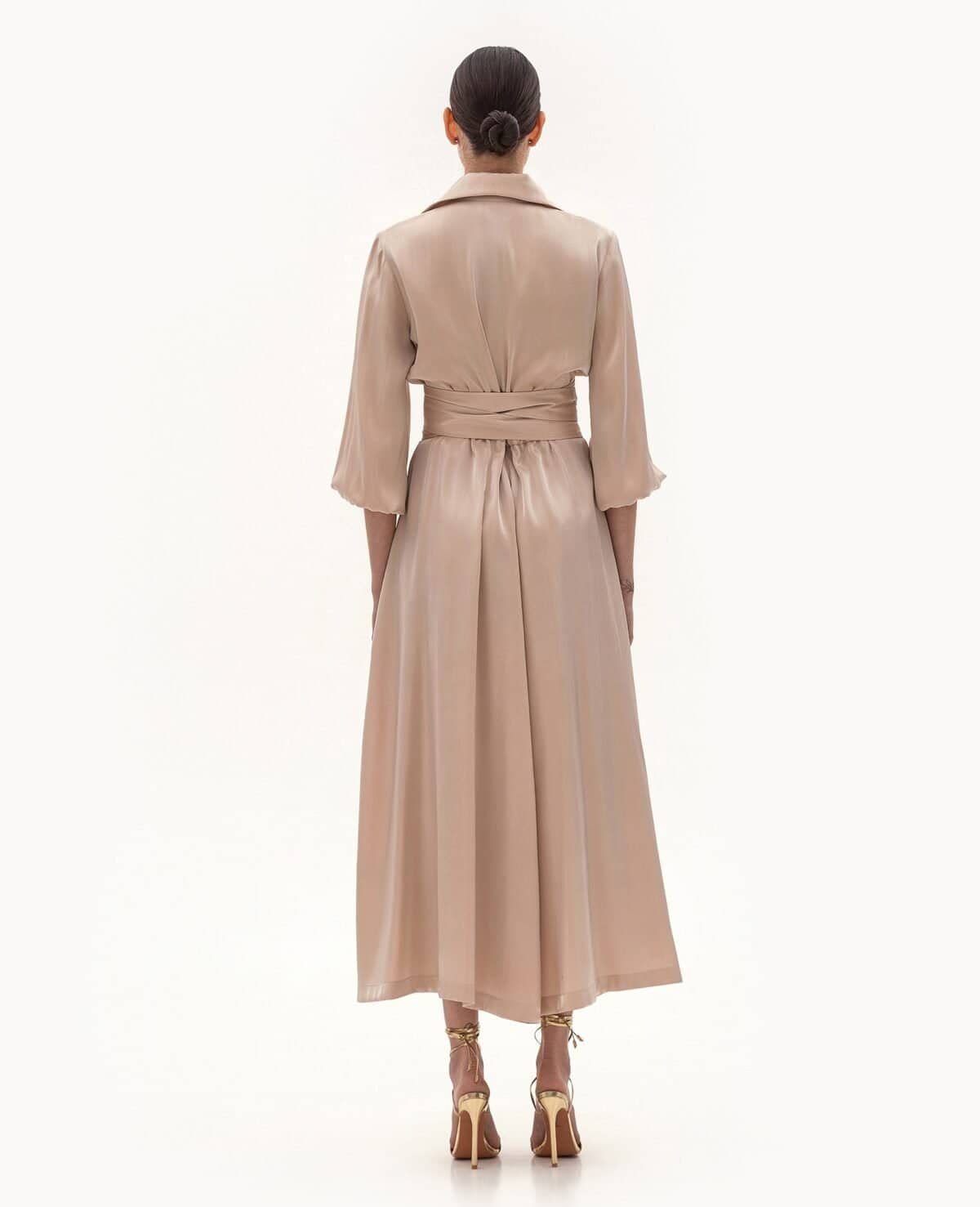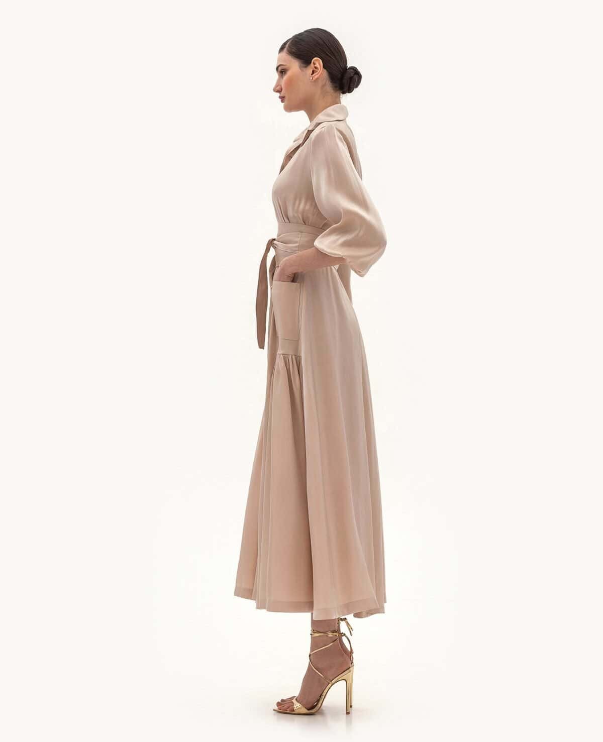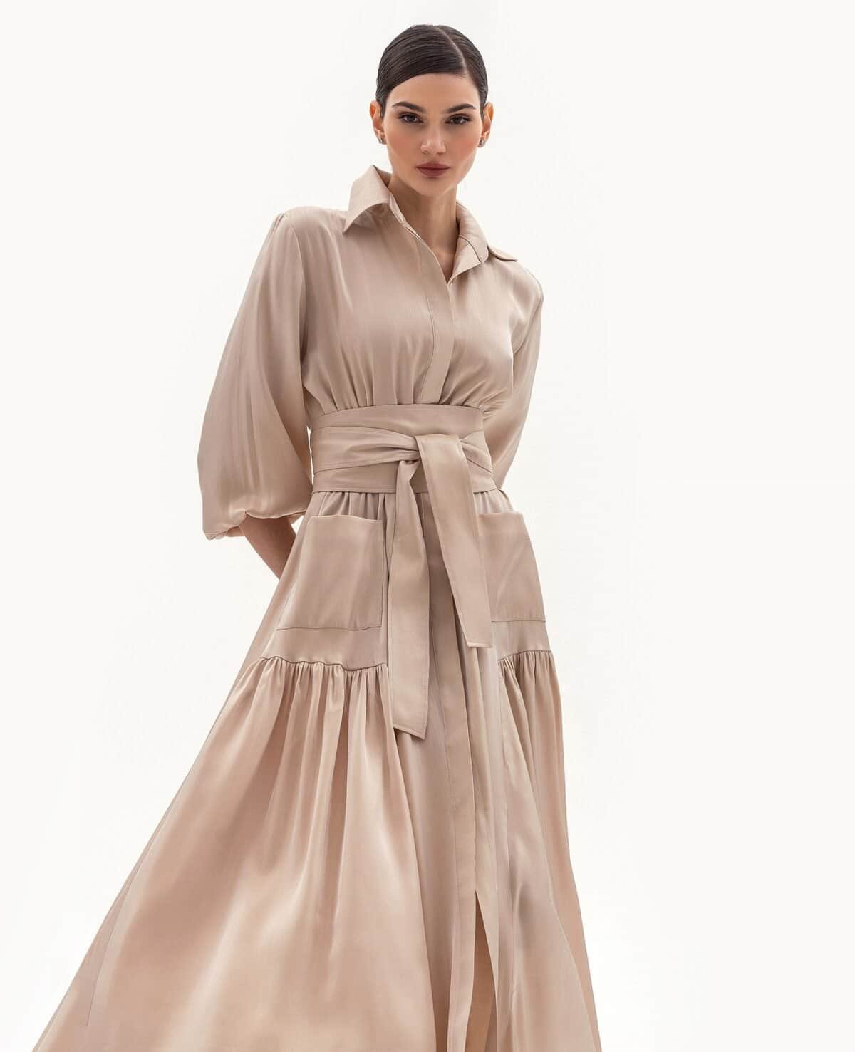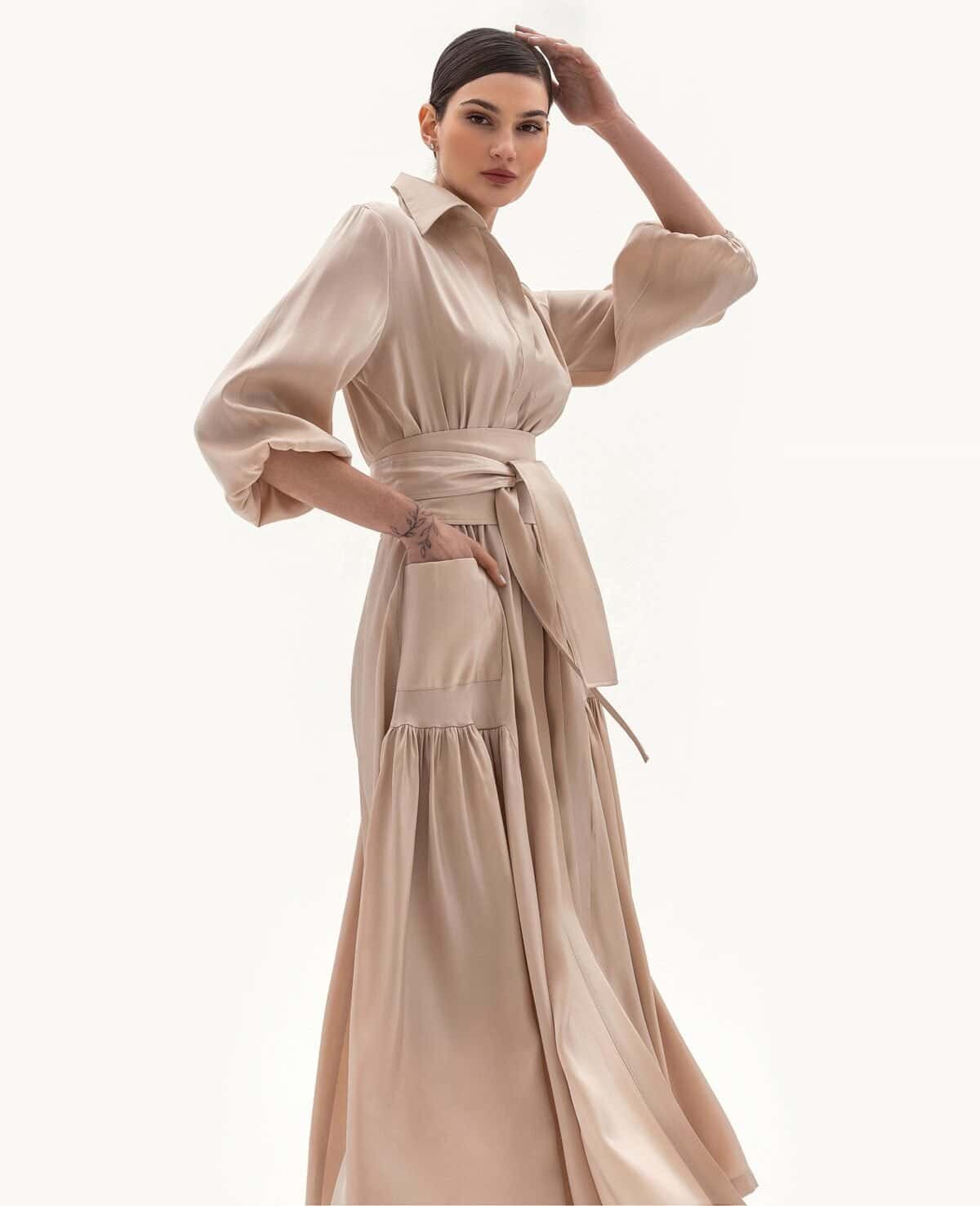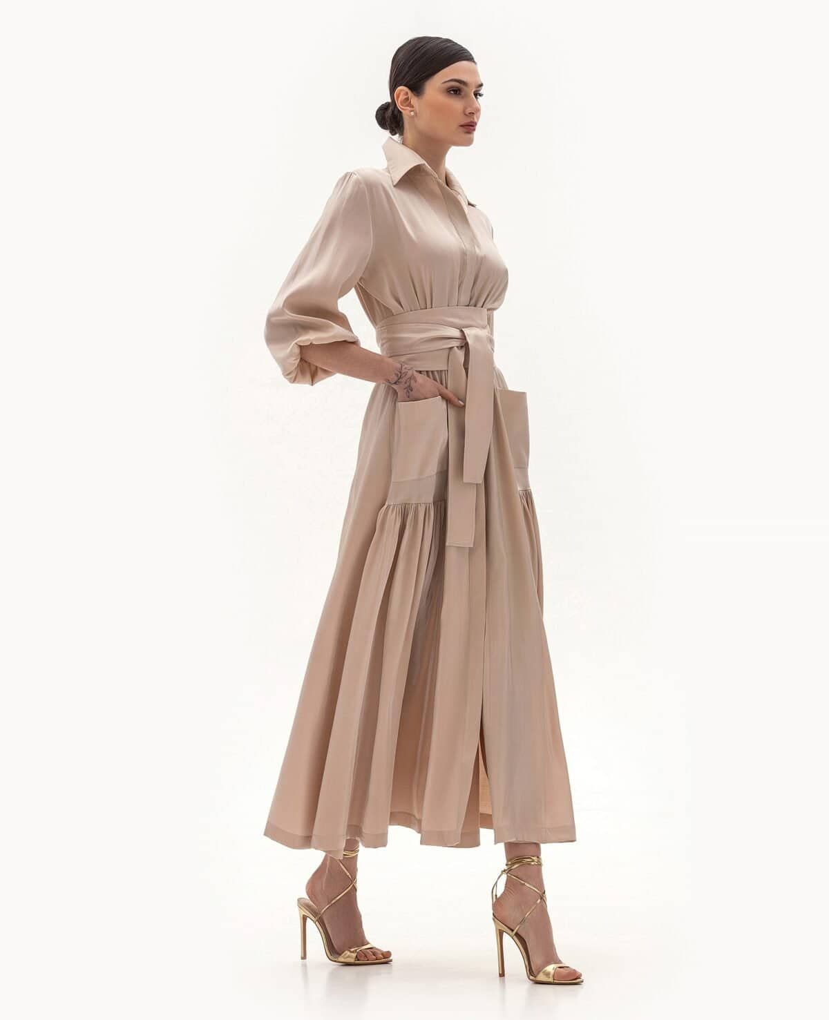 Вид изделия: расклешённое платье из весенне-летней коллекции с эластичной талией на резинке и объёмным широким поясом-завязкой. Модель дополнена объёмными рукавами, потайной супатной застёжкой на пуговицах и сдержанным классическим воротником на стойке рубашечного типа.