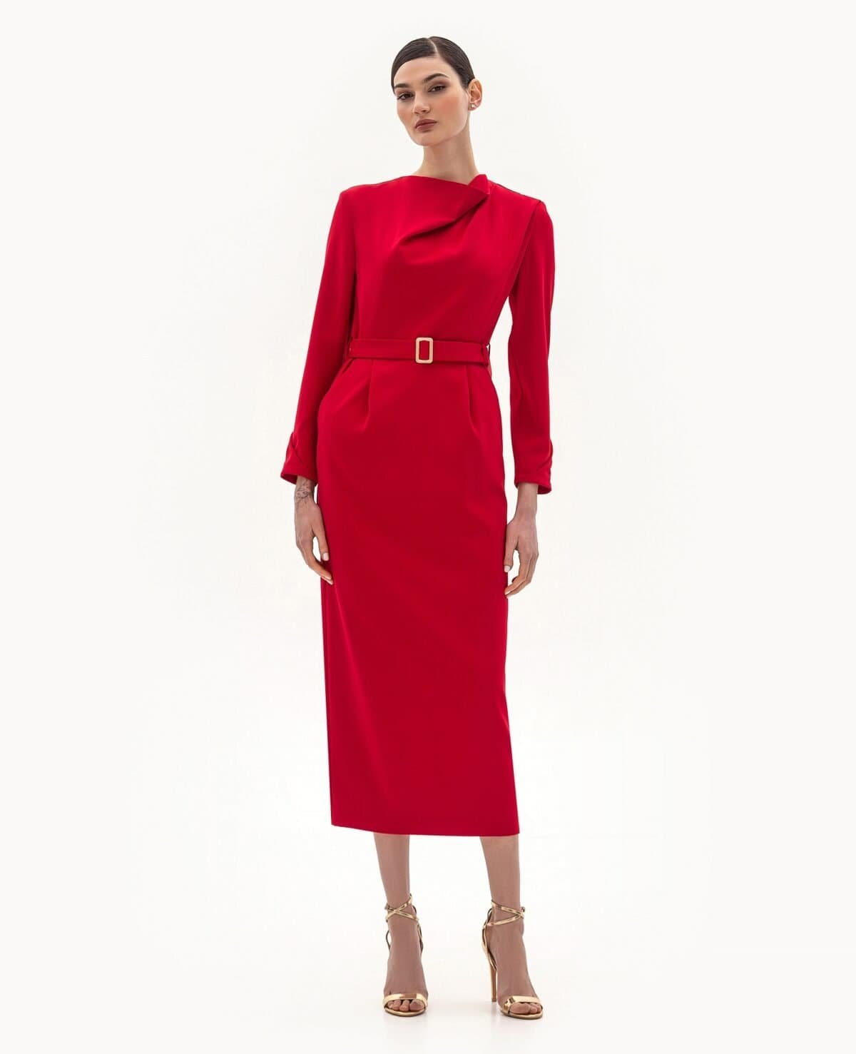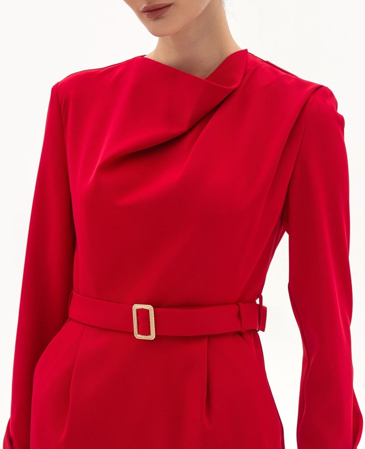 Вид изделия: прямое платье, отрезное по линии талии, с поясом и мягкими складками под поясом. Дополнено деликатной линией горловины.