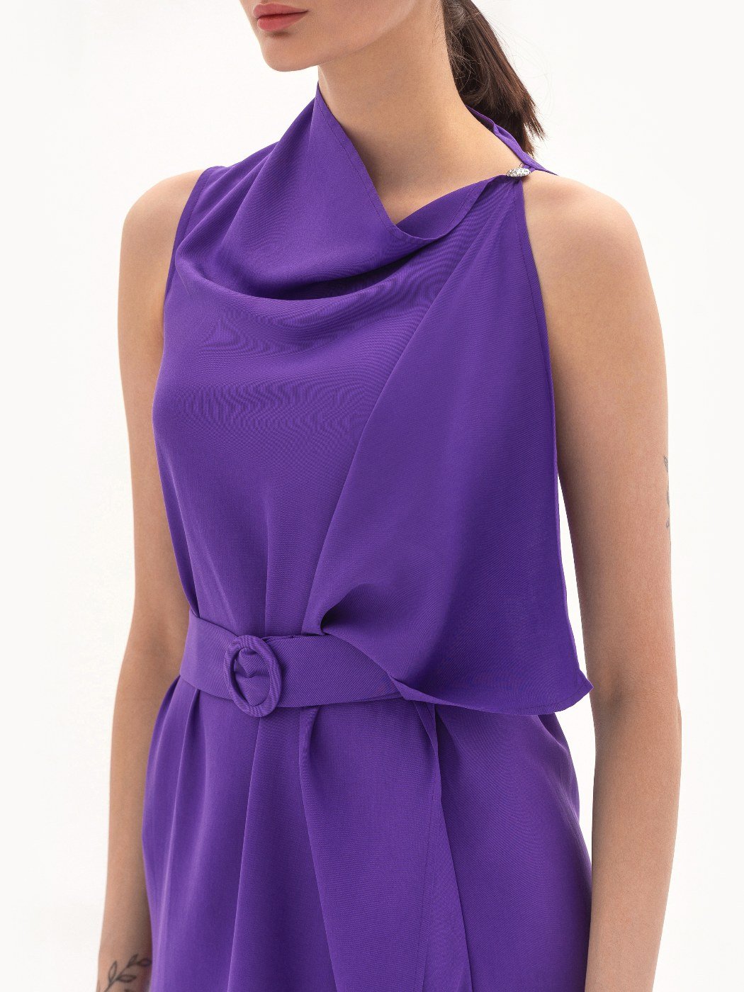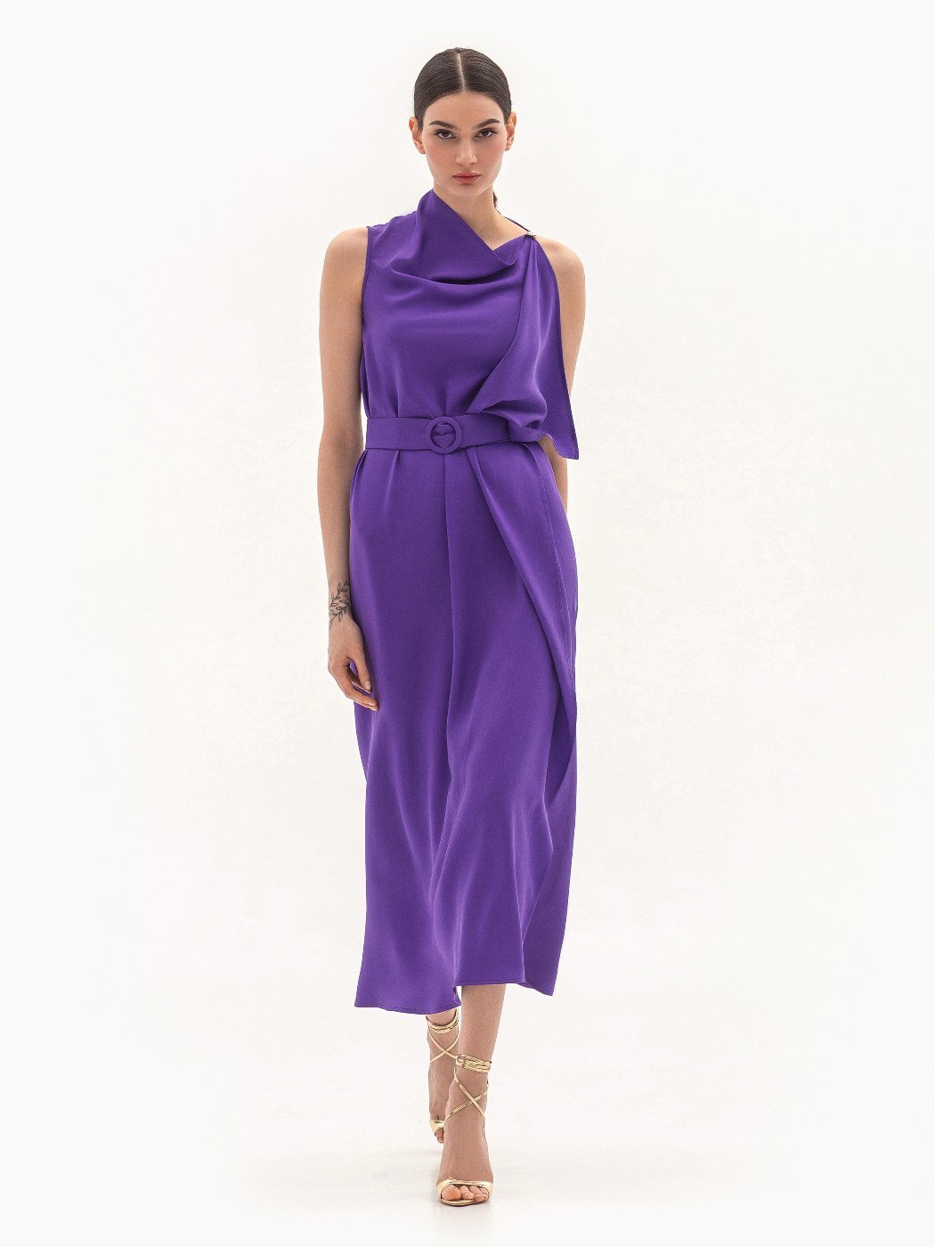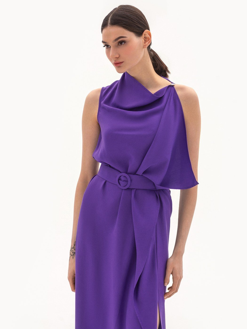 Вид изделия: струящееся платье свободного прилегания в длине макси, с разрезом спереди, отлётной деталью по полочке, открытой проймой и асимметричным вырезом, дополненное поясом на пряжке.