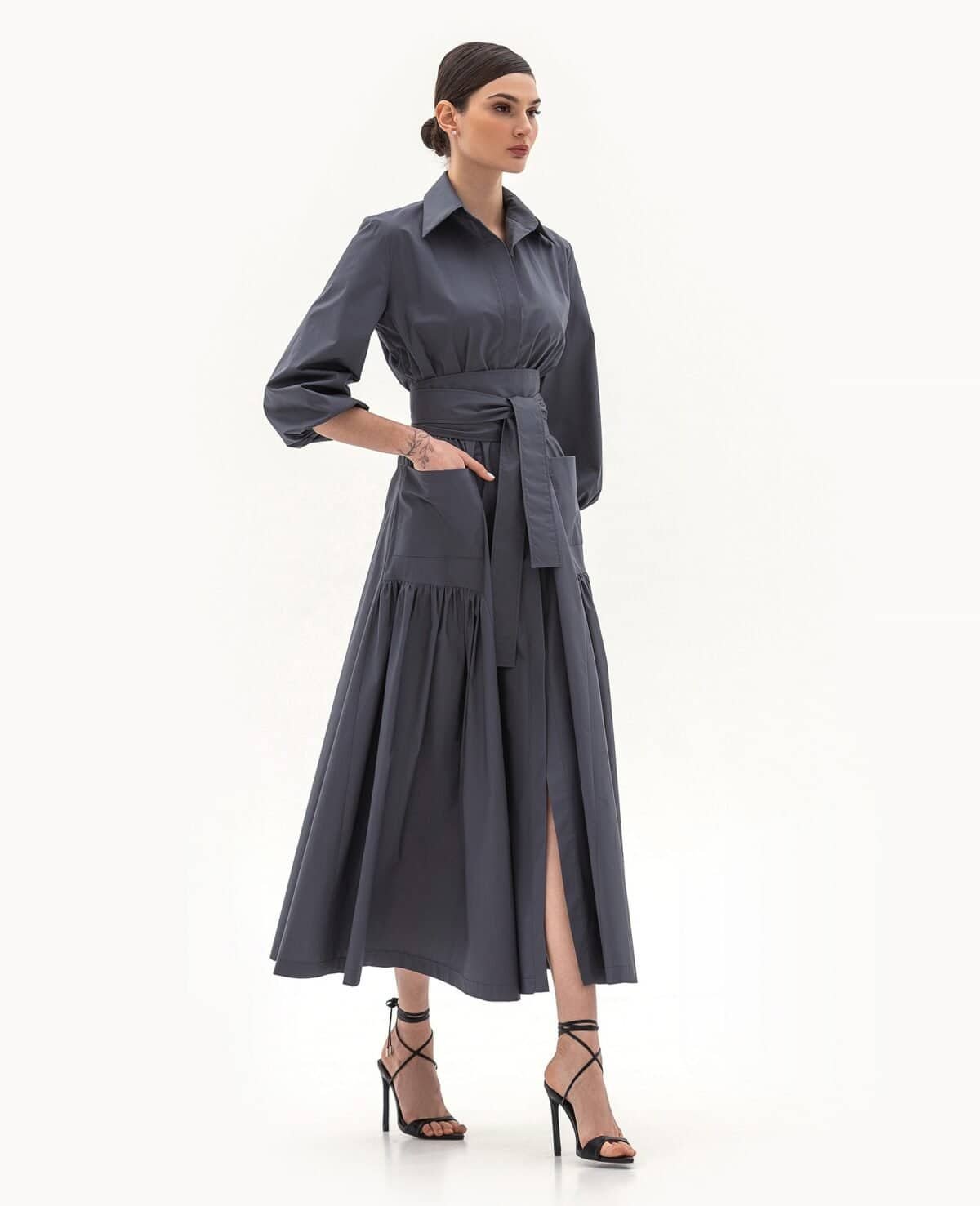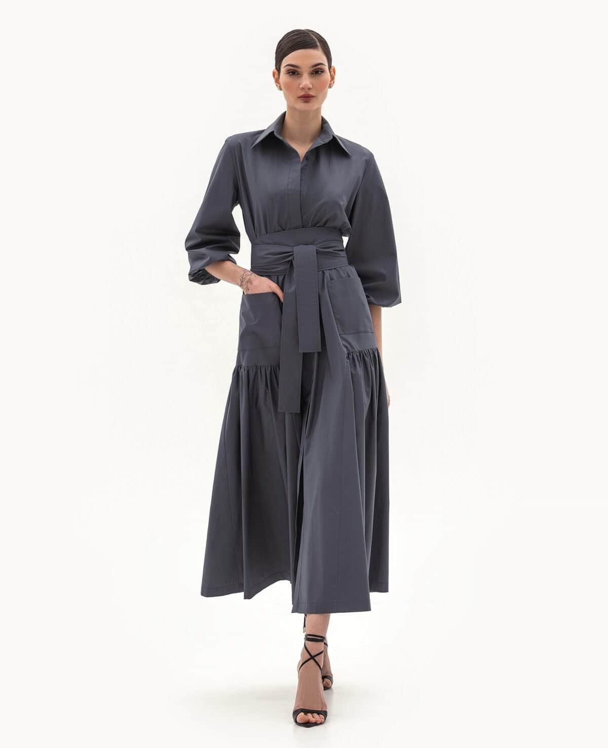 Вид изделия: расклешённое платье из весенне-летней коллекции с эластичной талией на резинке и объёмным широким поясом-завязкой. Модель дополнена объёмными рукавами, потайной супатной застёжкой на пуговицах и сдержанным классическим воротником на стойке рубашечного типа.