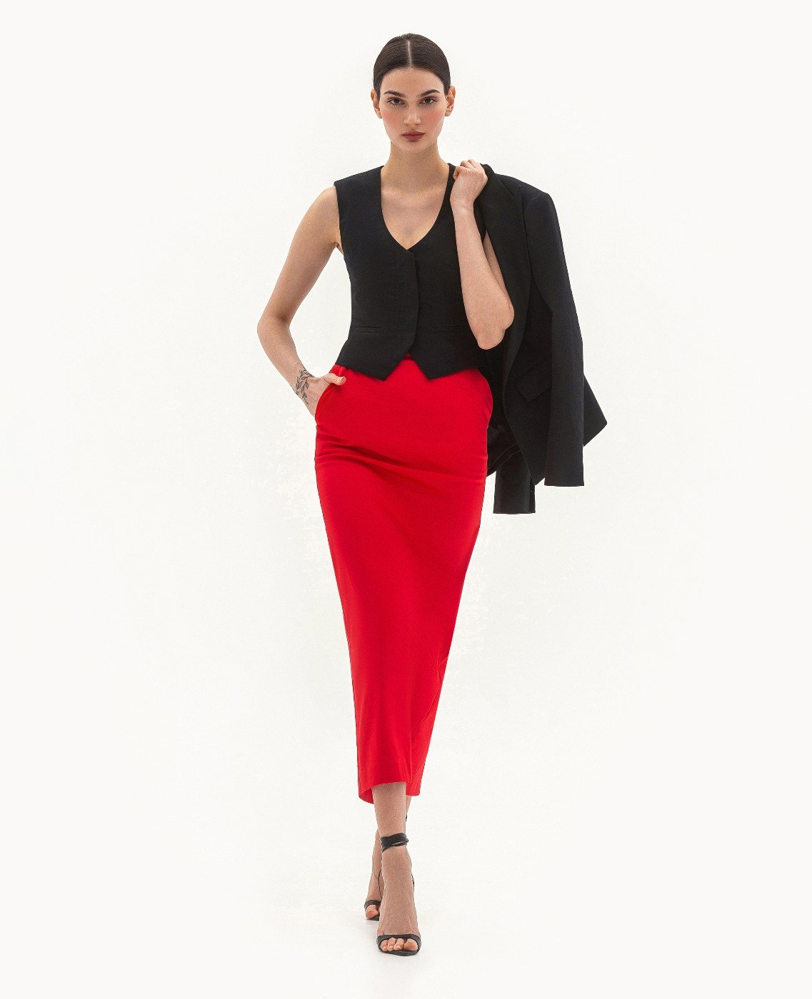 Вид изделия: прямая юбка с притачным поясом, боковыми карманами и шлицей по спинке.