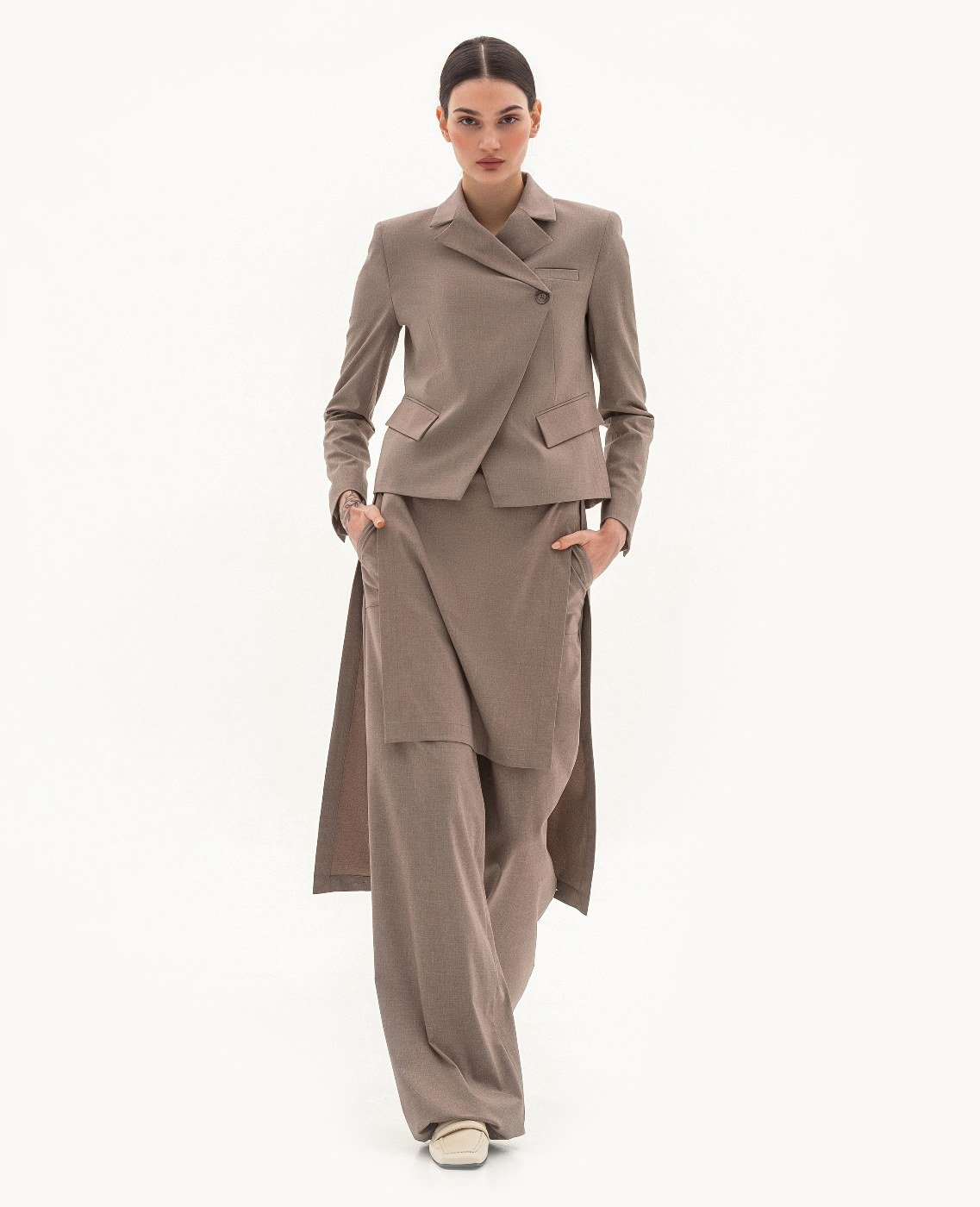Ткань верха: 75% вискоза, 23% полиэстр, 2% эластан. Подкладочная ткань: 45% полиэстр, 55% вискоза.