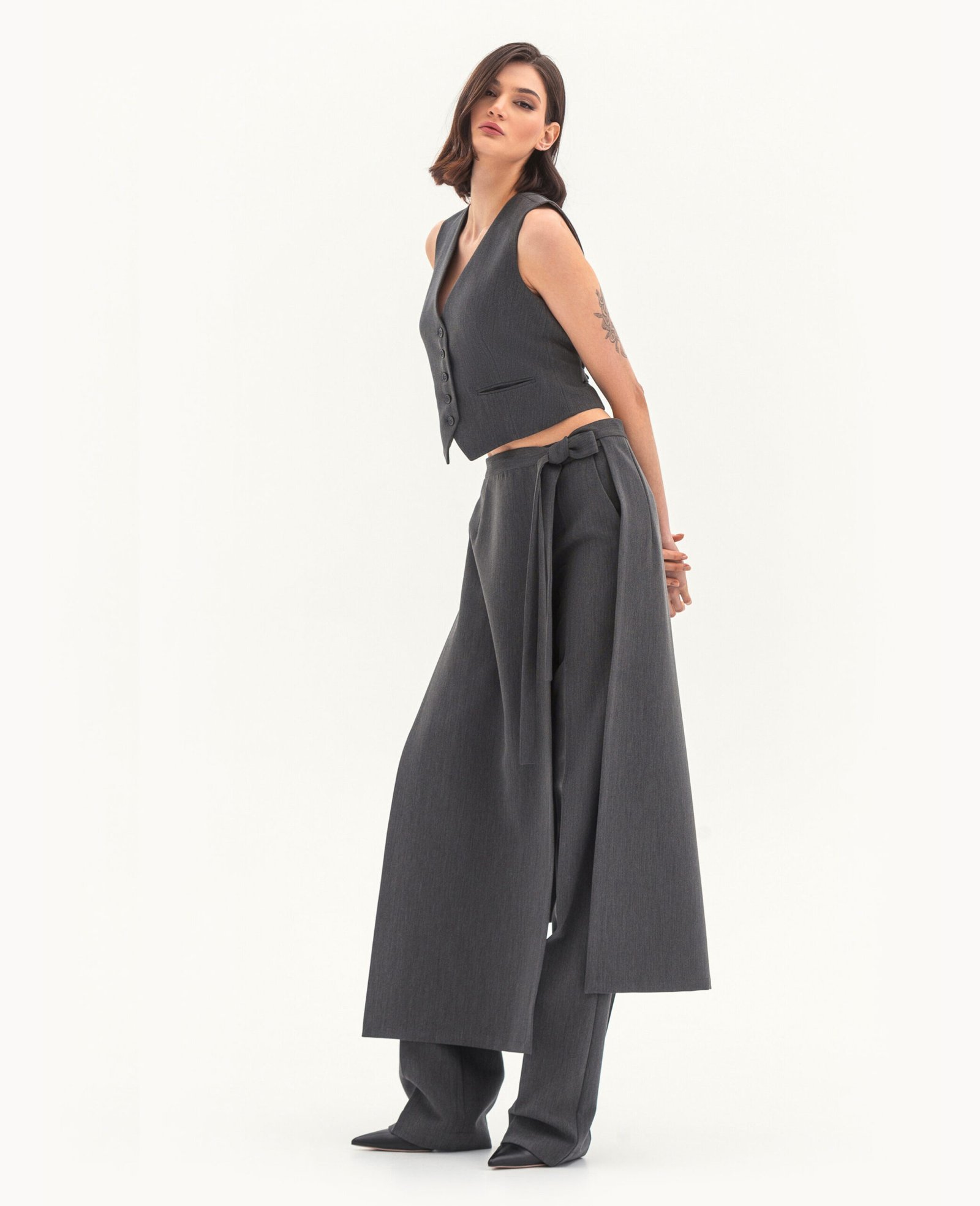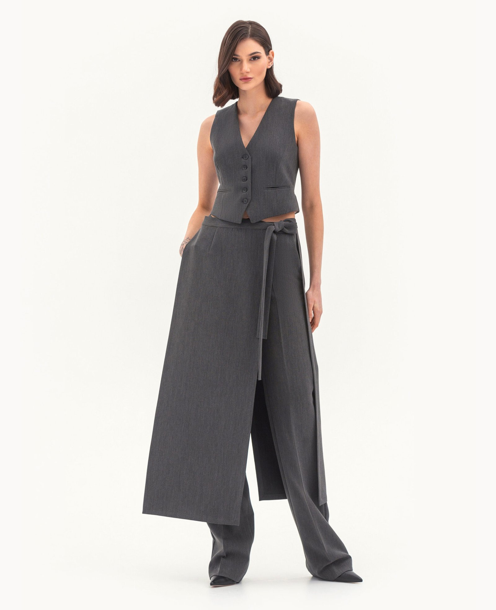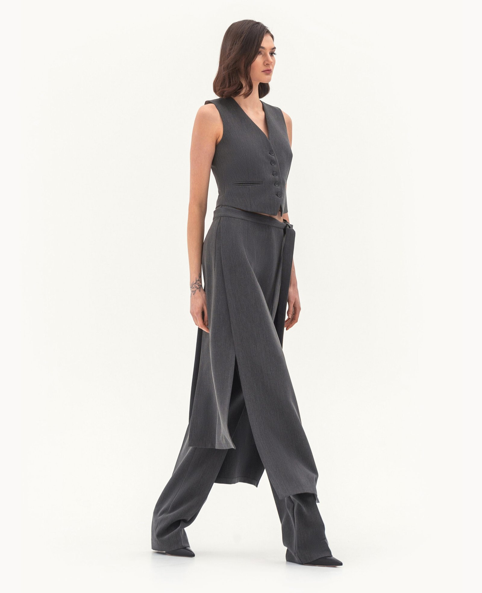 Вид виробу: потрійний комплект, що складається з жилета на ґудзиках, прямих штанів та спідниці-пояса з відлітними деталями асиметричної довжини.
