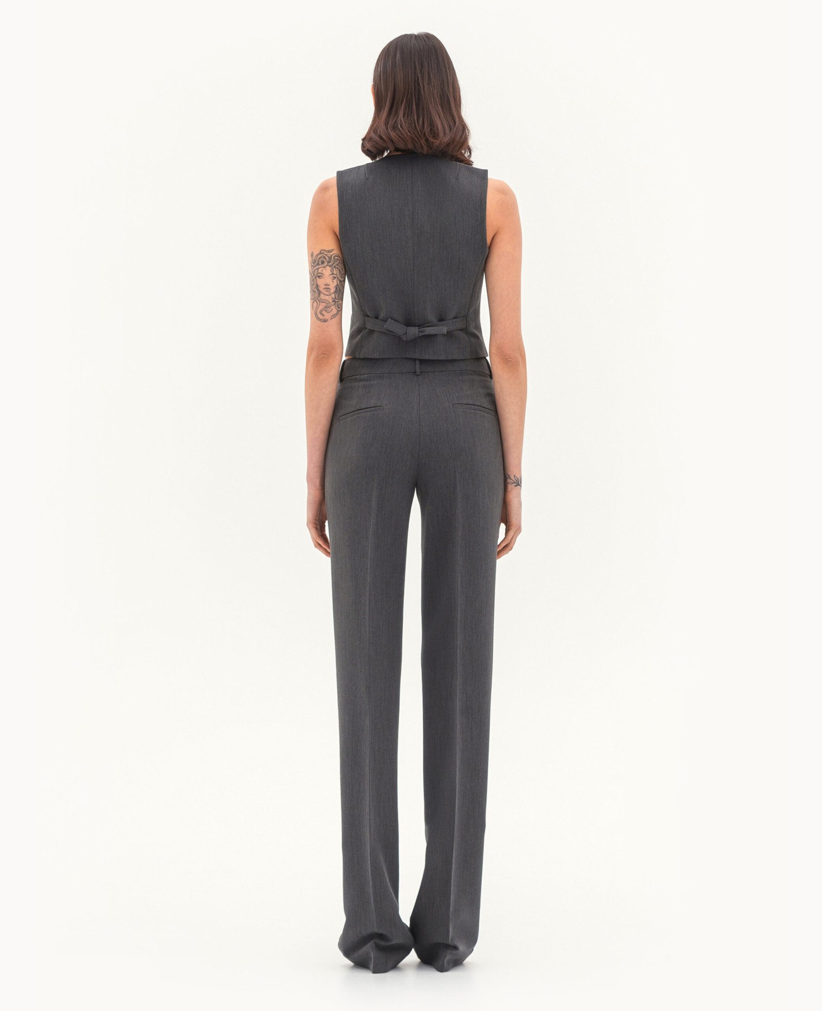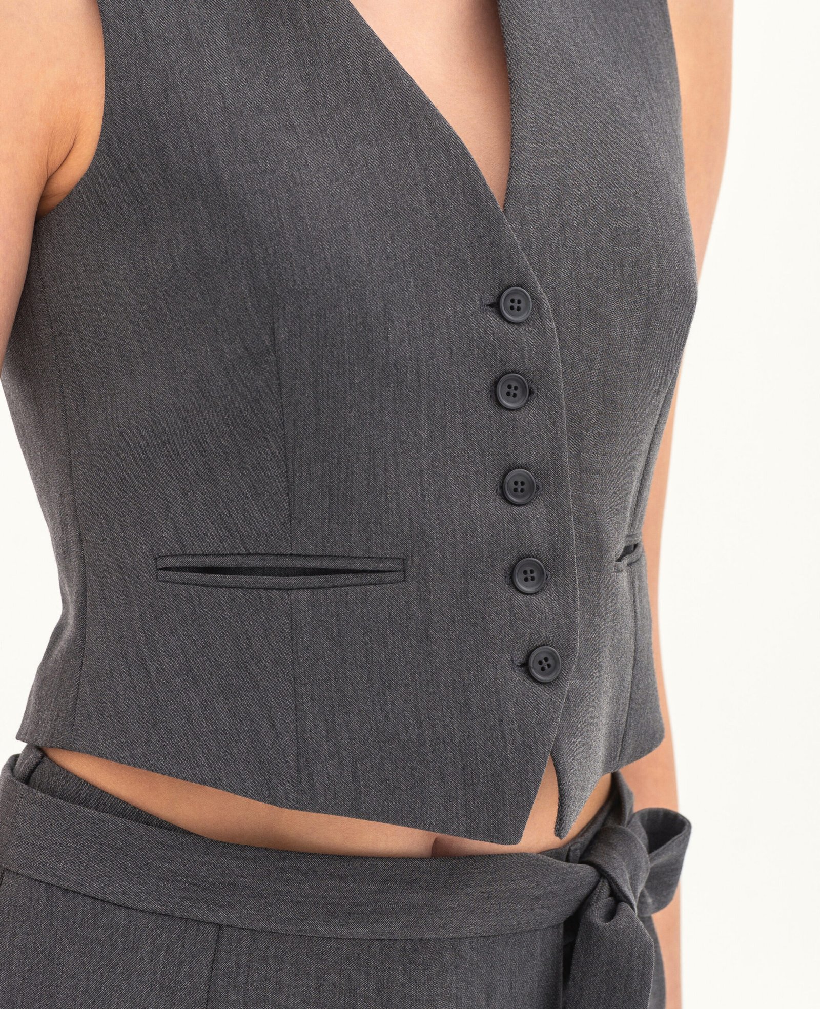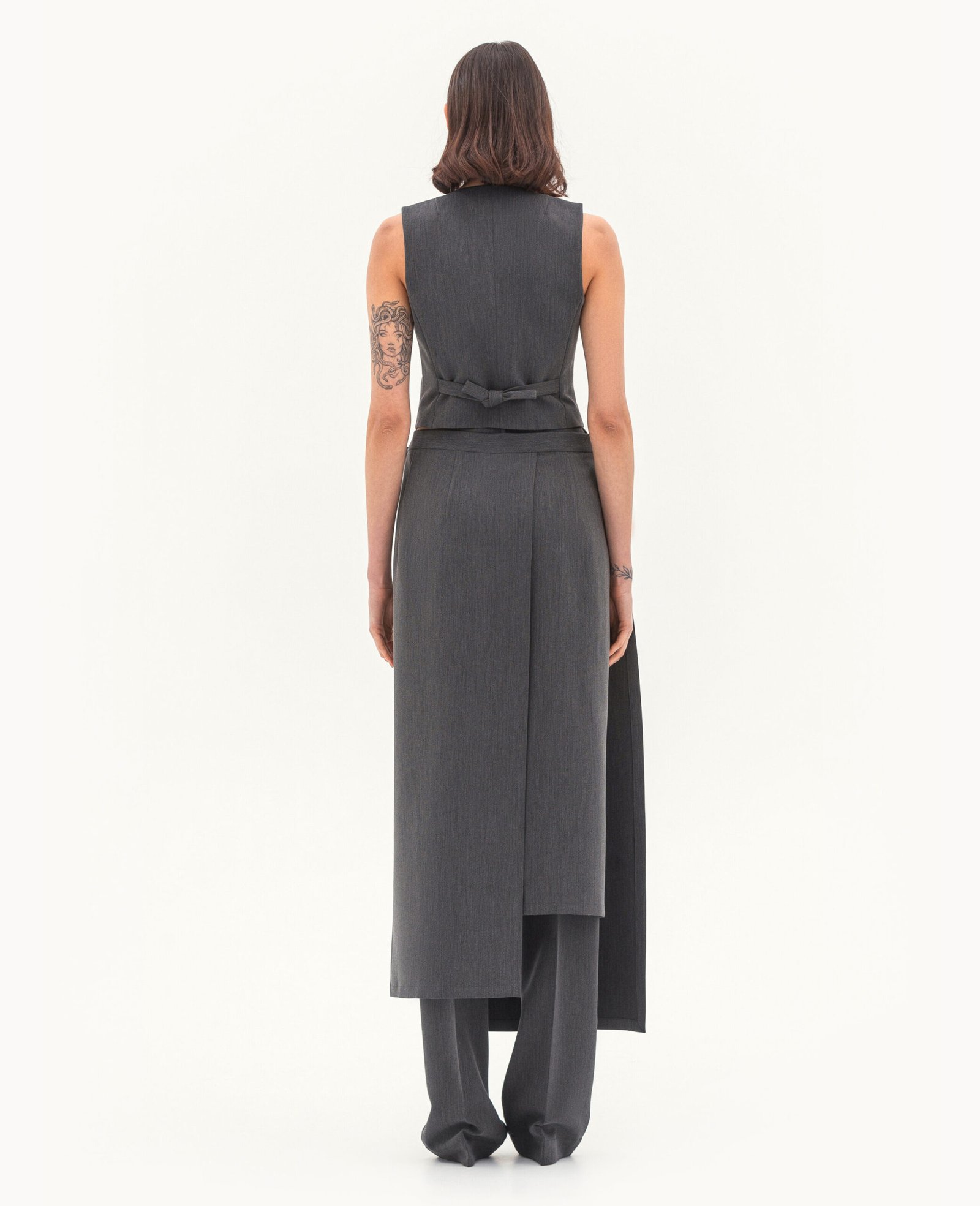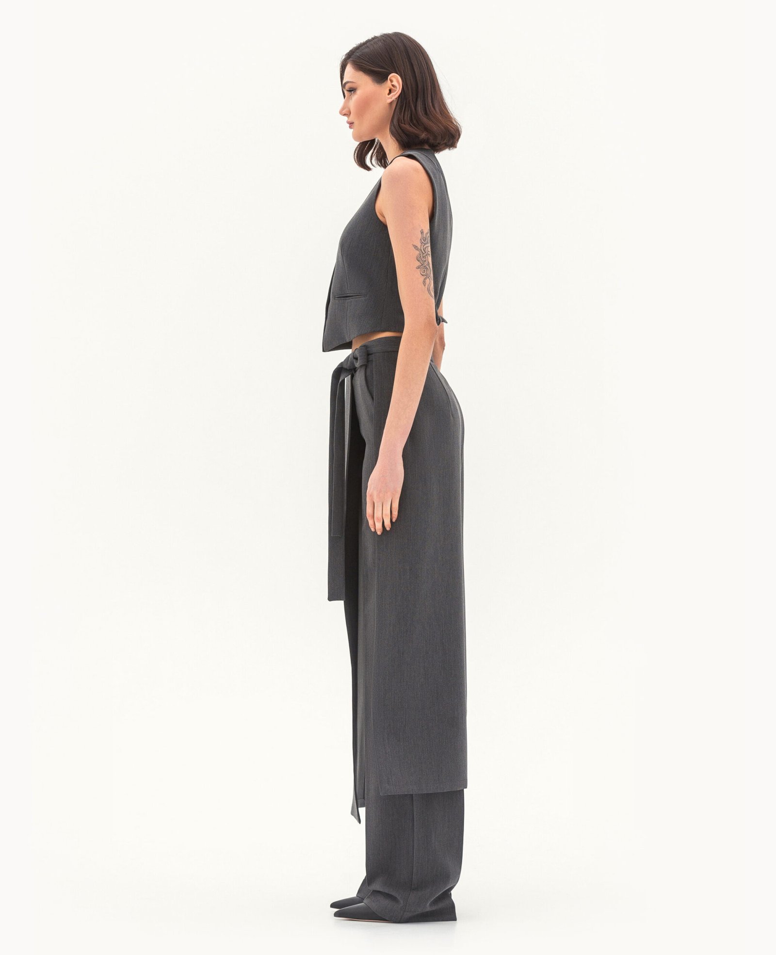 Вид виробу: потрійний комплект, що складається з жилета на ґудзиках, прямих штанів та спідниці-пояса з відлітними деталями асиметричної довжини.