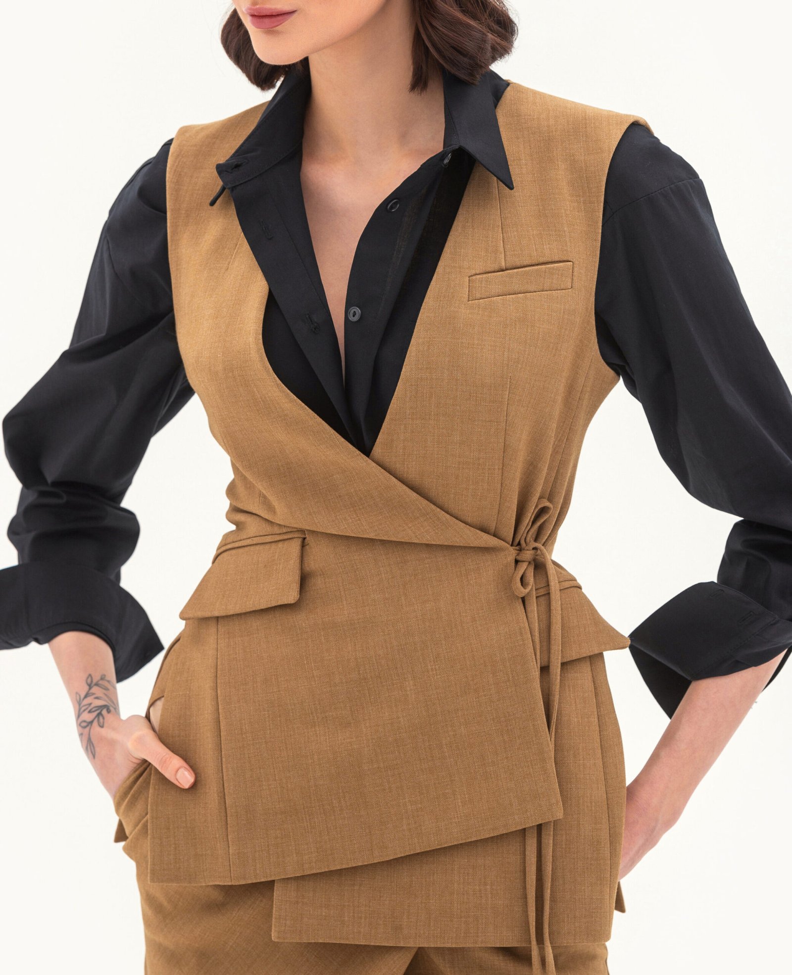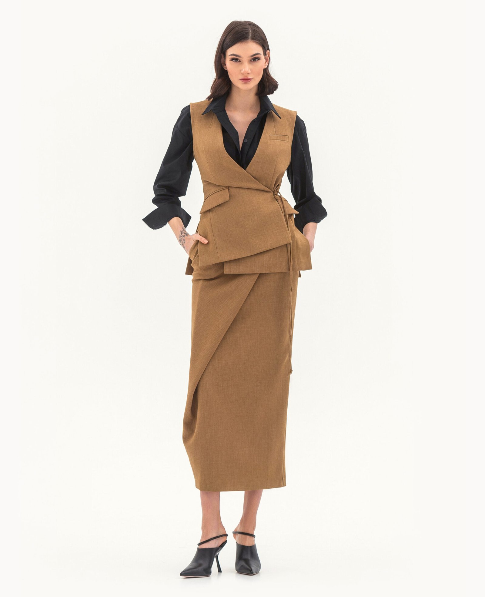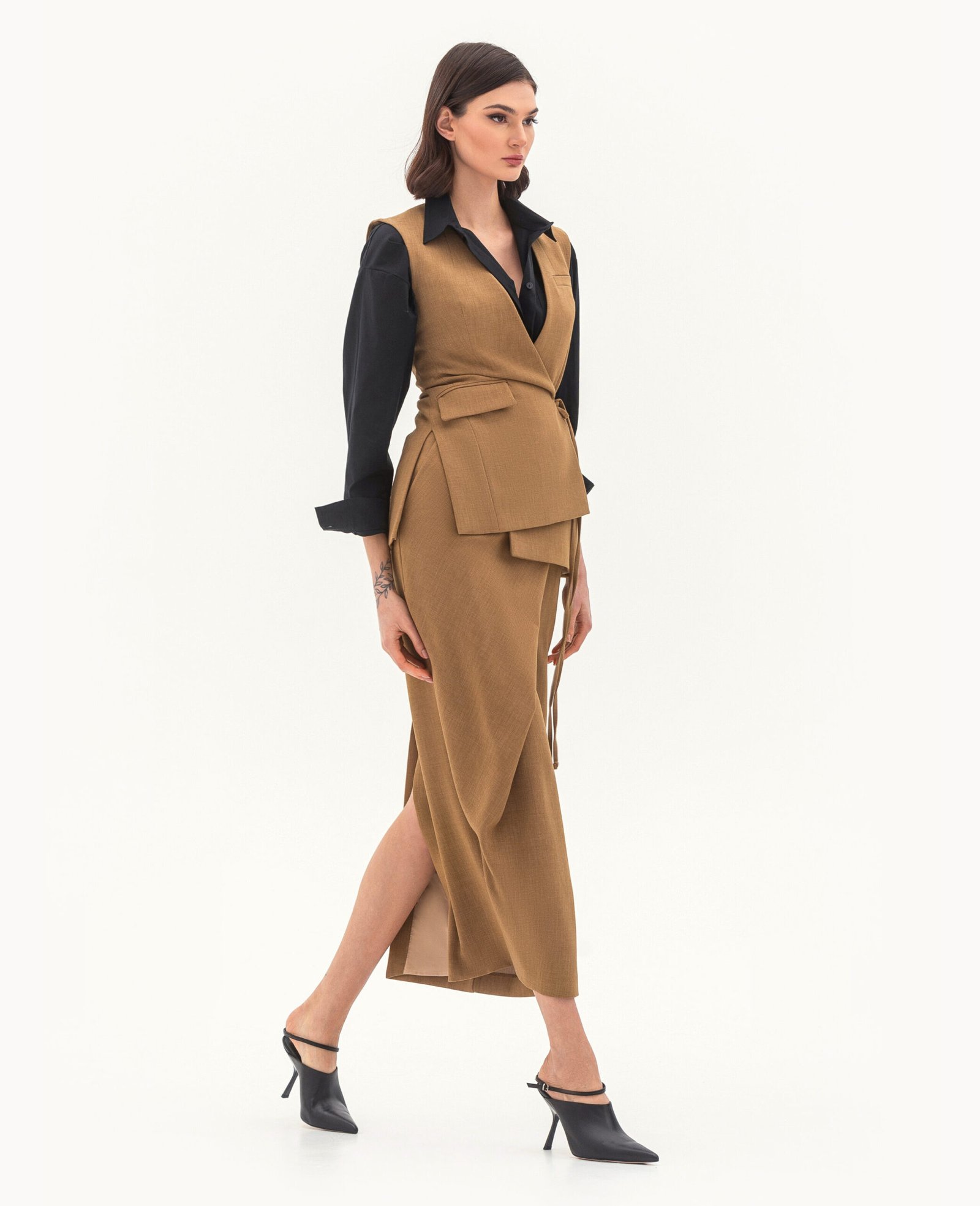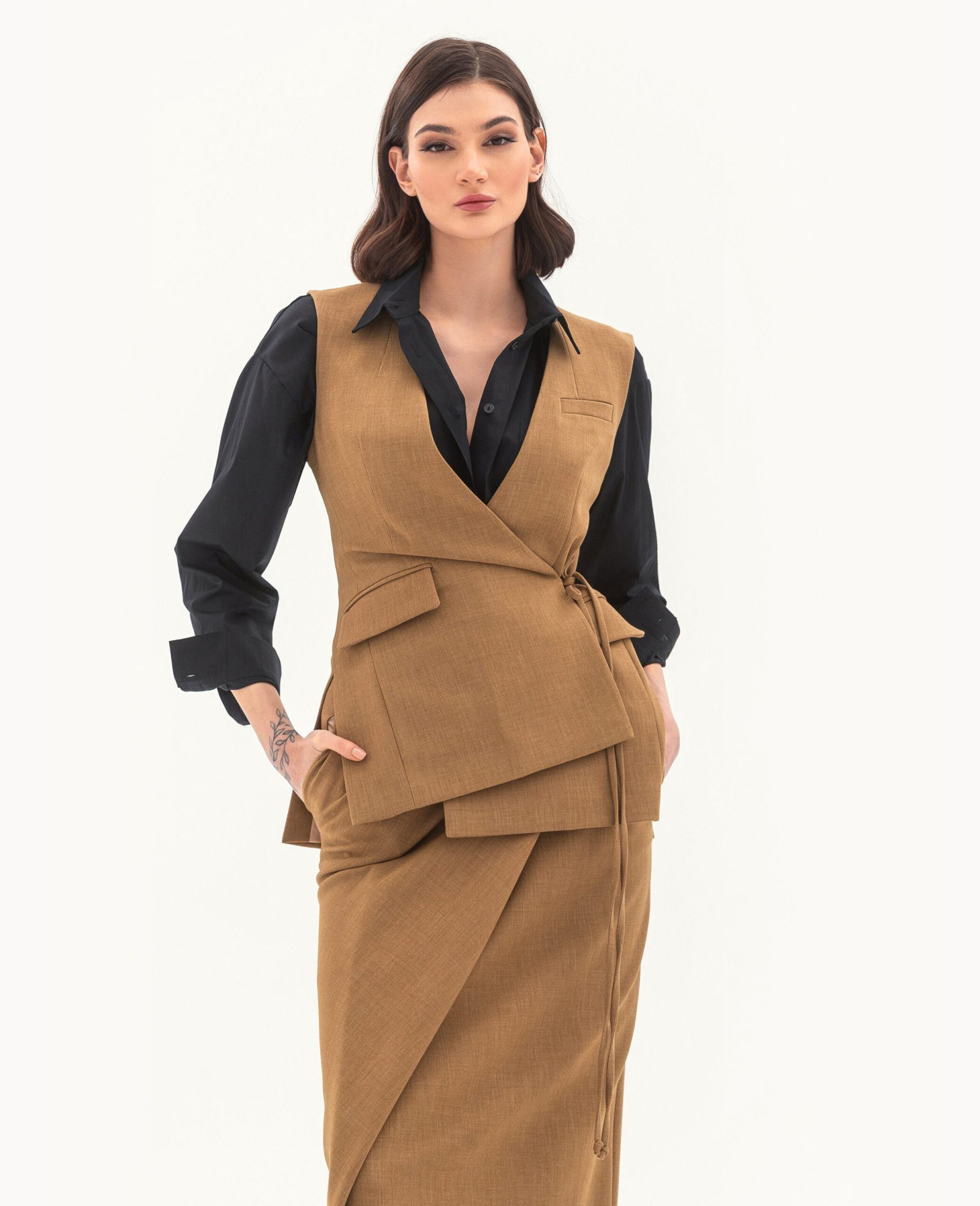 Вид виробу: комплект, що складається з подовженого жилета з асиметричними деталями на зав'язках-шнурках та розрізами по бокових швах, а також спідниці з акцентною деталлю.