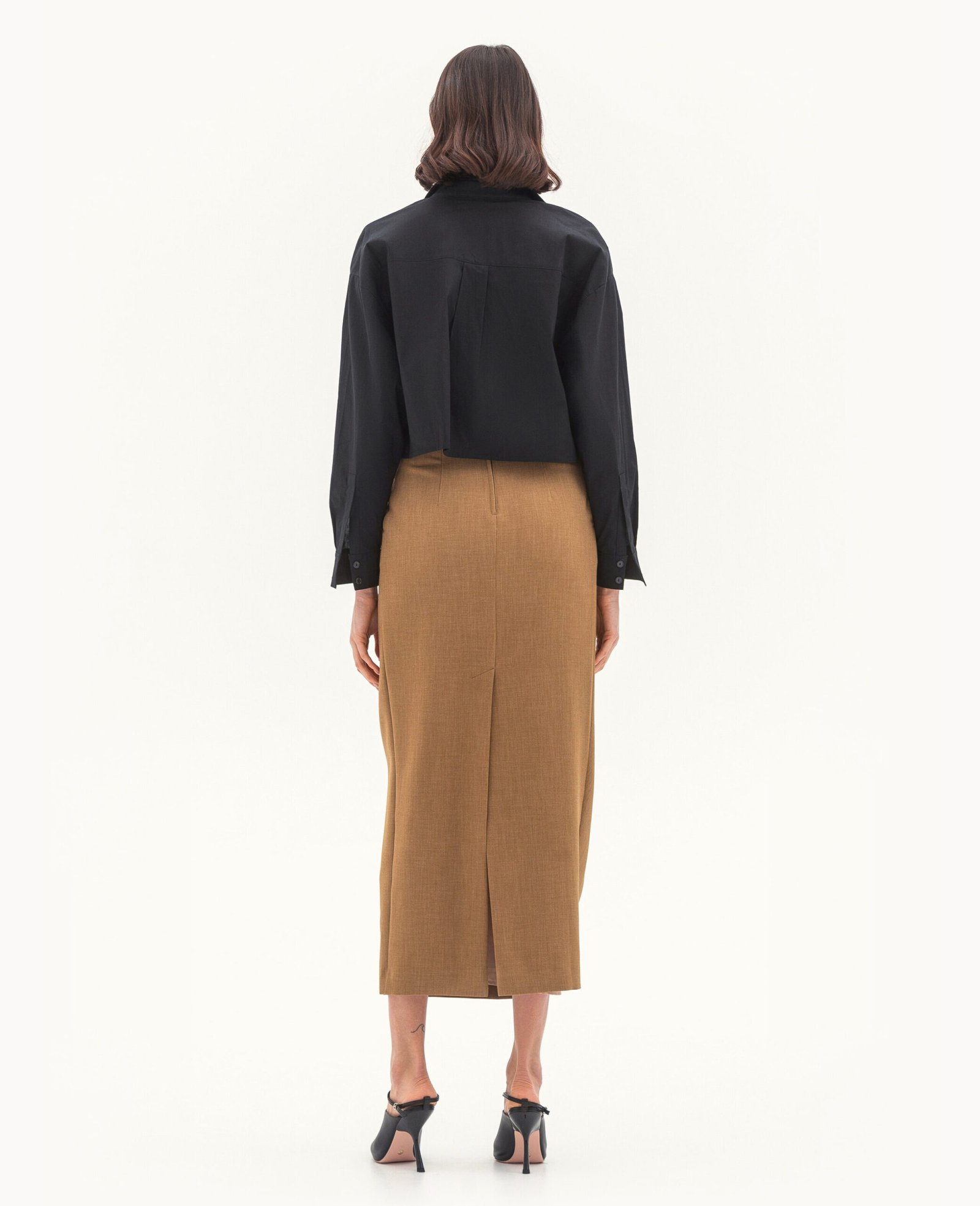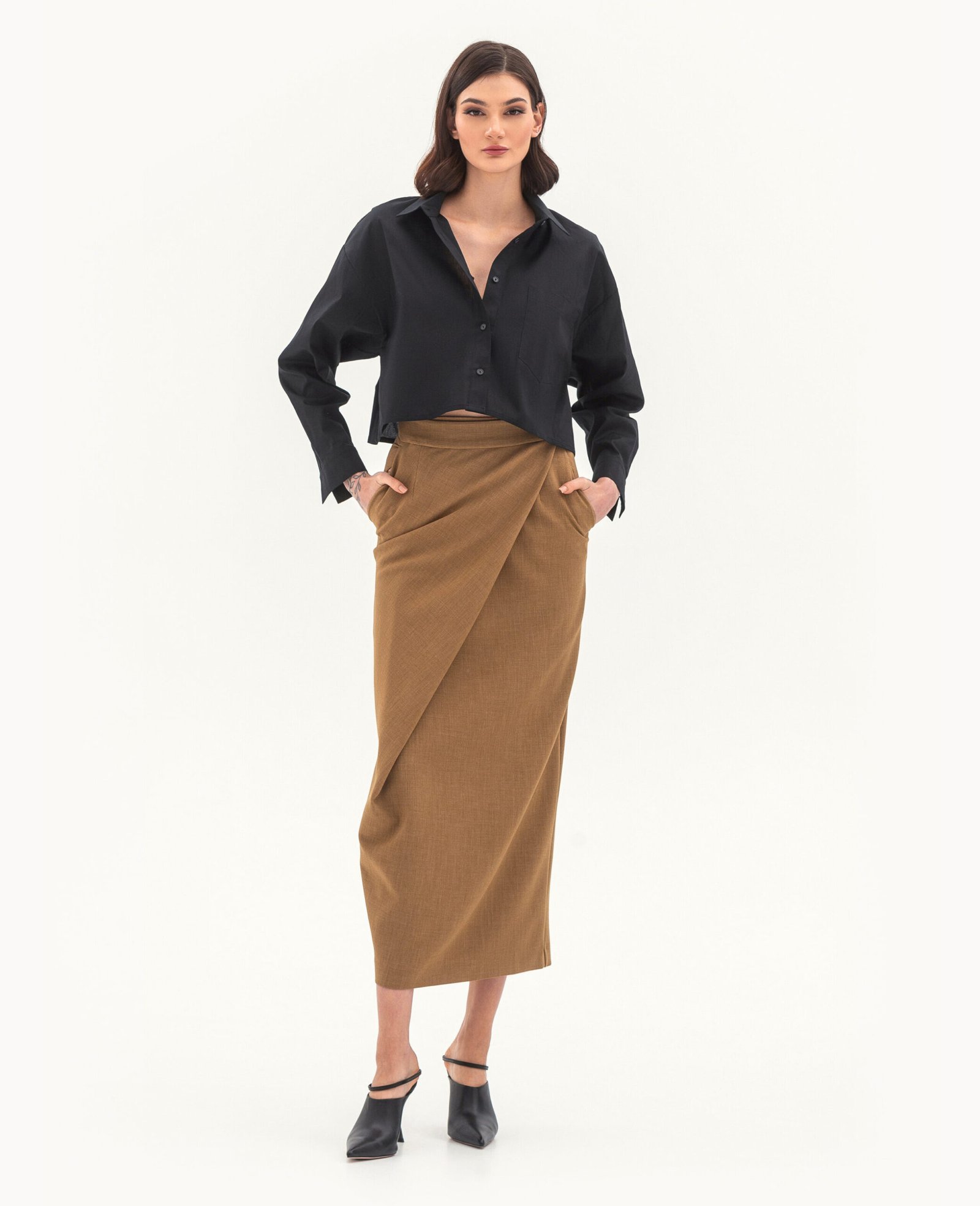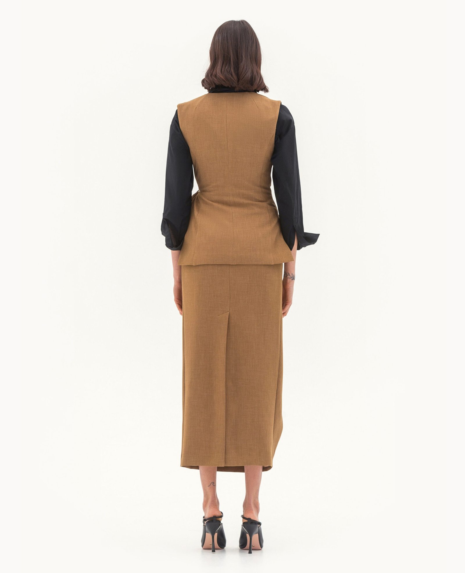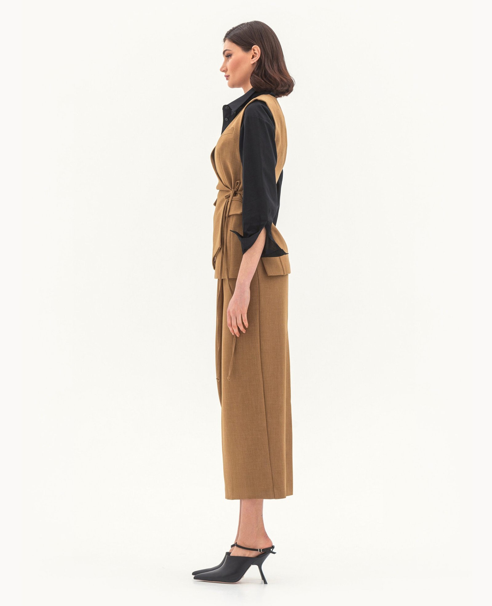 Вид виробу: комплект, що складається з подовженого жилета з асиметричними деталями на зав'язках-шнурках та розрізами по бокових швах, а також спідниці з акцентною деталлю.