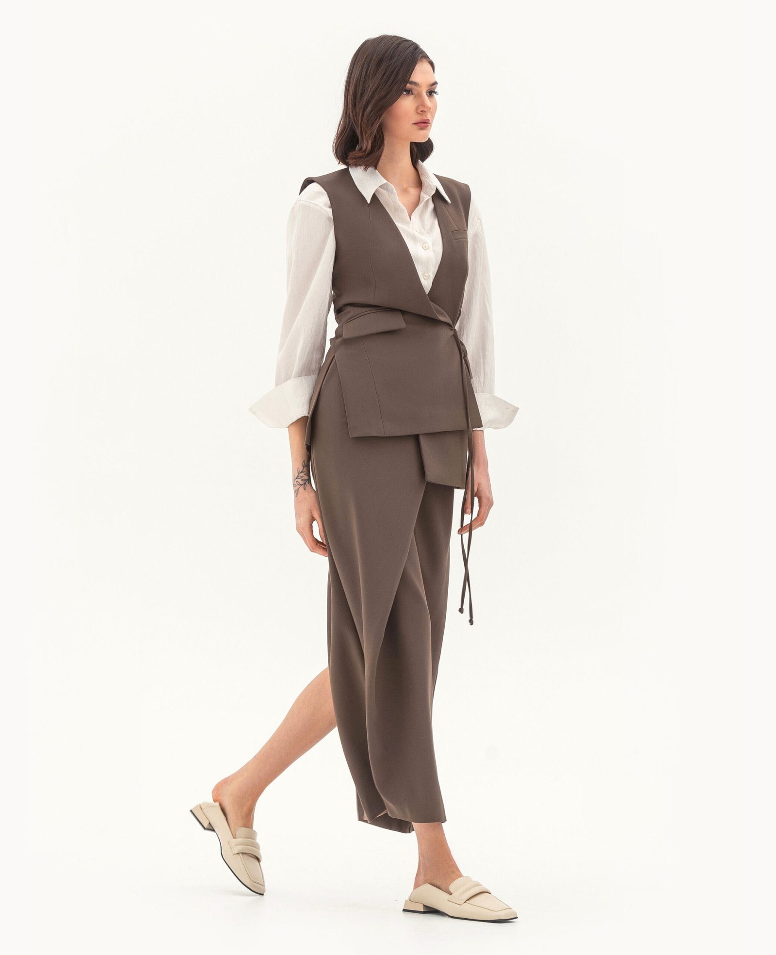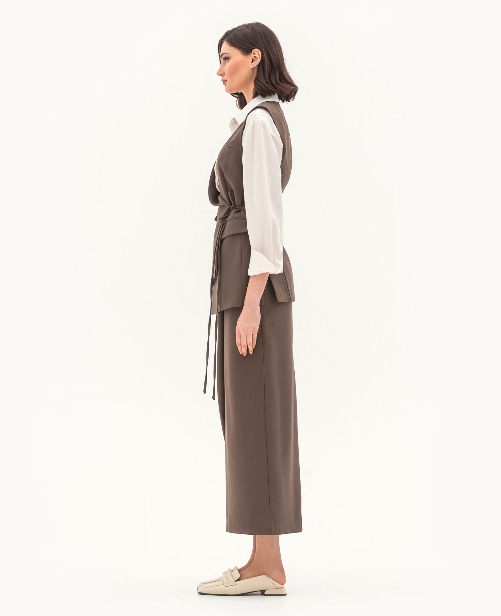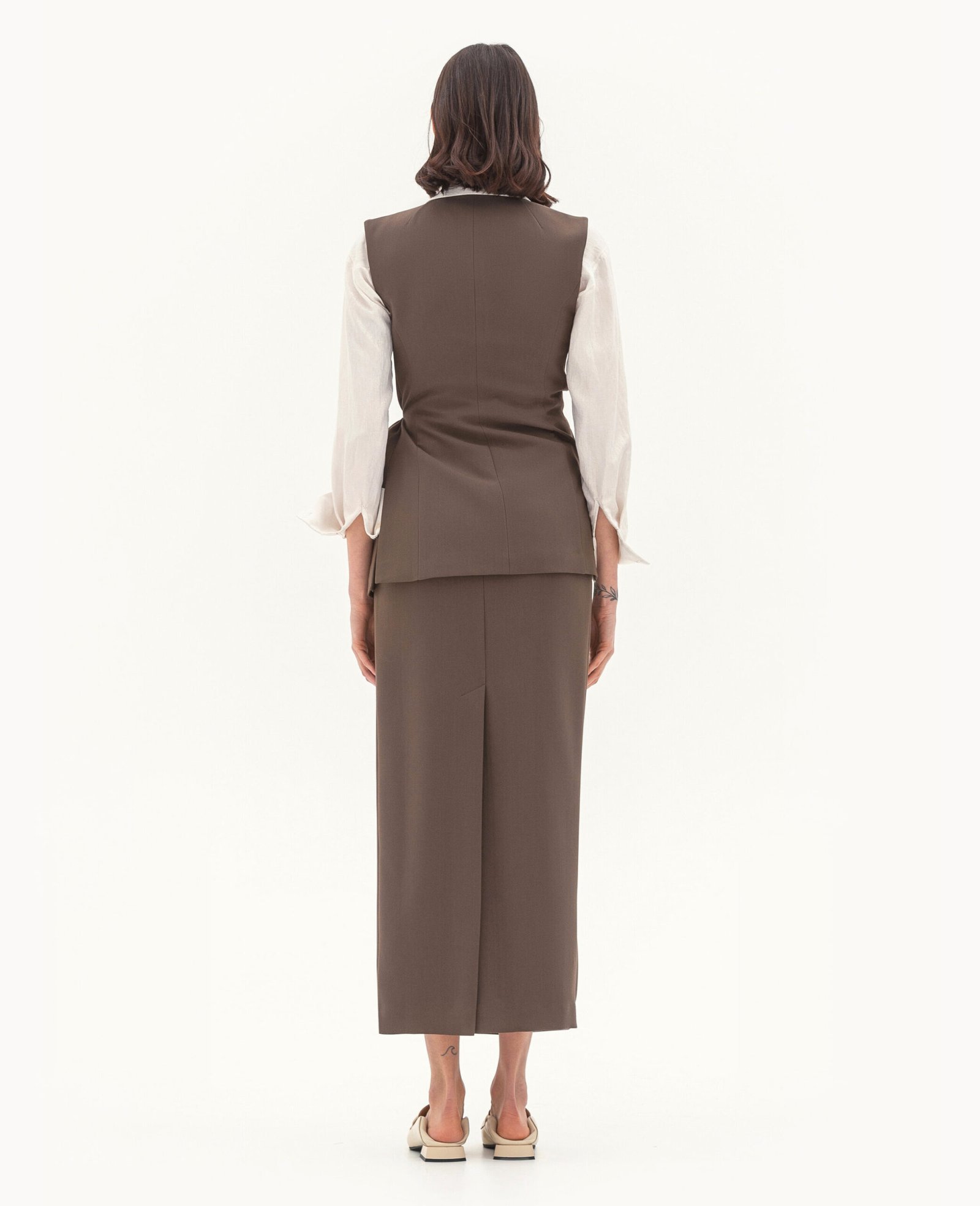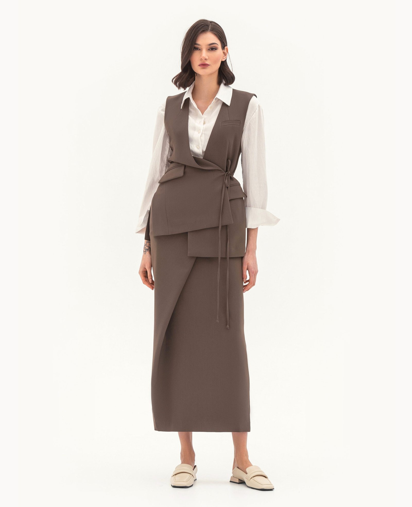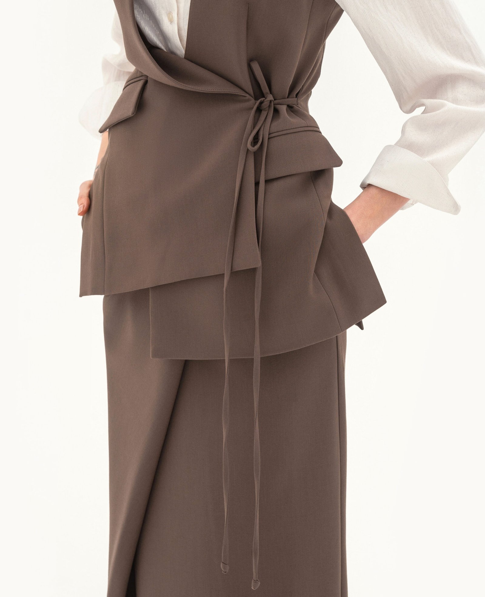 Вид виробу: комплект, що складається з подовженого жилета з асиметричними деталями на зав'язках-шнурках та розрізами по бокових швах, а також спідниці з акцентною деталлю.