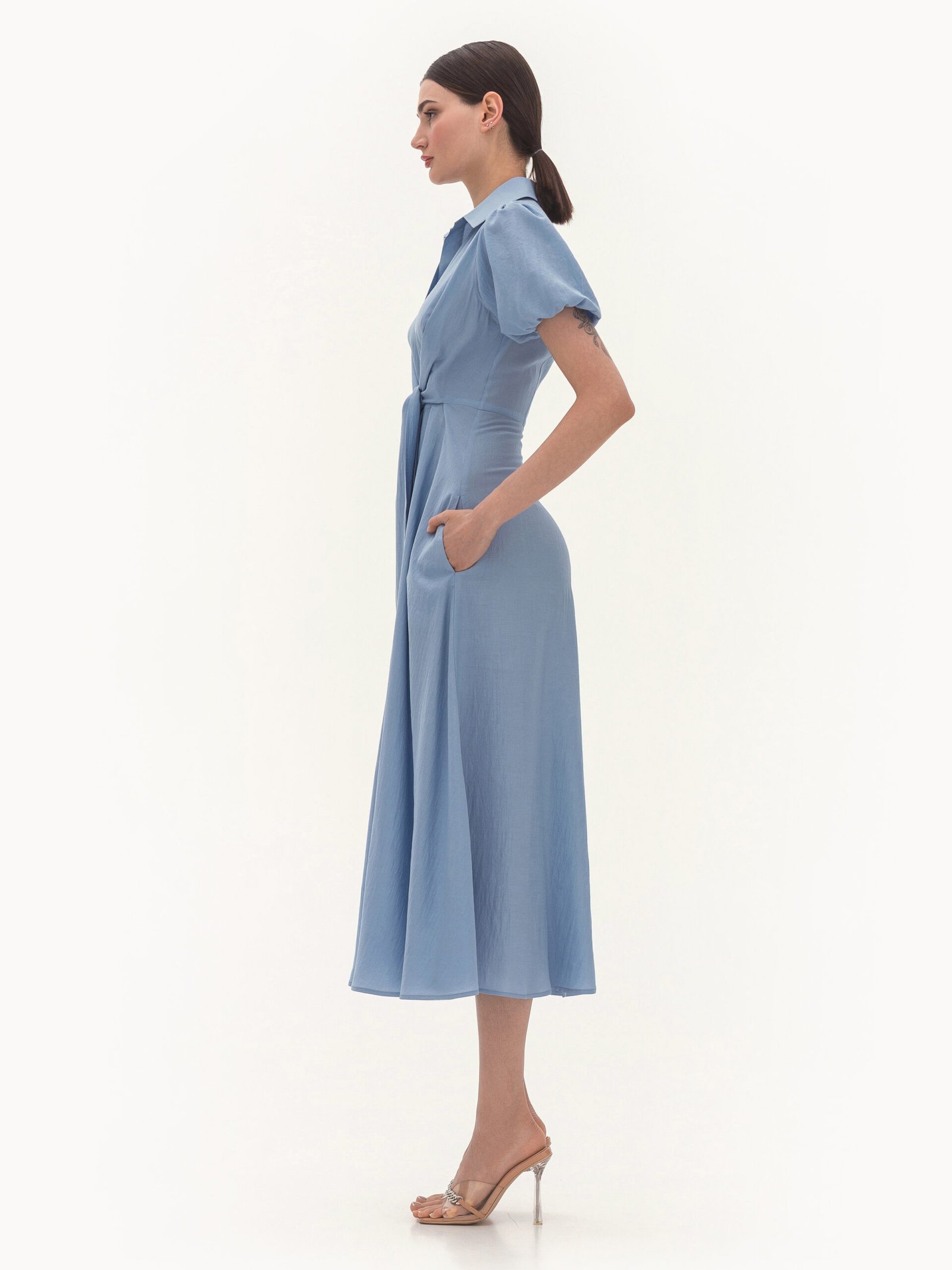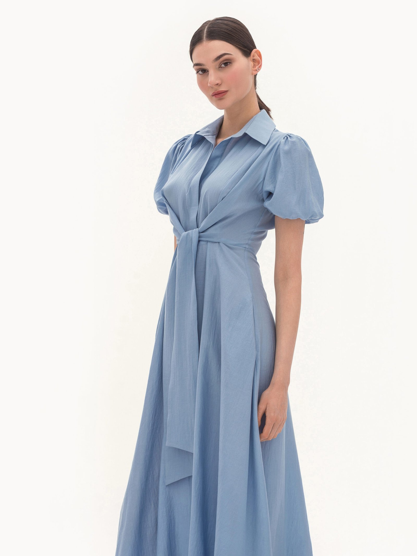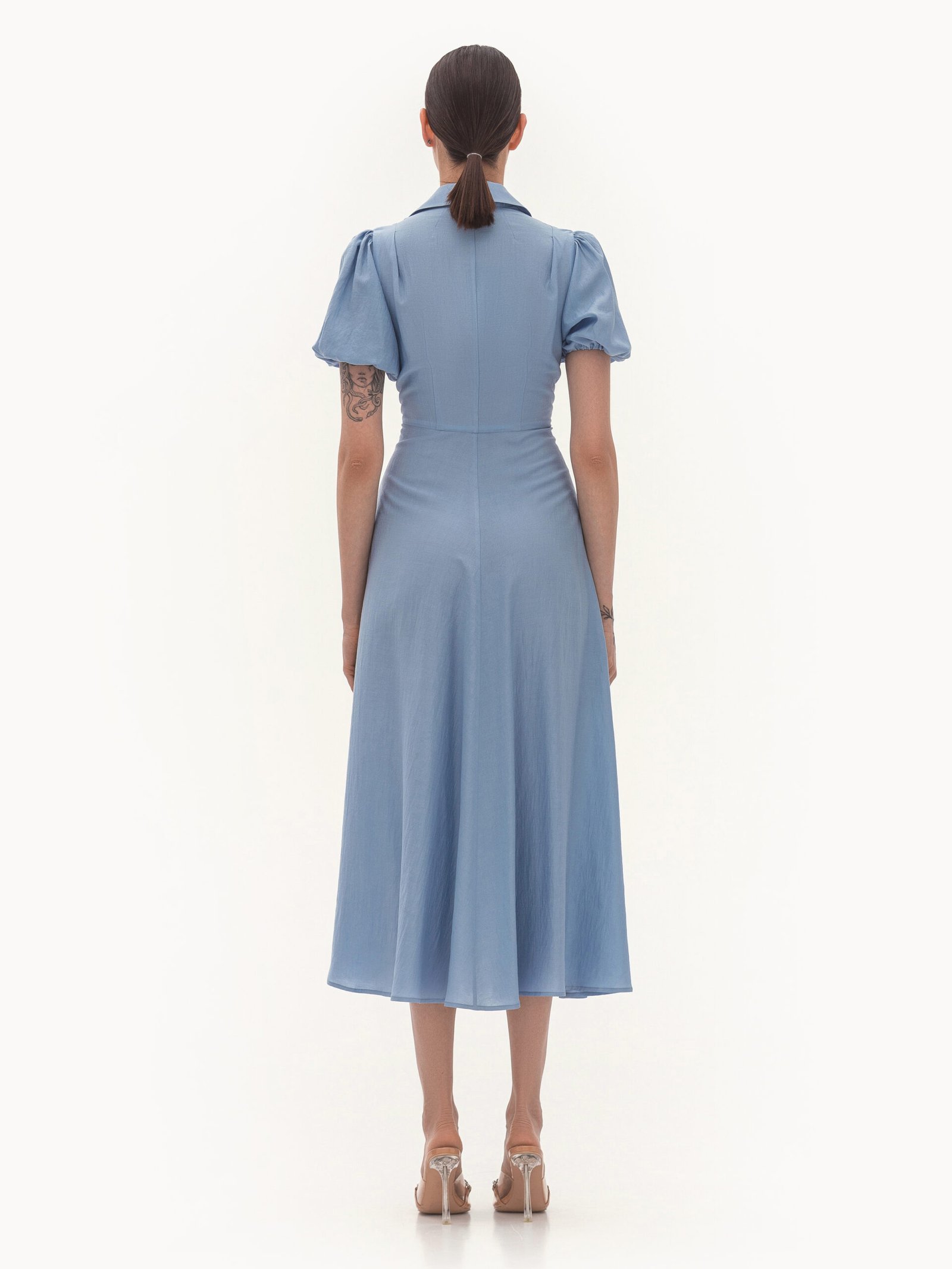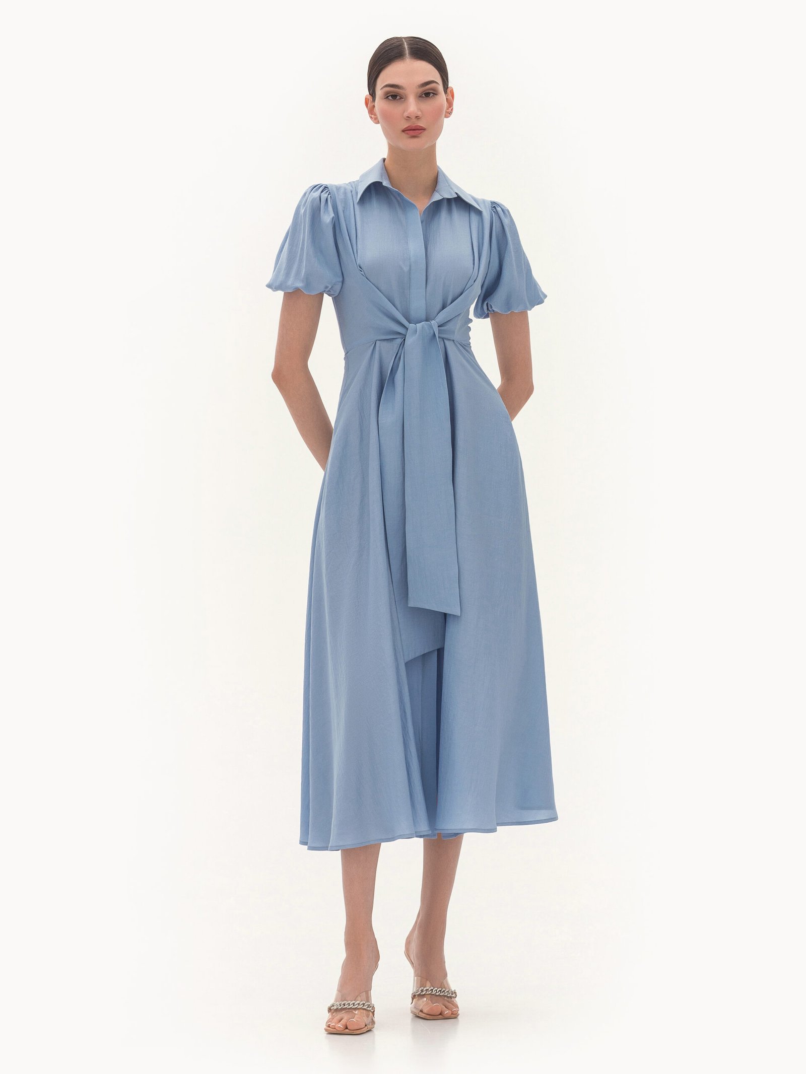 Вид виробу: розкльошена сукня з коміром, акцентними рукавами на резинці по низу, застібкою застібкою і поясами-зав'язками, що регулюють лінію талії.