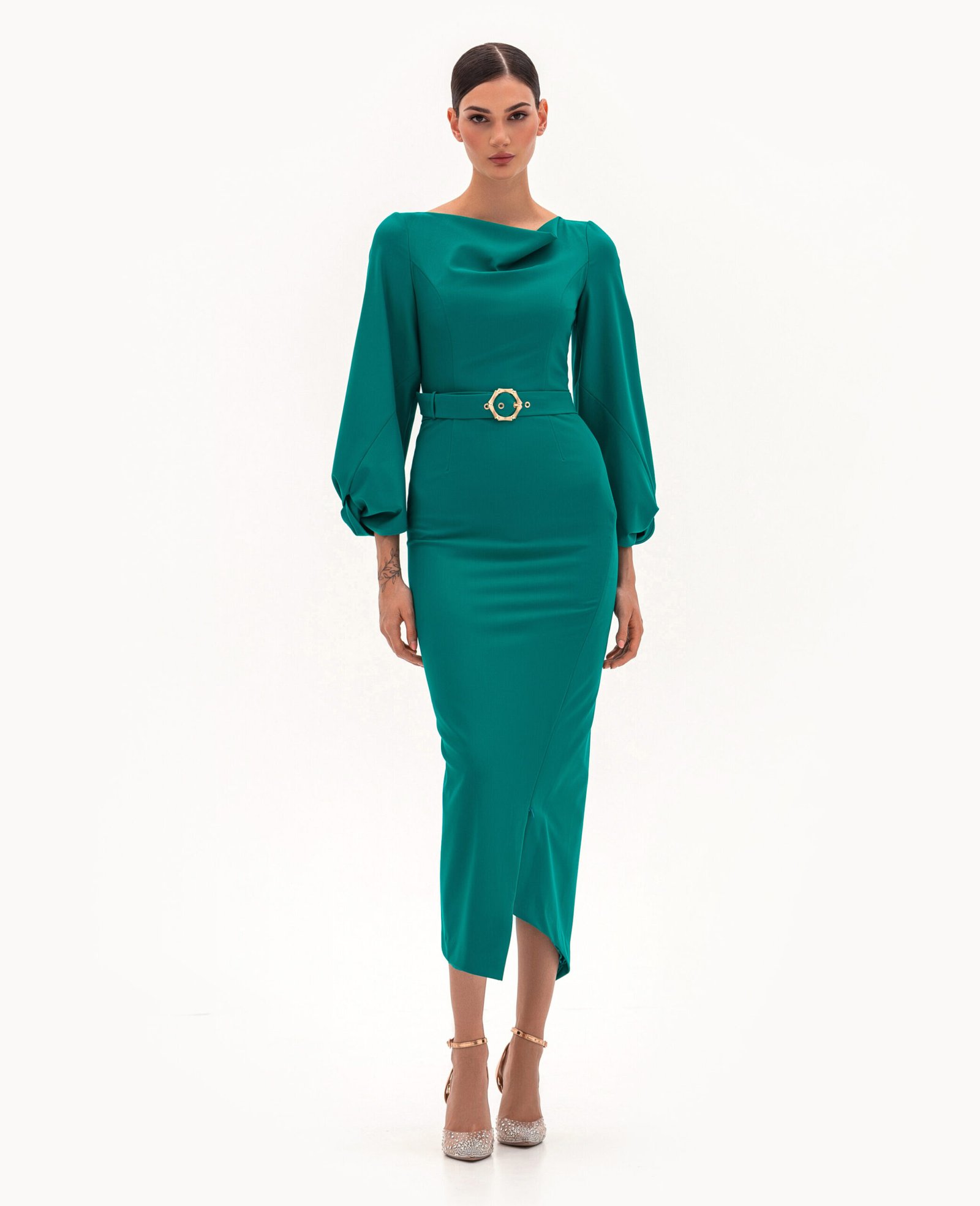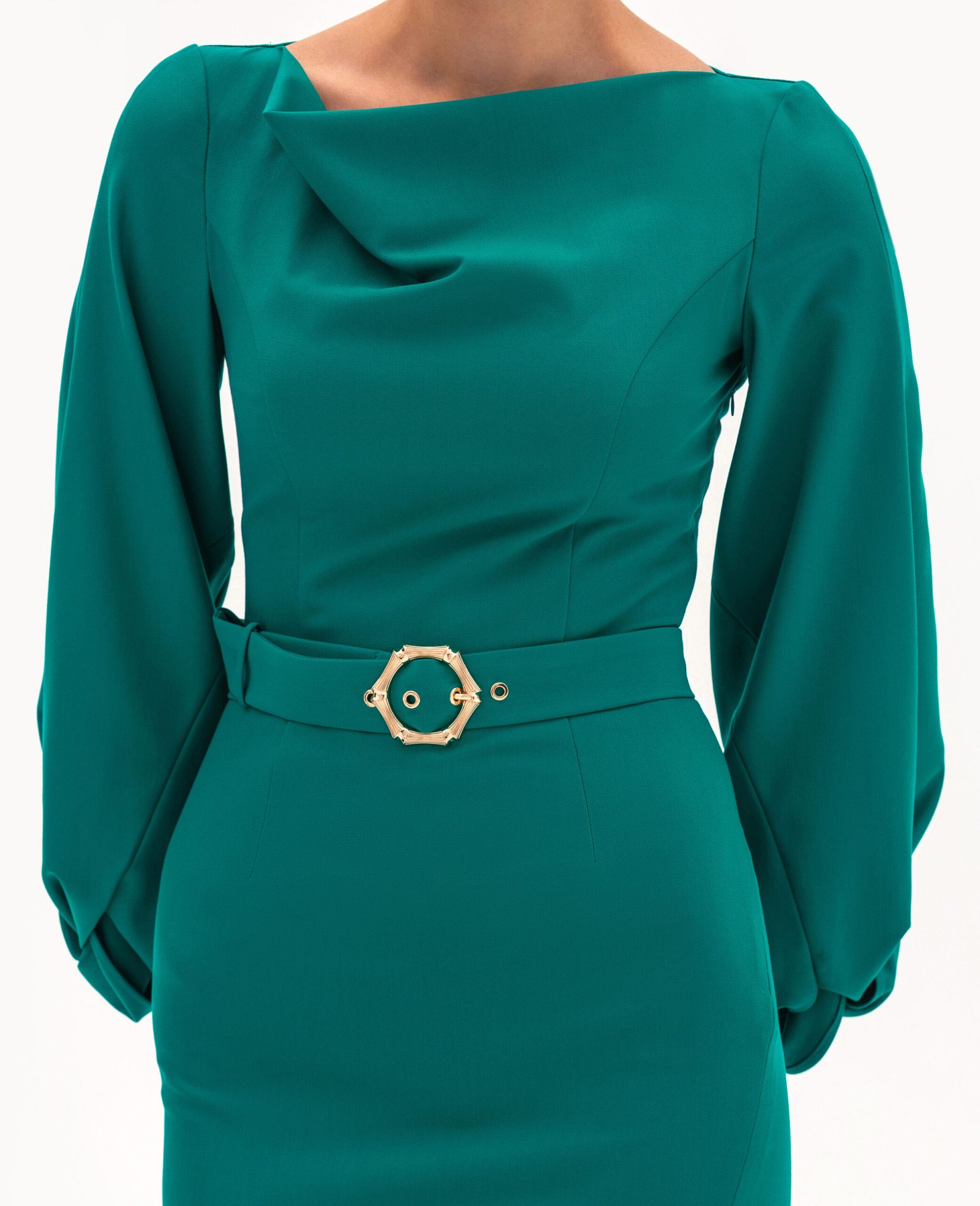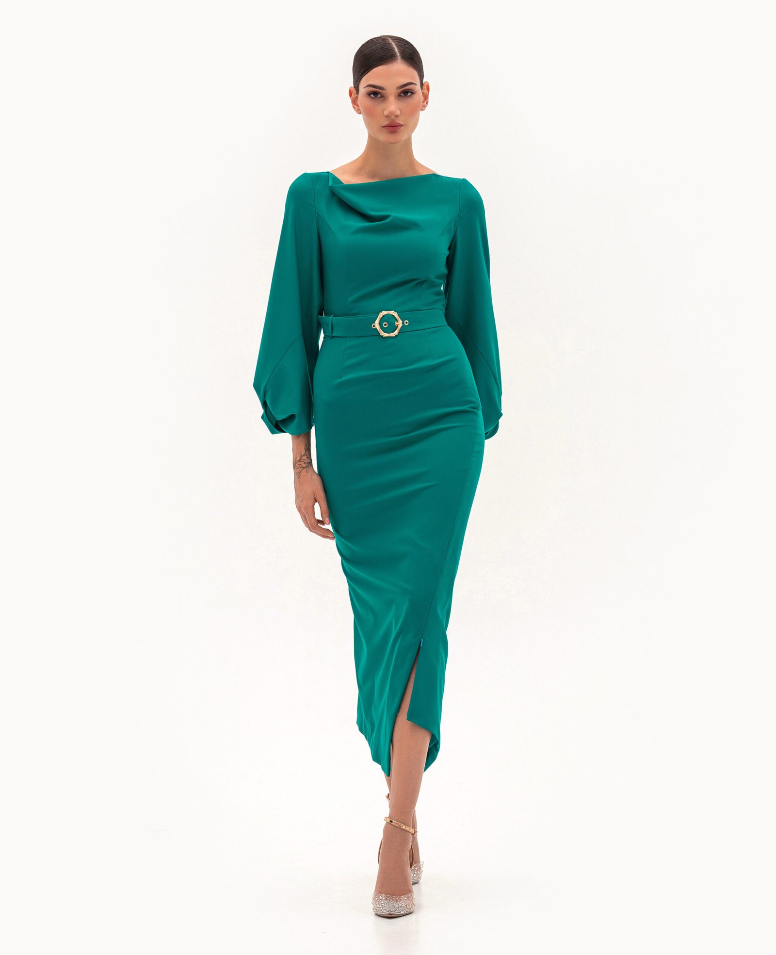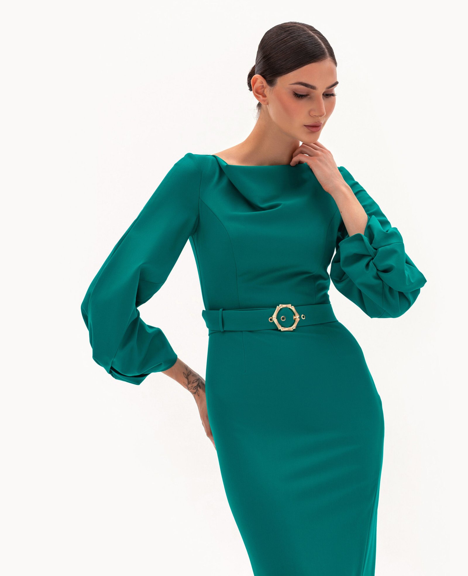 Вид виробу: пряма сукня з акцентованою лінією талії, декоративними елементами по рукаву, поясом знімним з металевою фурнітурою і функціональною блискавкою по низу.