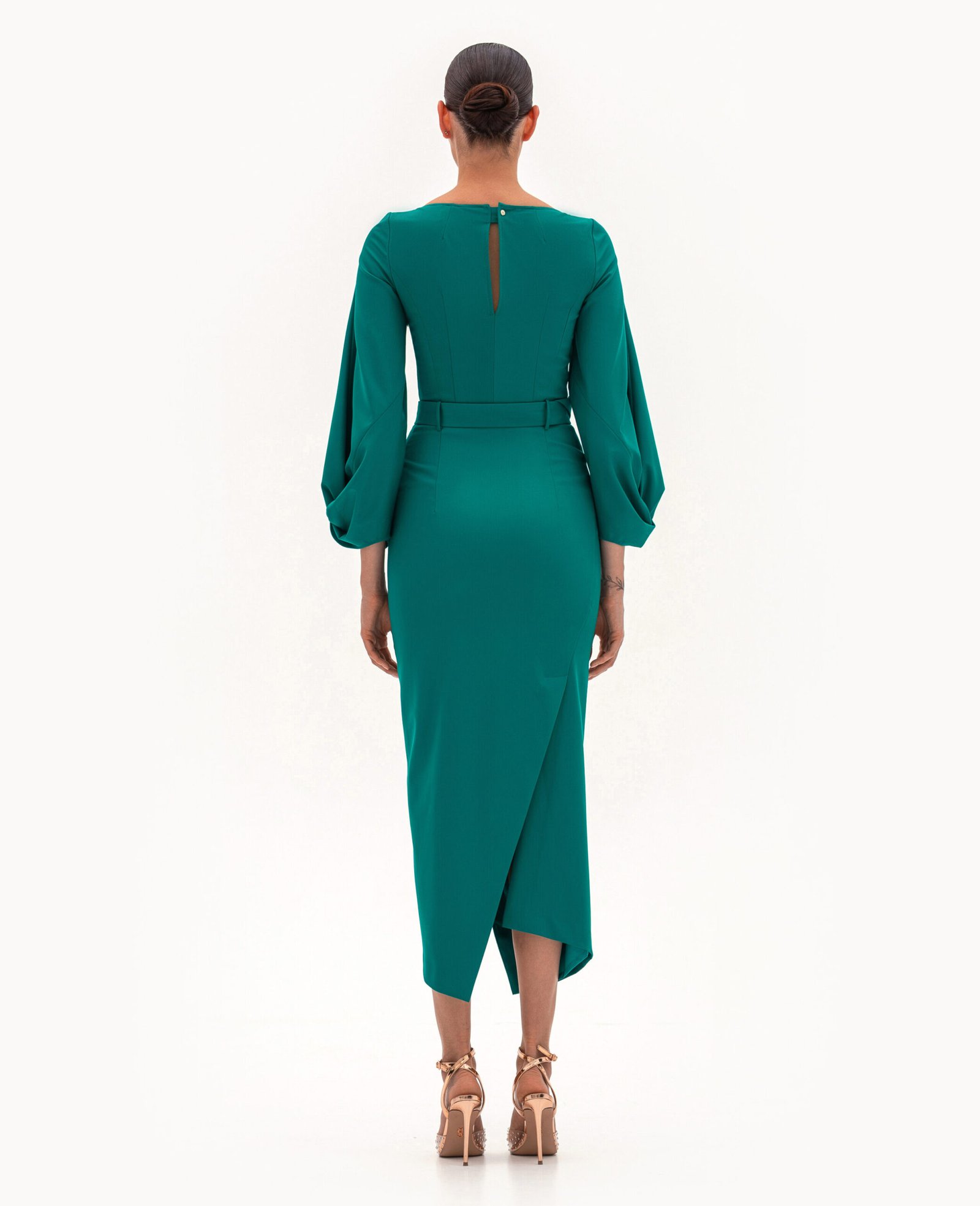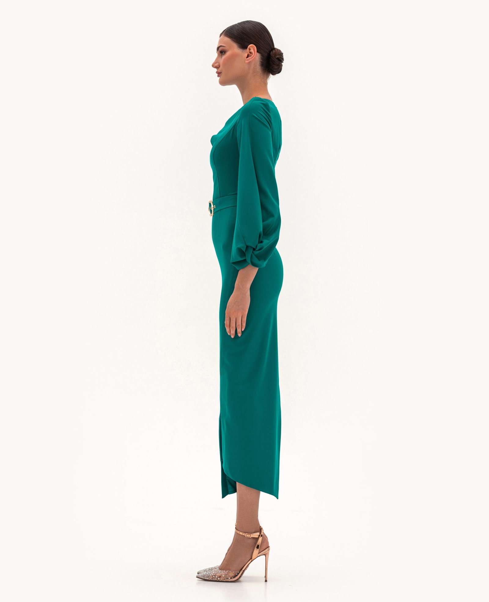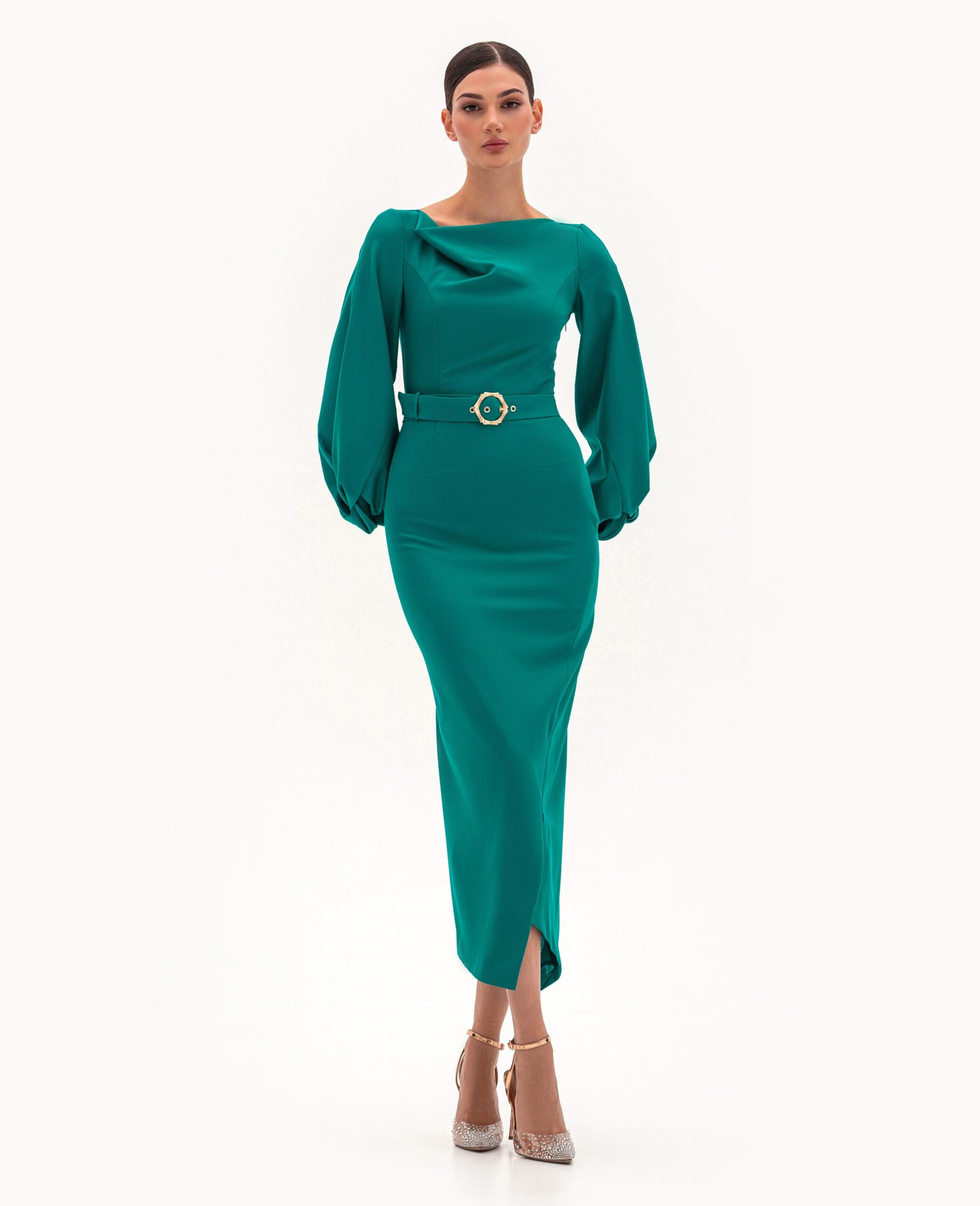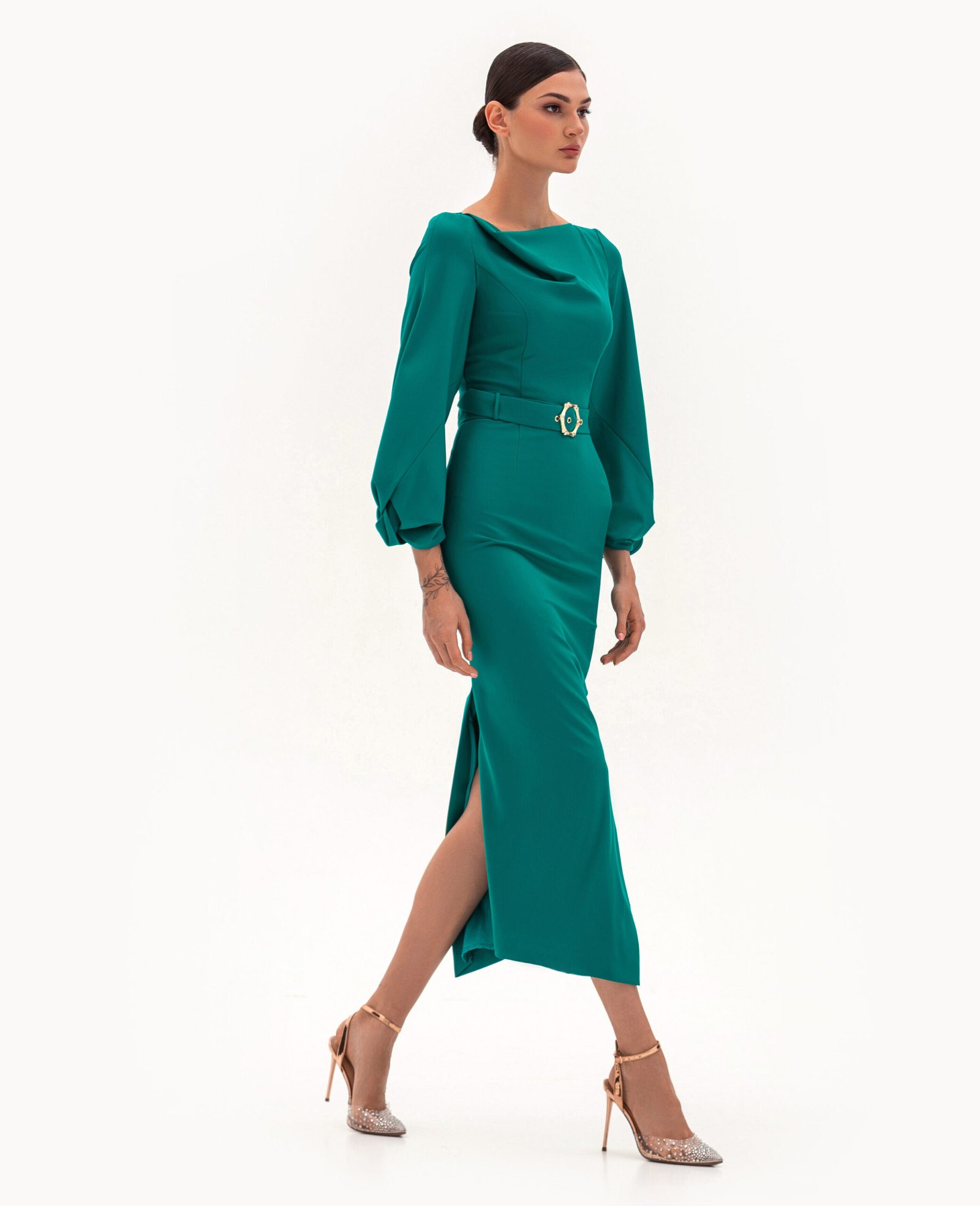 Вид виробу: пряма сукня з акцентованою лінією талії, декоративними елементами по рукаву, поясом знімним з металевою фурнітурою і функціональною блискавкою по низу.
